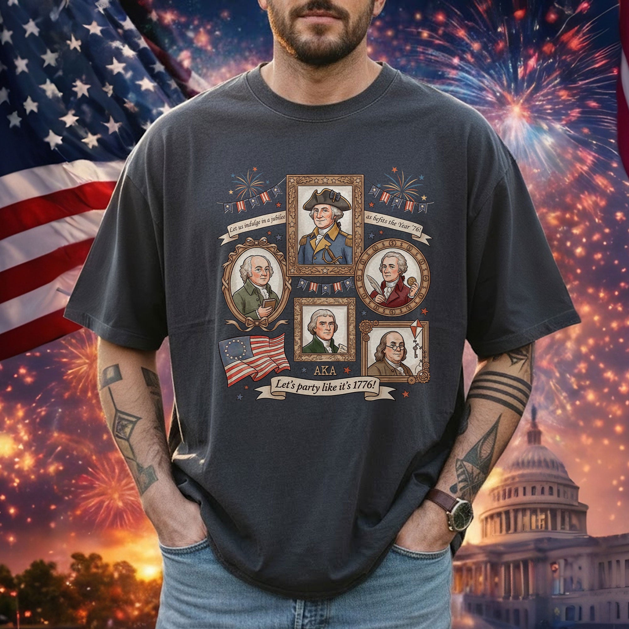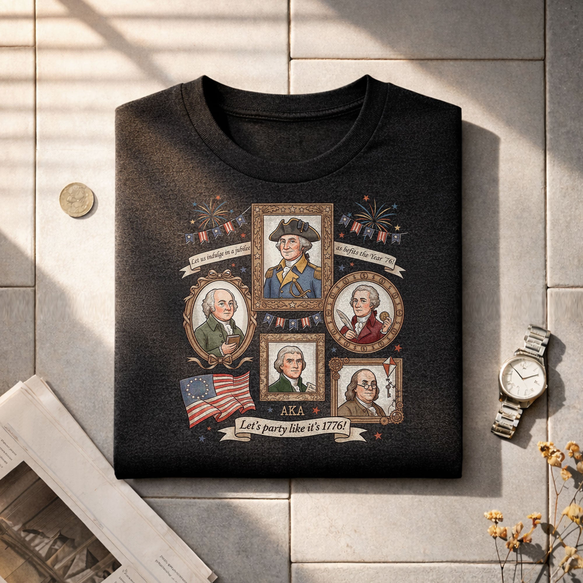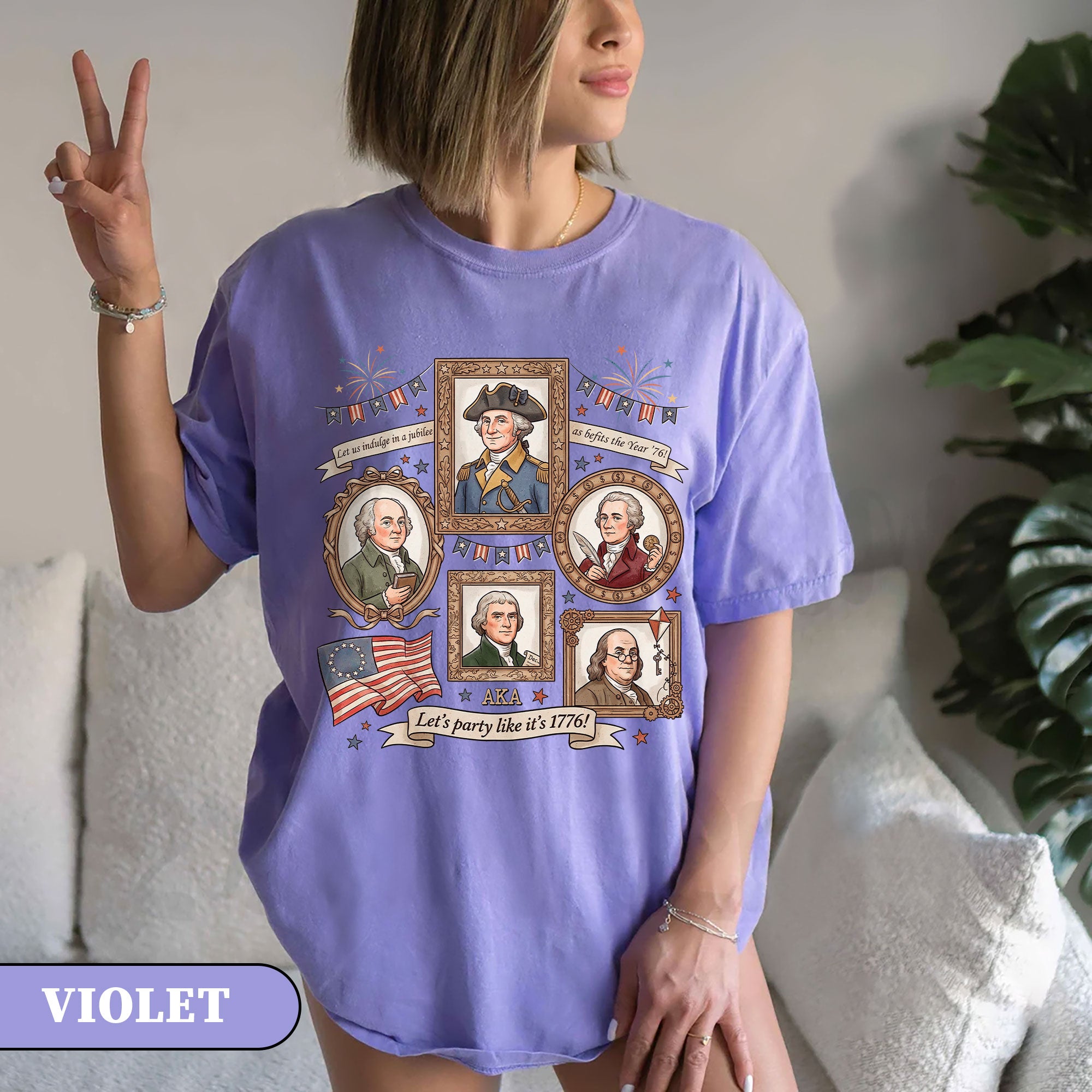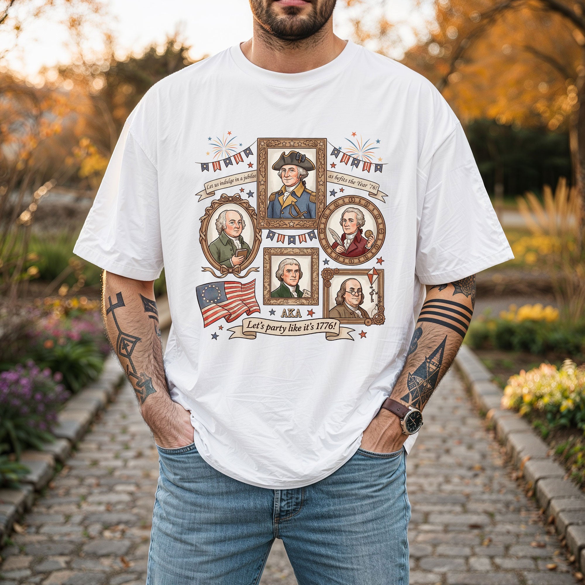 Celebrate American independence with this vintage-style 1776 Founding Fathers T-shirt. Featuring a retro graphic design inspired by the revolutionary spirit of 1776, this patriotic shirt captures the essence of USA history and the bold declaration of freedom. Crafted from soft, breathable cotton for all-day comfort, it’s ideal for history enthusiasts, Fourth of July celebrations, Memorial Day events, or casual wear that shows your patriotic pride. The ‘Let’s Party Like It’s 1776′ slogan adds a fun, historical twist perfect for barbecues, parades, or everyday expression of American heritage. Available in multiple sizes for men, this durable T-shirt maintains its vibrant colors wash after wash. Embrace the founding fathers’ legacy and wear your love for the USA with style.