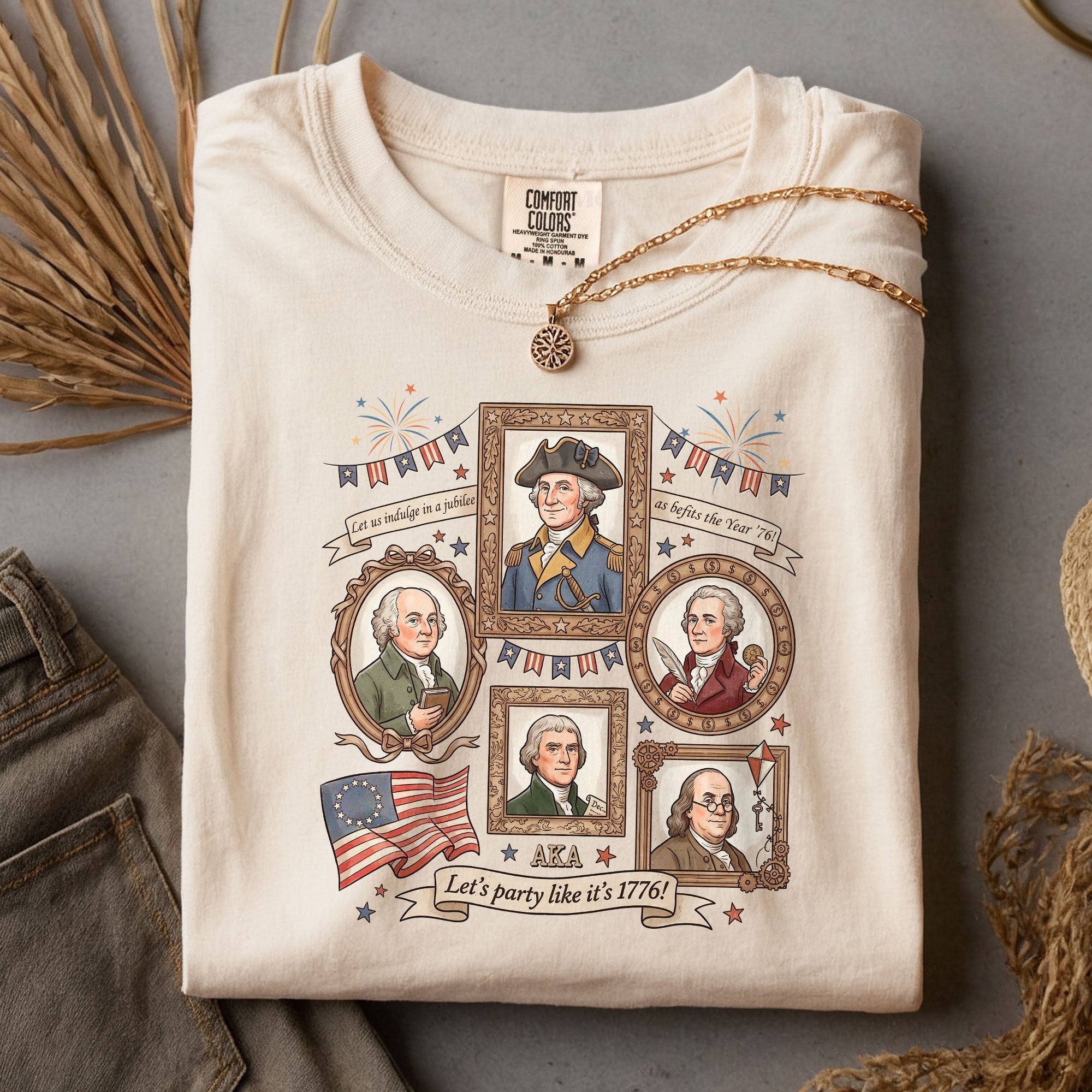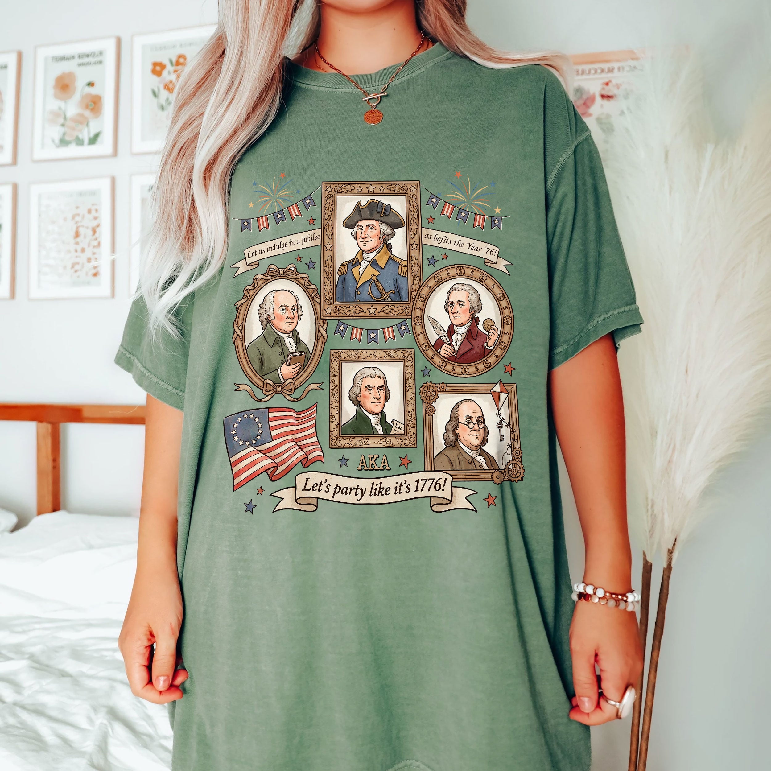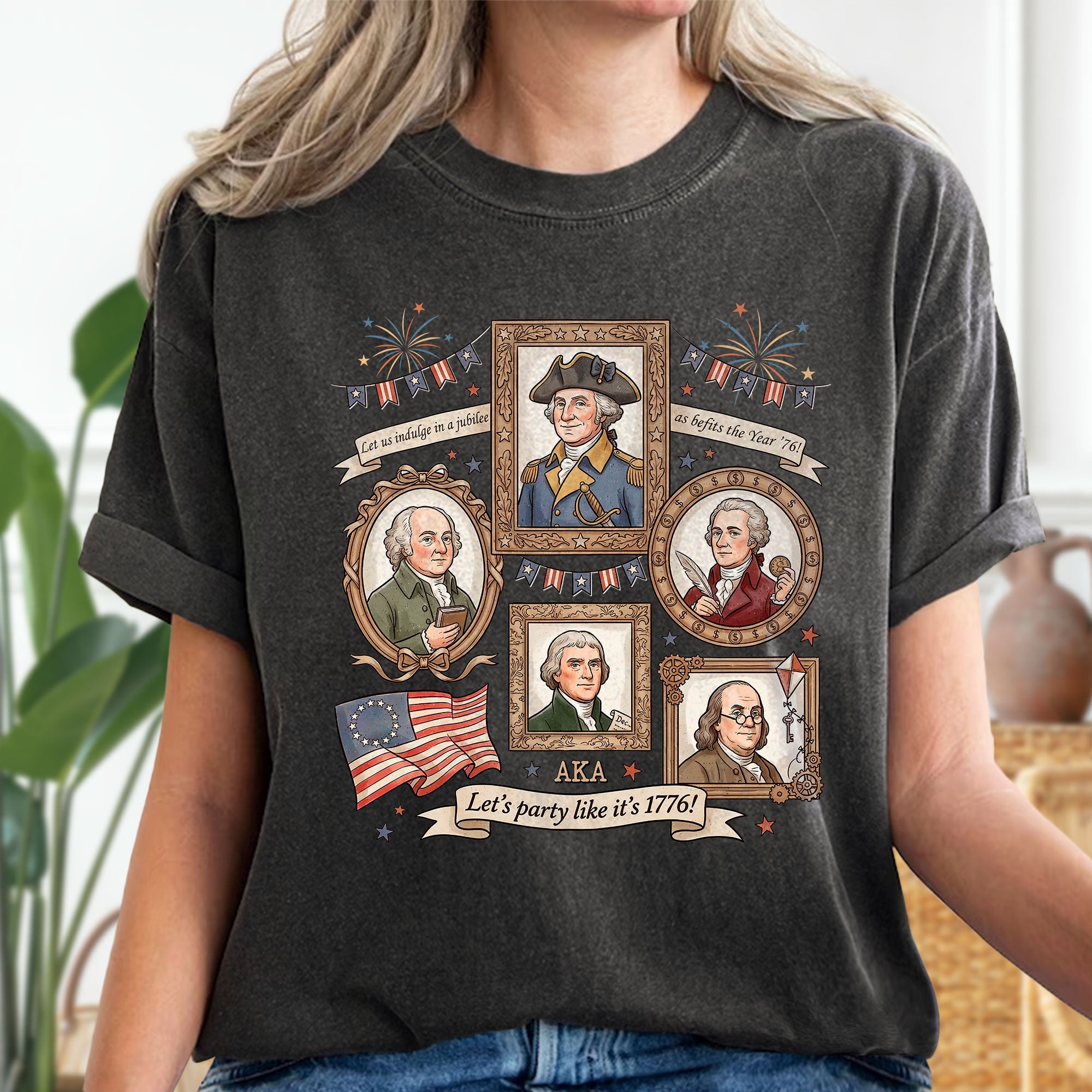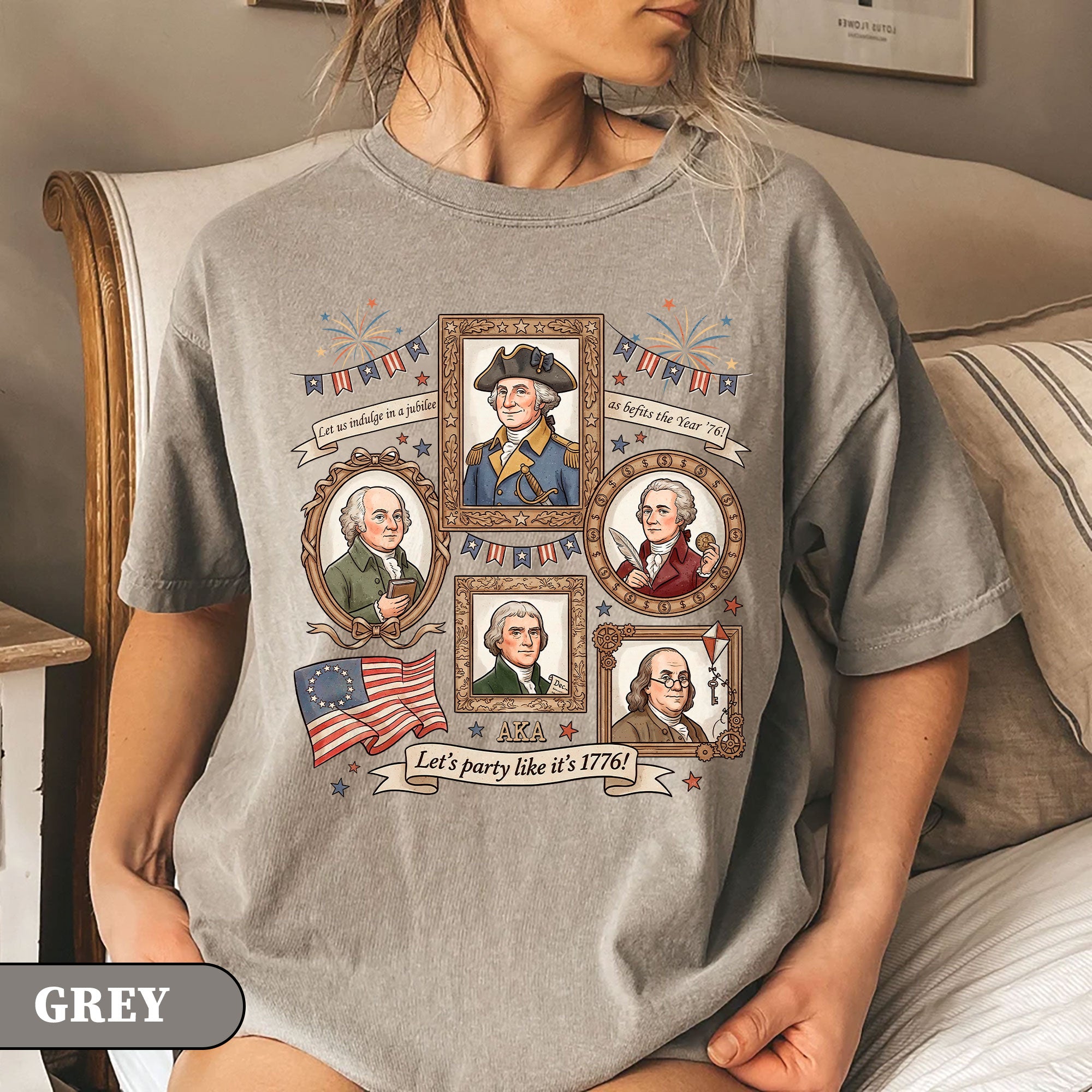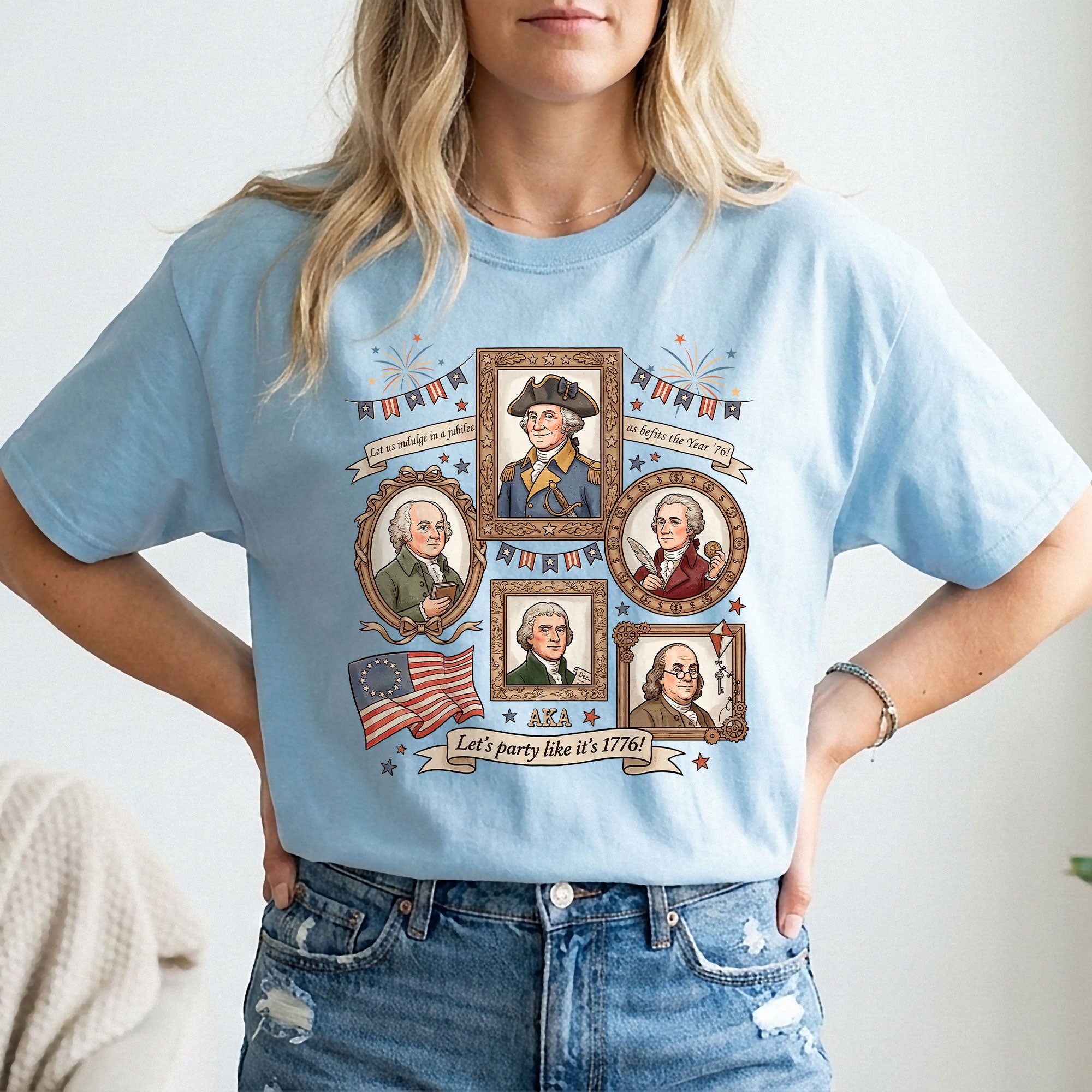 Celebrate American independence with this vintage-style 1776 Founding Fathers T-shirt. Featuring a retro graphic design inspired by the revolutionary spirit of 1776, this patriotic shirt captures the essence of USA history and the bold declaration of freedom. Crafted from soft, breathable cotton for all-day comfort, it’s ideal for history enthusiasts, Fourth of July celebrations, Memorial Day events, or casual wear that shows your patriotic pride. The ‘Let’s Party Like It’s 1776′ slogan adds a fun, historical twist perfect for barbecues, parades, or everyday expression of American heritage. Available in multiple sizes for men, this durable T-shirt maintains its vibrant colors wash after wash. Embrace the founding fathers’ legacy and wear your love for the USA with style.