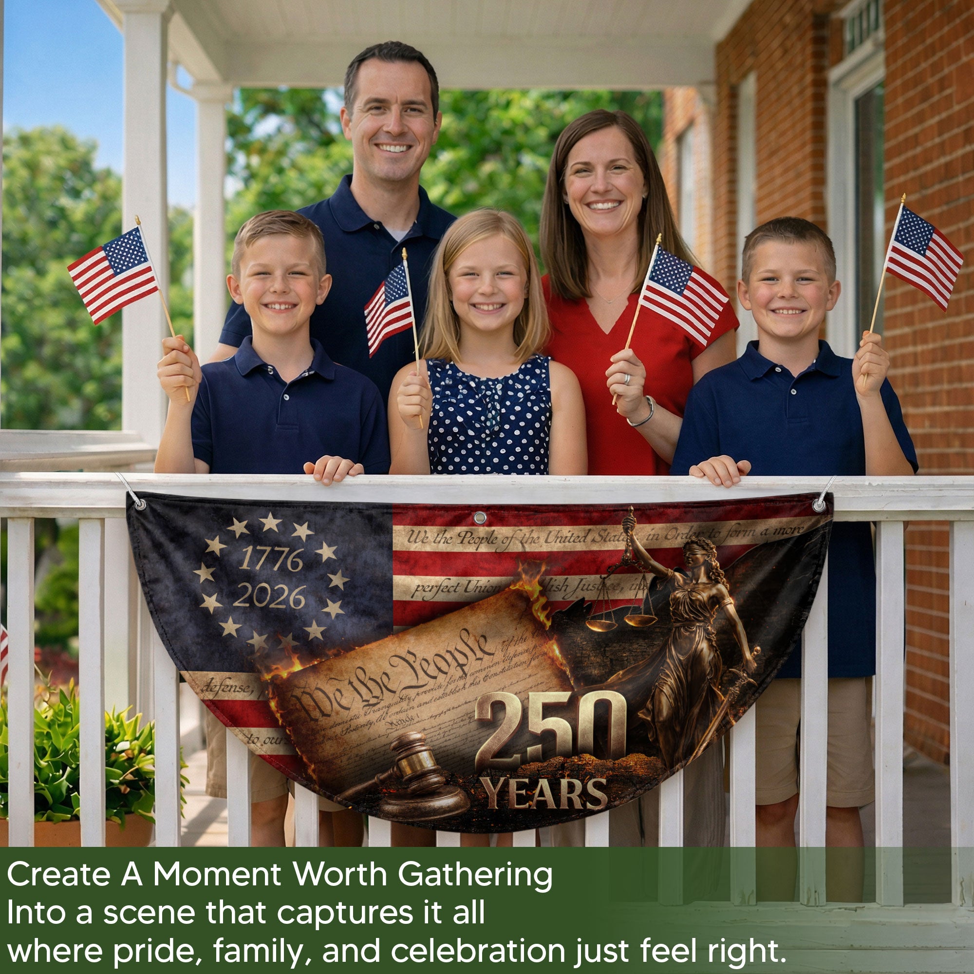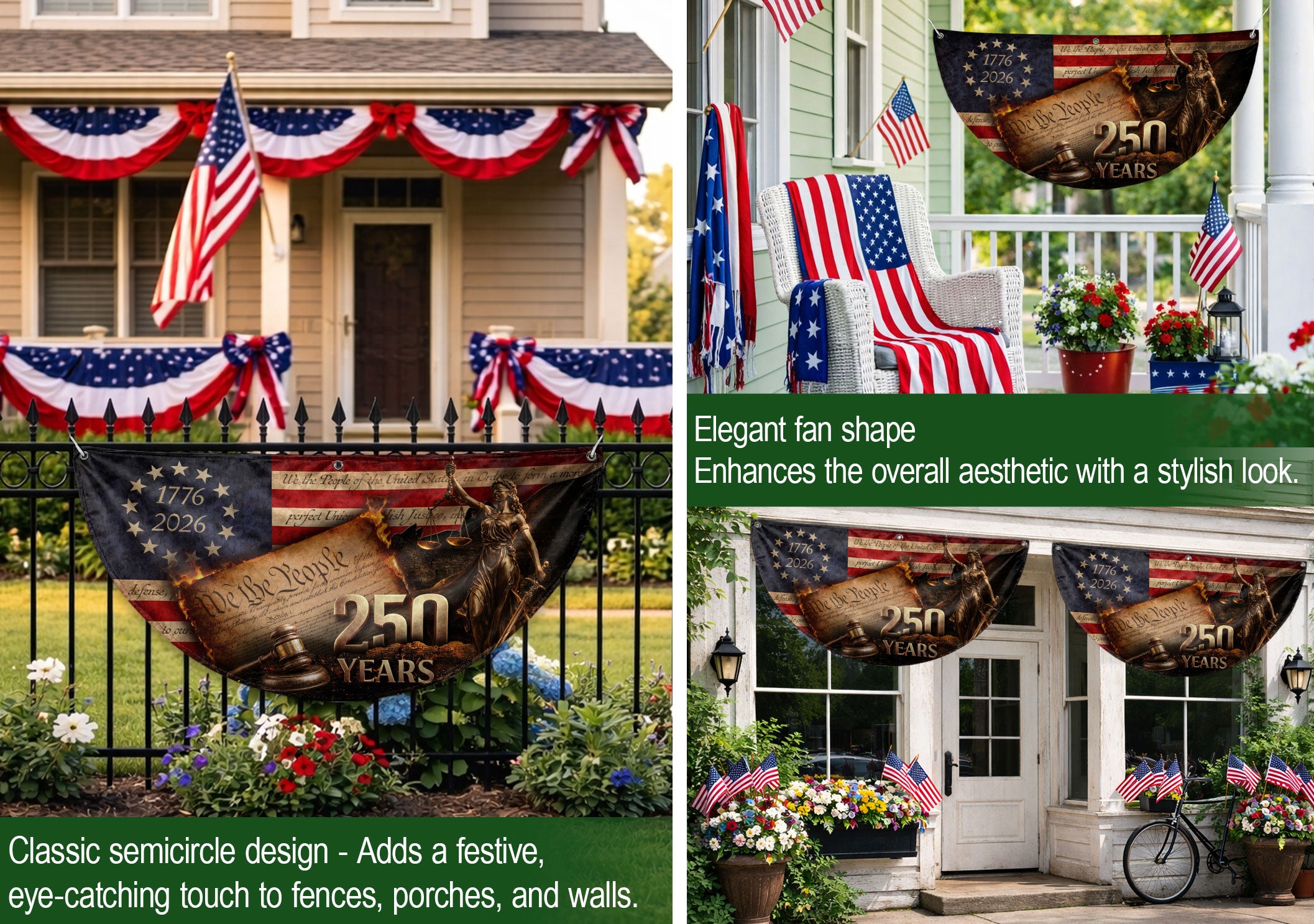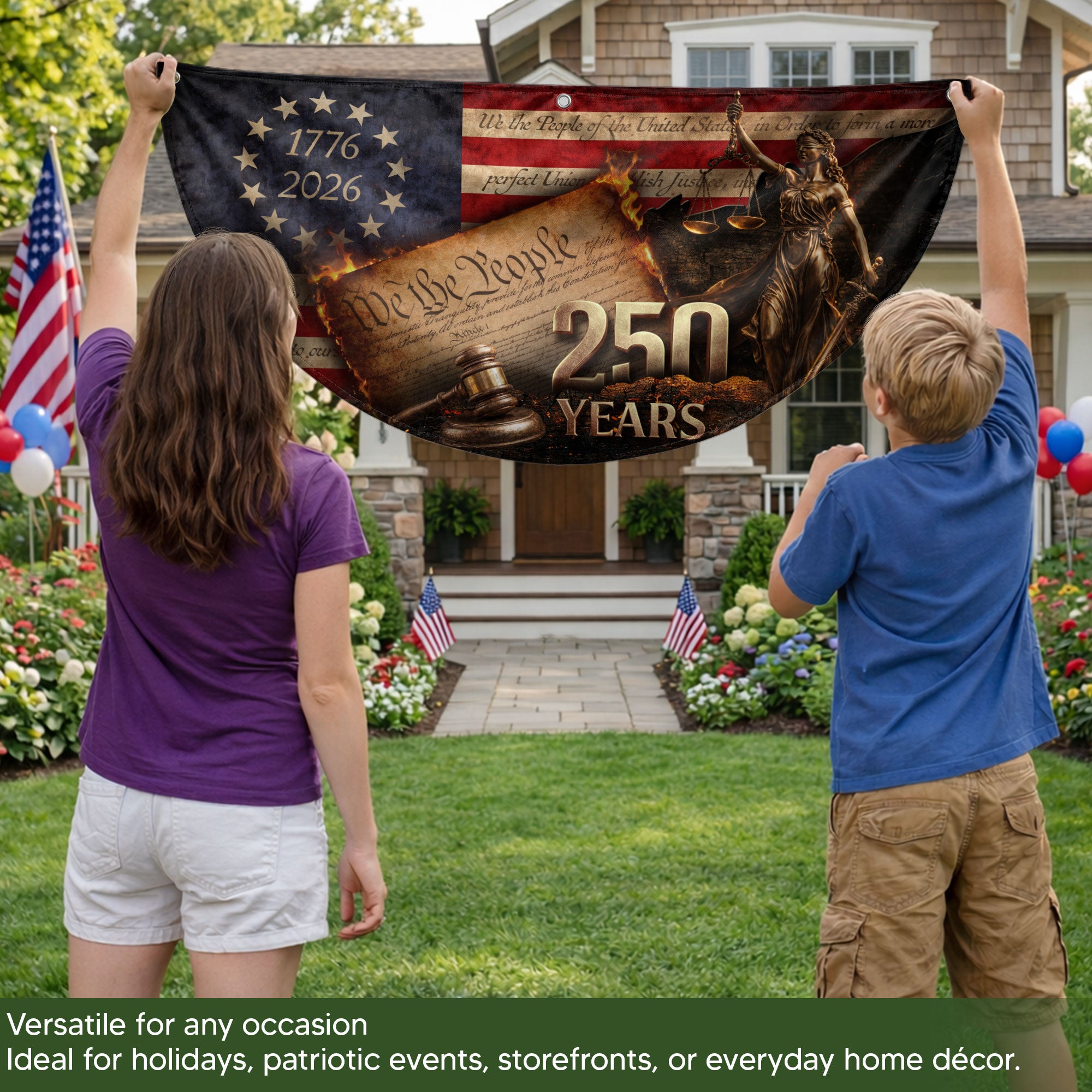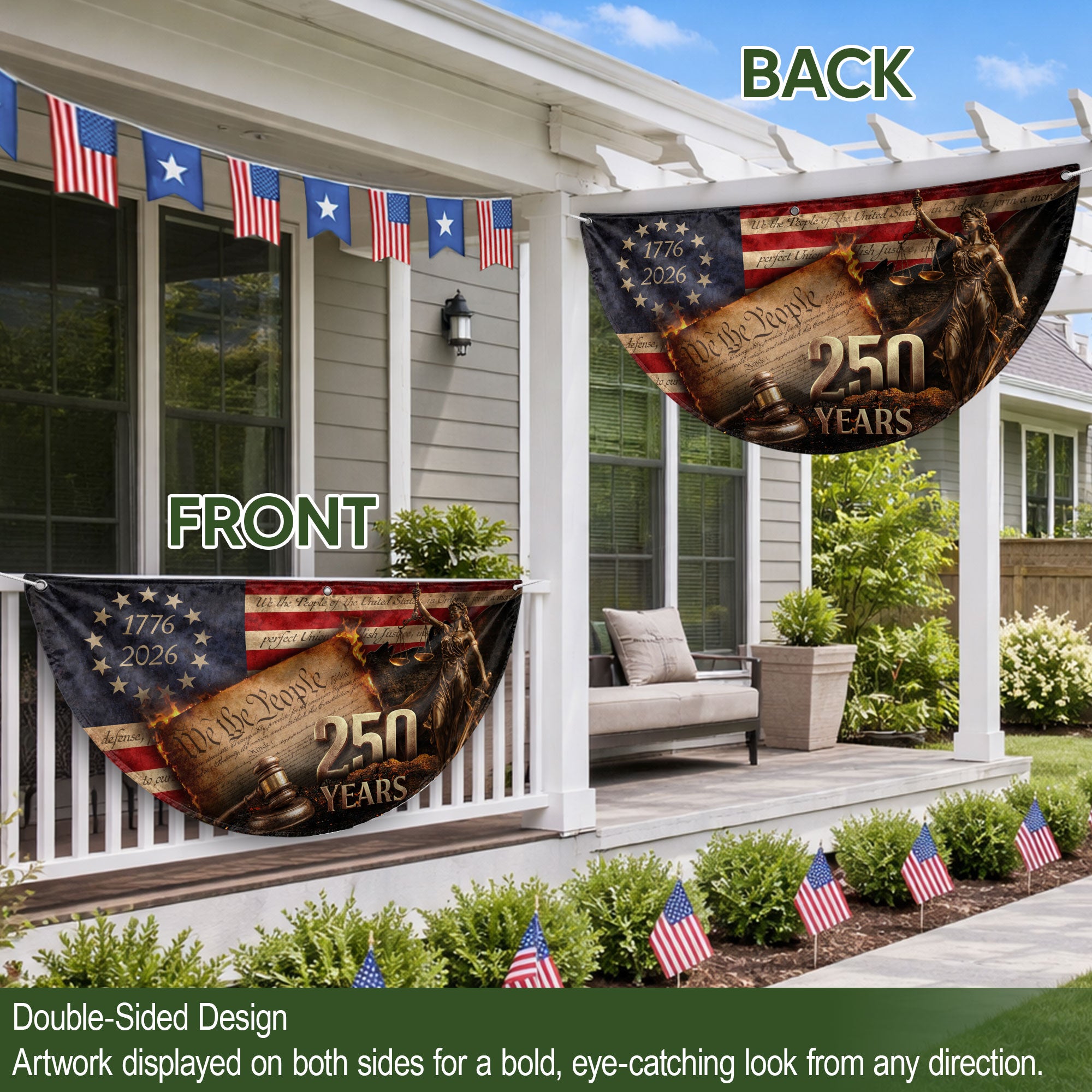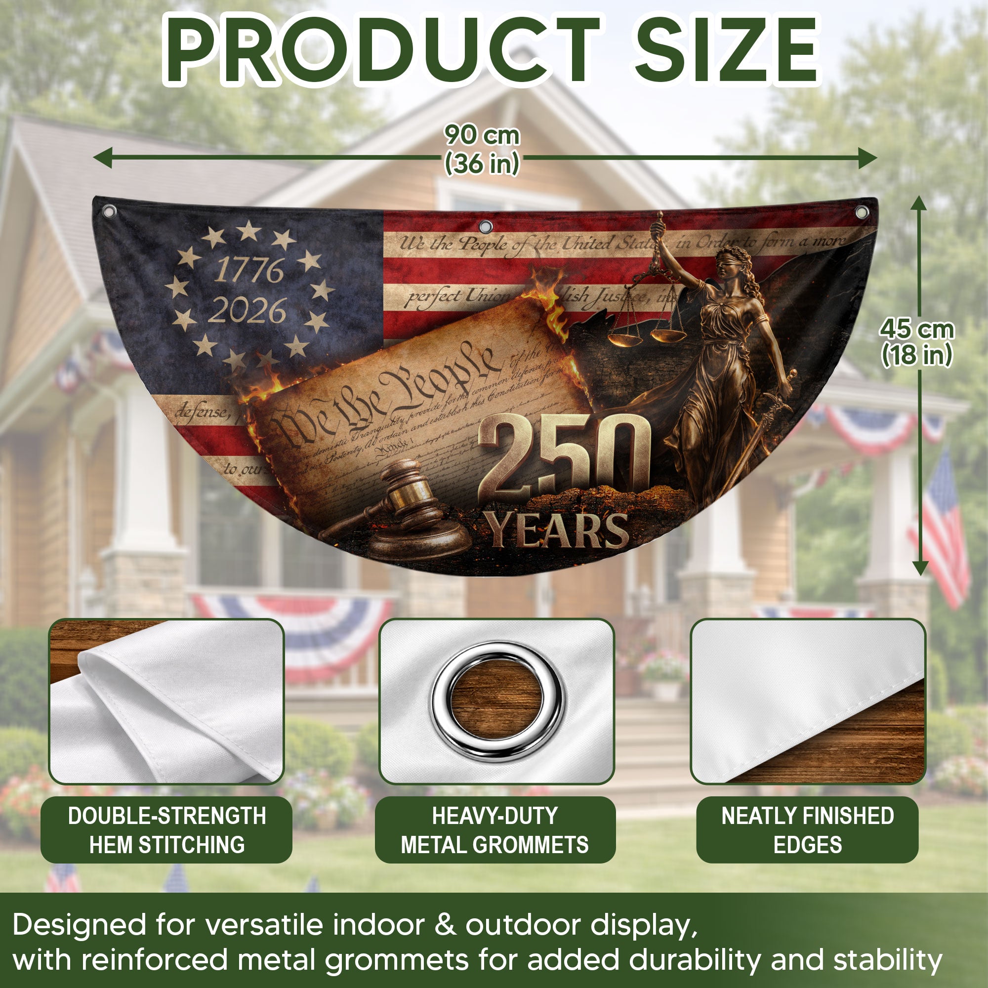 Celebrate America’s 250th anniversary with this detailed Lady Justice fence flag. Featuring the iconic Lady Justice figure, judge’s gavel, and the ‘We The People’ preamble from the Constitution, it’s framed by a 13-star circle and the dates 1776-2026. This patriotic outdoor banner serves as a dignified symbol of justice, freedom, and American heritage. Perfect for displaying on fences, porches, or gardens to honor the nation’s history. Crafted for durable outdoor use, it withstands weather while showcasing intricate designs that capture the spirit of independence and constitutional values.