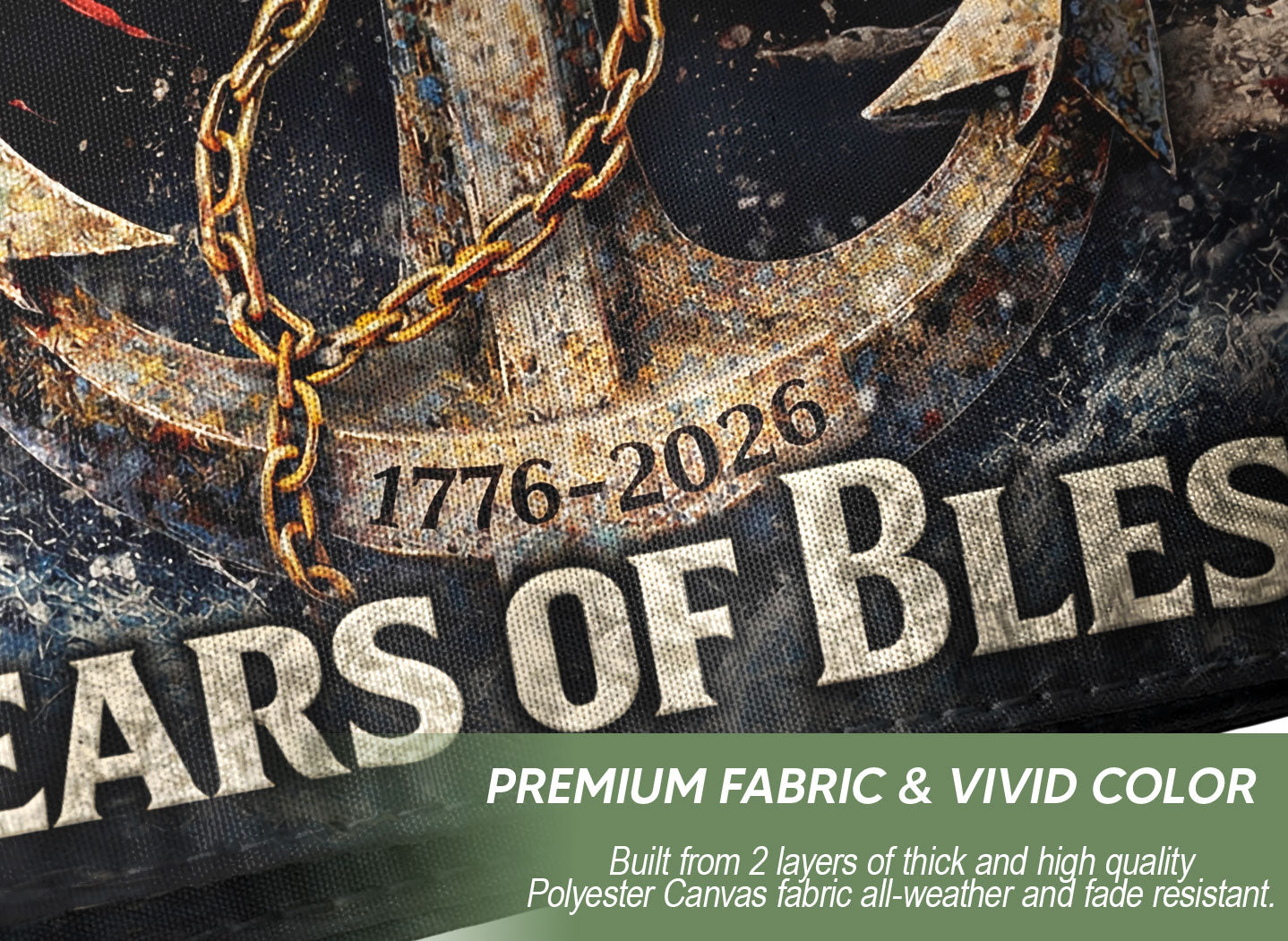 Celebrate 250 years of American resilience, faith, and freedom with this patriotic Christian flag banner spanning 1776-2026. Featuring a powerful anchor cross and chain design symbolizing hope, strength, and generational blessings, this durable double-sided banner is perfect for displaying at home, events, churches, or patriotic gatherings. Made with high-quality, weather-resistant fabric, it ensures vibrant colors and clear visibility from both sides. Ideal for Independence Day celebrations, historical commemorations, or as a faith-inspired decor piece that honors the nation’s enduring spirit.