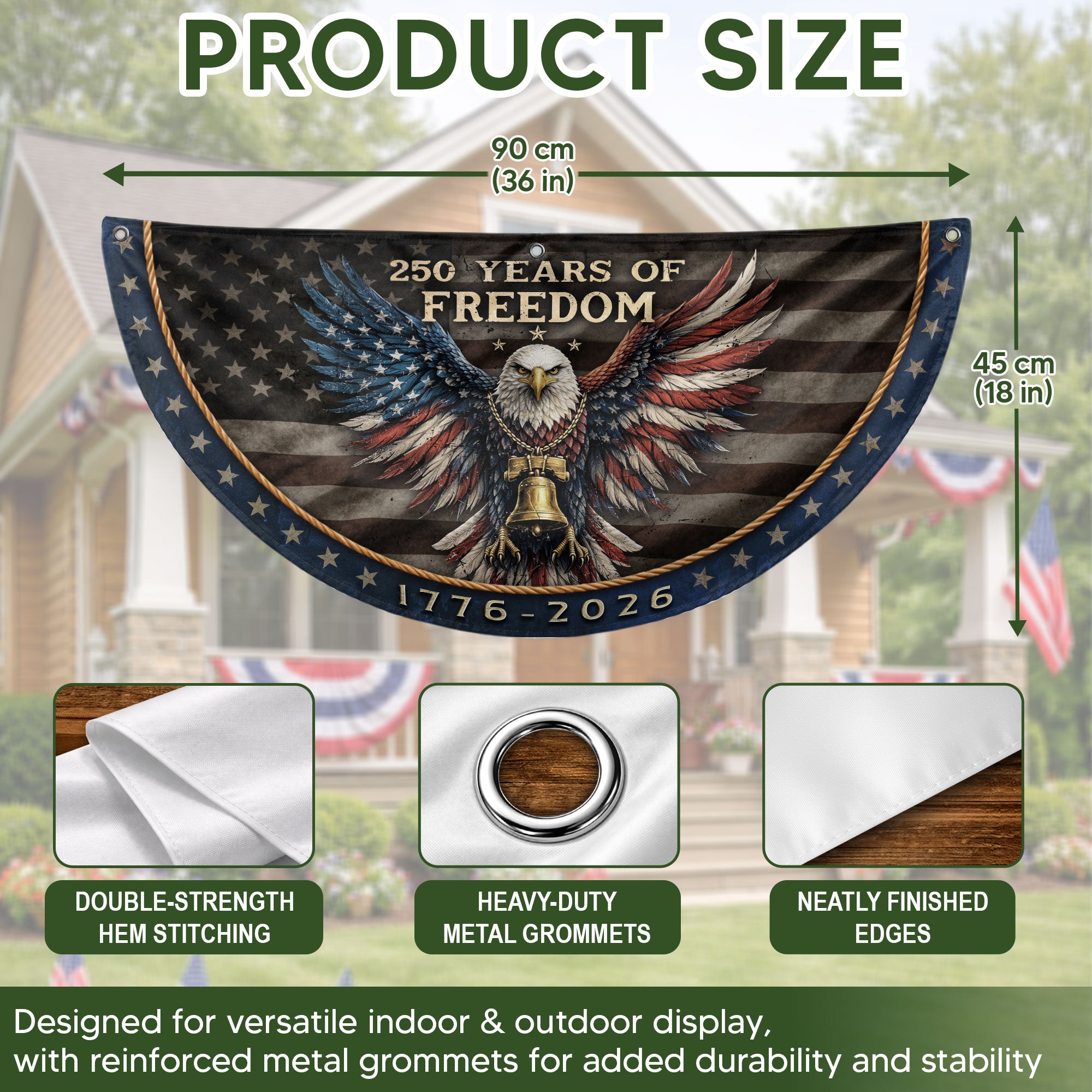 Celebrate America’s 250th anniversary of independence from 1776 to 2026 with this striking fence flag. Featuring a bold patriotic eagle, iconic Liberty Bell, and vintage American design elements, this banner captures the spirit of freedom and national pride. Crafted from durable, weather-resistant polyester fabric, it withstands outdoor conditions including wind, rain, and sun exposure. Perfect for displaying on fences, porches, decks, mailboxes, or as yard décor during Independence Day celebrations, historical commemorations, or everyday patriotic displays. Easy to hang with reinforced grommets and sleeves. Measures standard fence flag size for versatile placement. Proudly made to honor the semiquincentennial milestone.