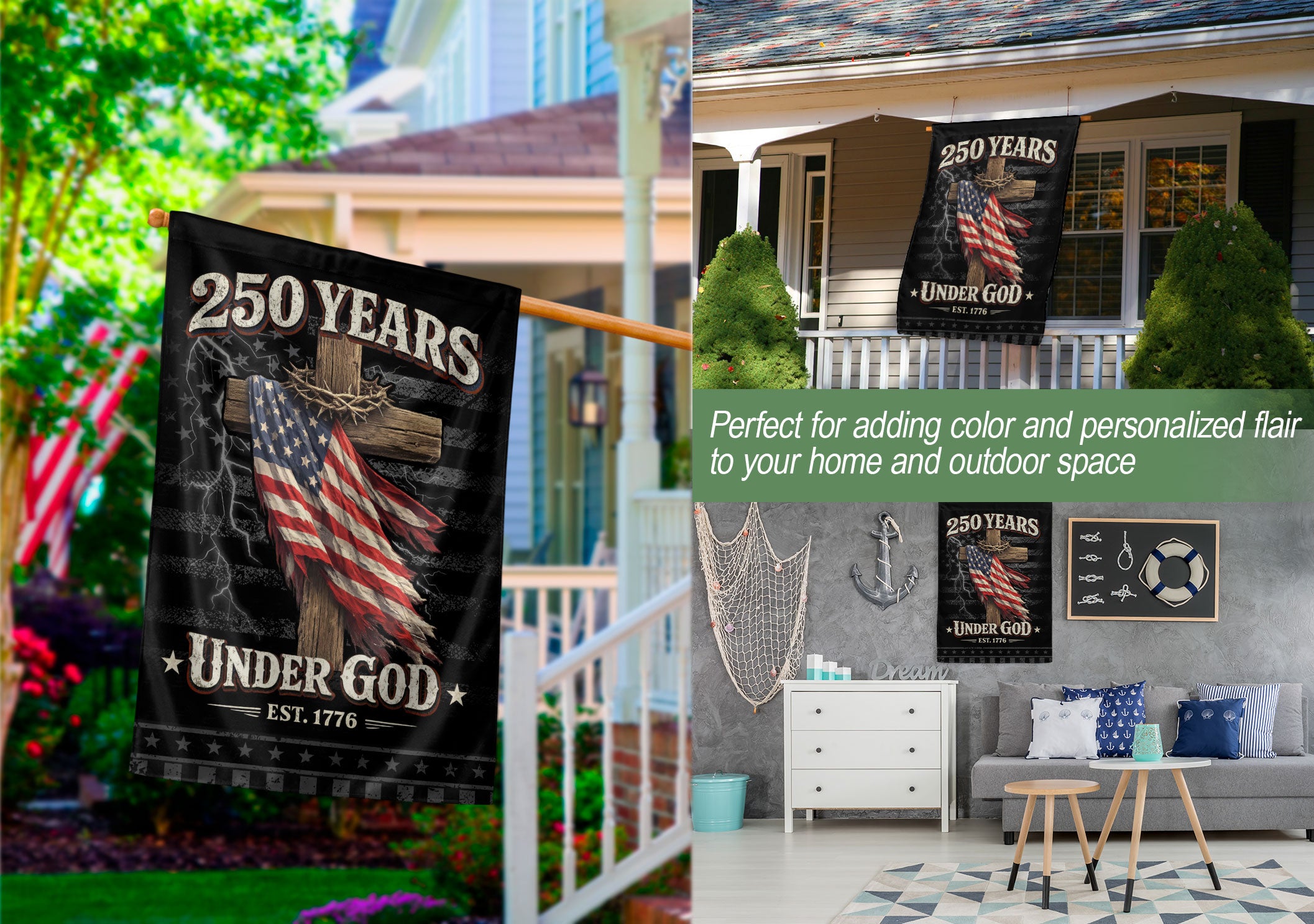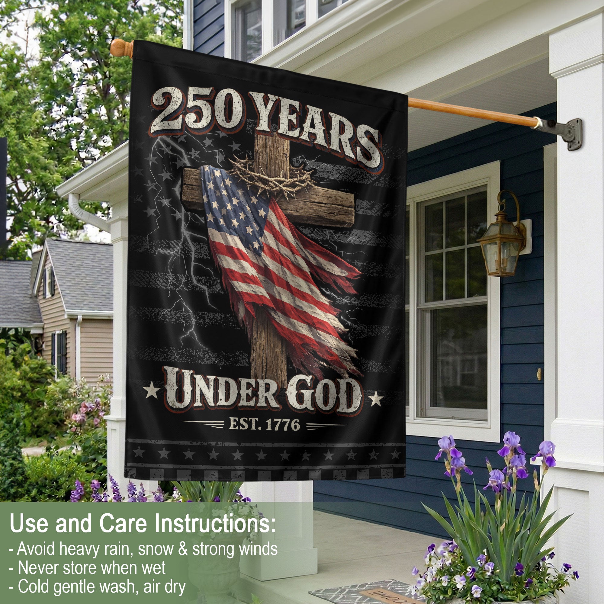 250 Years of Freedom House Flag – One Nation Under God Cross Patriotic Design