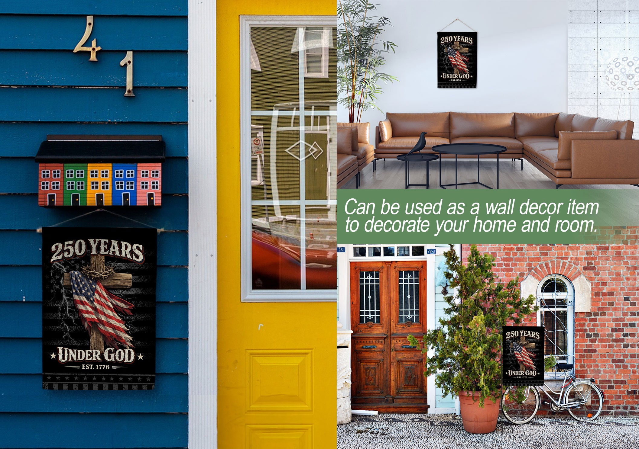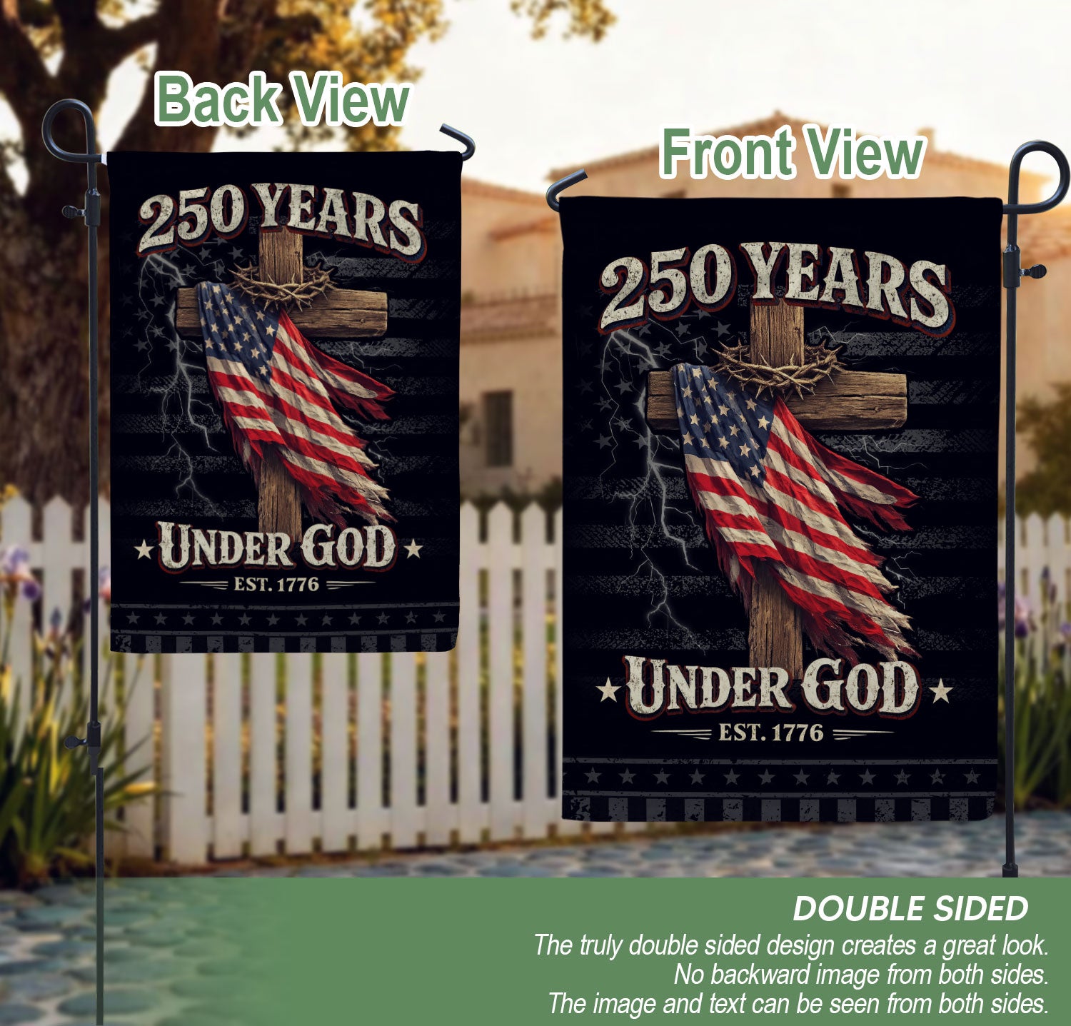 Celebrate 250 years of American freedom with this double-sided house flag featuring ‘One Nation Under God,’ a striking eagle, cross, and ‘We The People’ patriotic elements. Crafted for durability, this faith and freedom decor is perfect for yards, gardens, porches, or any outdoor space. The bold design honors enduring national values and makes a powerful statement of patriotism and spirituality. Easy to hang and weather-resistant for long-lasting display.