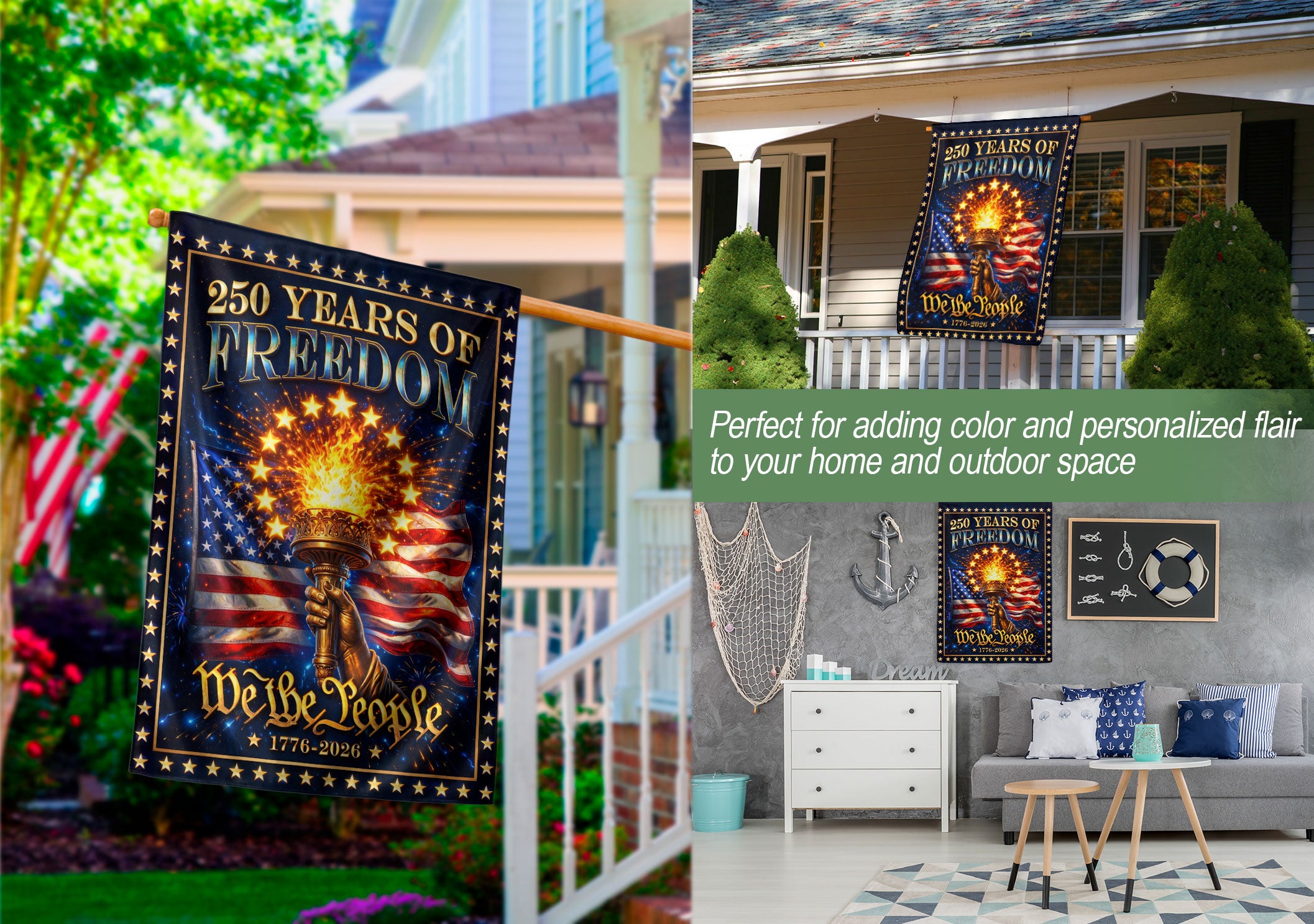 Celebrate America’s 250th anniversary with this striking 250 Years of Freedom garden flag. Featuring a bold blazing torch, iconic American flag, and the powerful ‘We The People’ message, this yard banner honors the spirit of unity, independence, and patriotism from 1776 to 2026. Crafted for durability, it’s perfect for displaying in gardens, yards, porches, or walkways to showcase your love for American history. The vibrant colors and high-quality fabric resist fading and weather for year-round outdoor use. Ideal for July 4th celebrations, historical commemorations, or everyday patriotic pride.