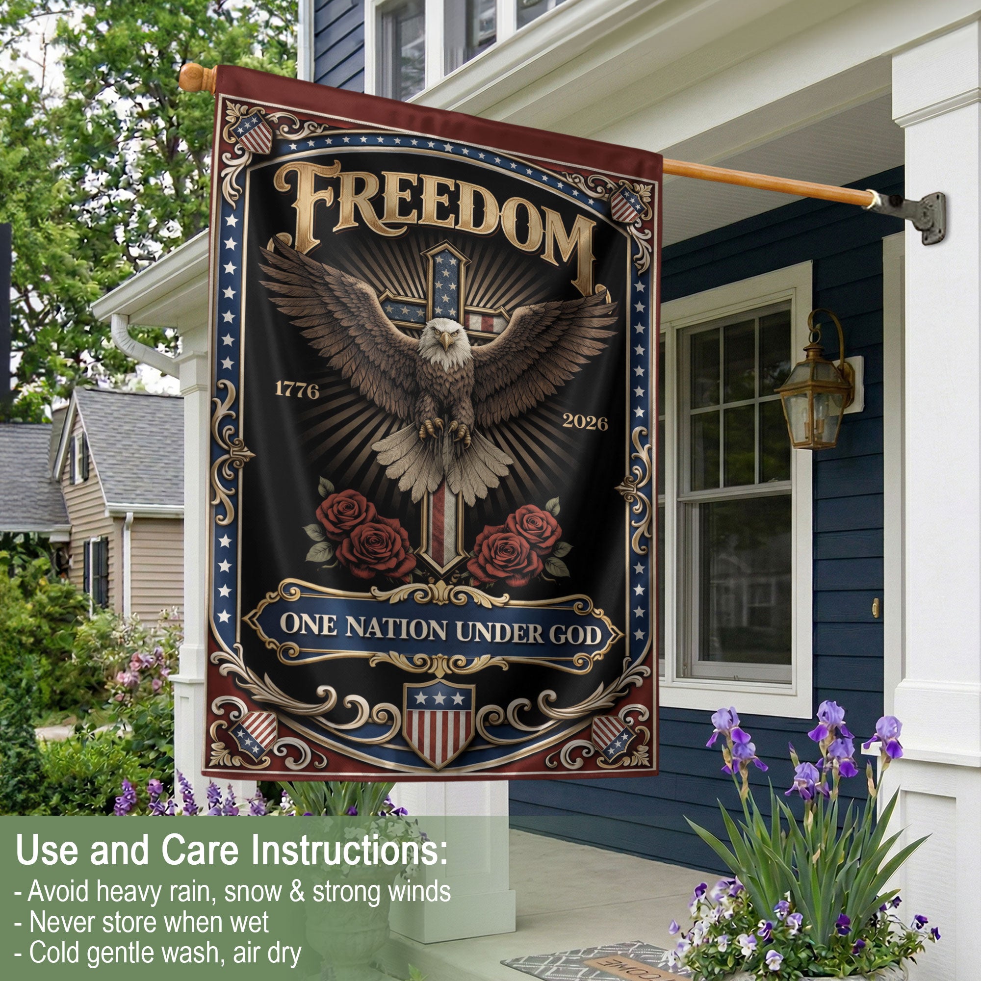 Celebrate America’s 250th anniversary with this double-sided house flag featuring ‘One Nation Under God’ and ‘We The People’ messages. The design showcases a powerful eagle and cross in patriotic red, white, and blue colors, symbolizing faith, freedom, and 250 years of liberty from 1776 to 2026. Perfect for displaying Christian values and American pride on your porch or home. Crafted for durability and vibrant outdoor use, this flag stands side by side with faith and freedom.