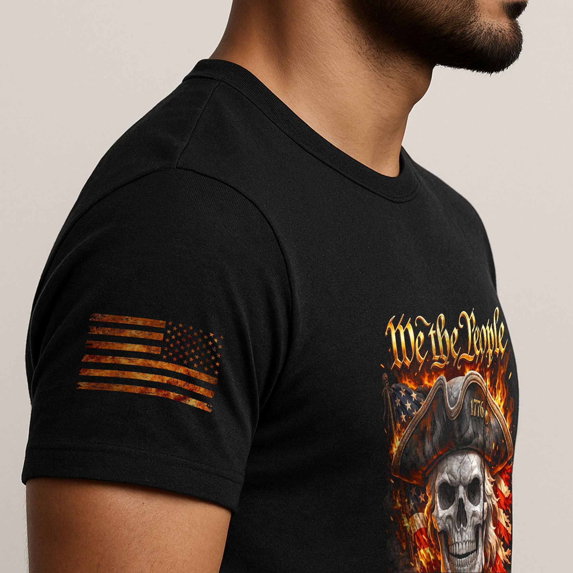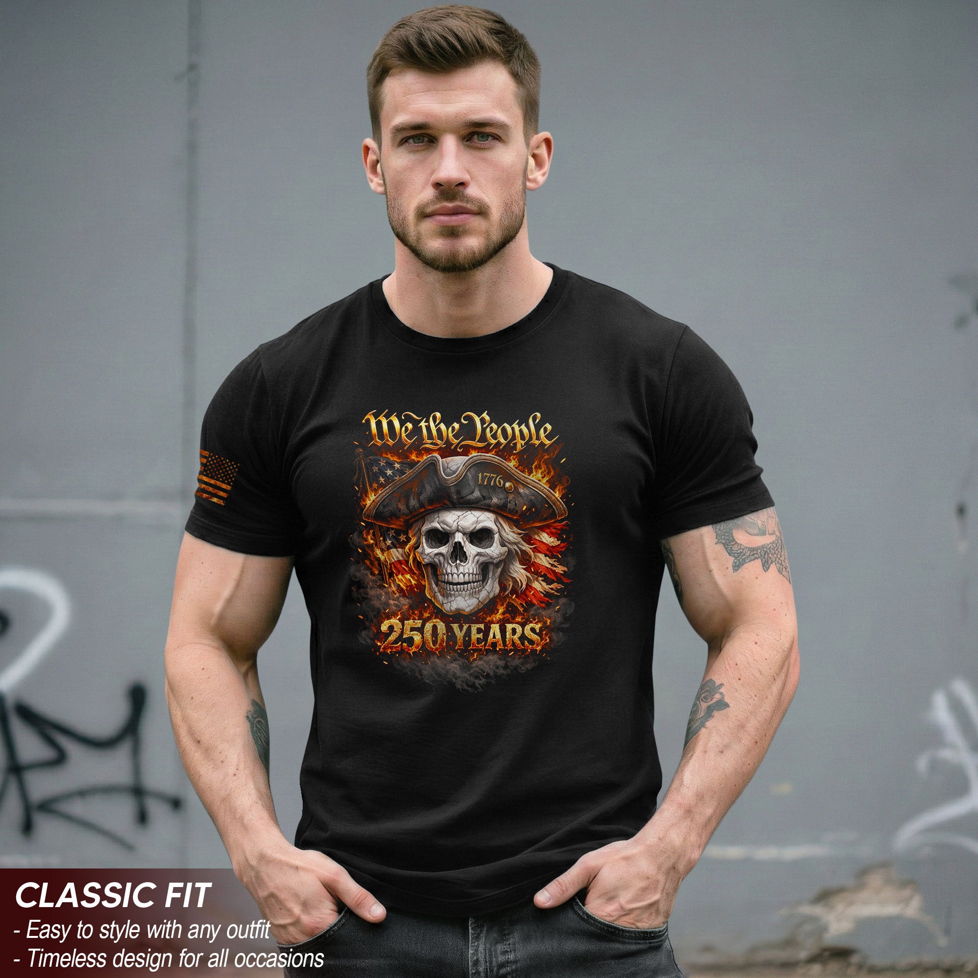 Celebrate 250 years of American independence with this bold Patriotic Skull T-Shirt featuring the iconic 1776-2026 timeline and ‘We The People’ slogan. The striking design showcases a flaming American flag intertwined with a fierce skull, symbolizing fearless freedom and unyielding determination. Crafted from soft, breathable cotton blend fabric, this unisex tee offers all-day comfort for patriots of all ages. Perfect for 250th anniversary events, Fourth of July barbecues, veterans’ gatherings, or everyday wear to show your pride in the USA. Available in multiple sizes from S-XXL, with vibrant, fade-resistant prints that withstand washes. Embrace the spirit of liberty and make a powerful statement with this anniversary graphic tee.