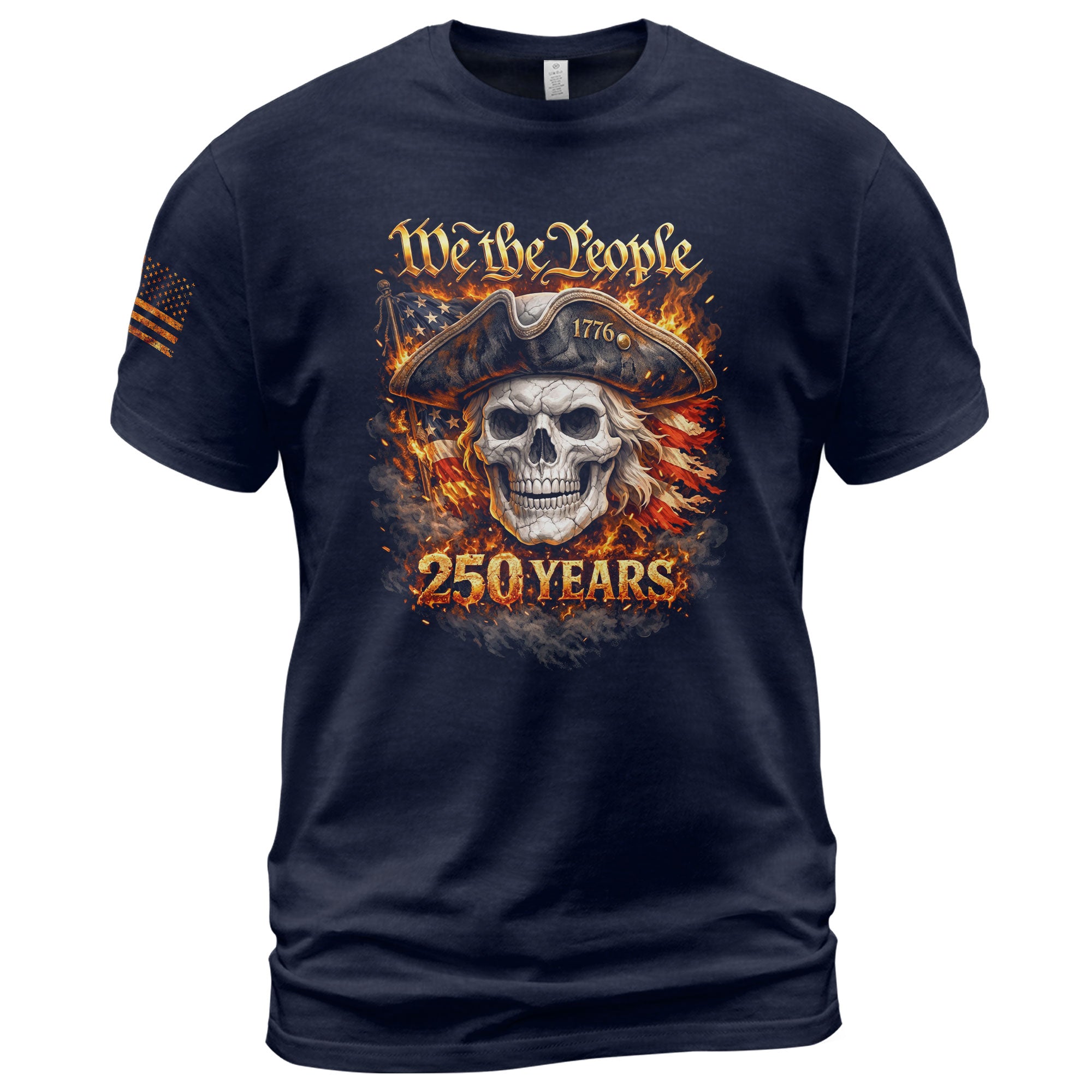 America 250 Years Patriotic Skull T-Shirt 1776-2026 We The People Flaming Flag Tee