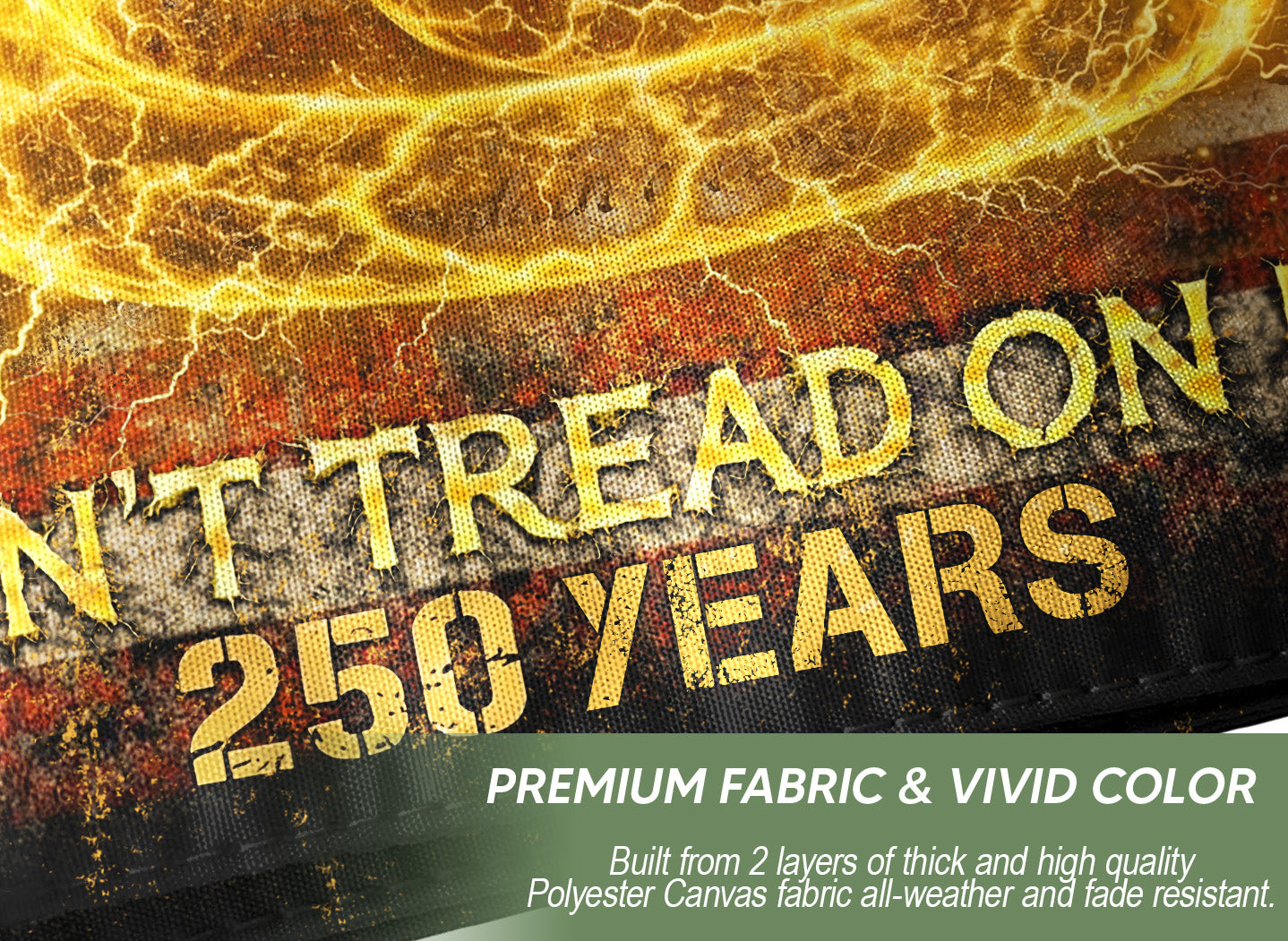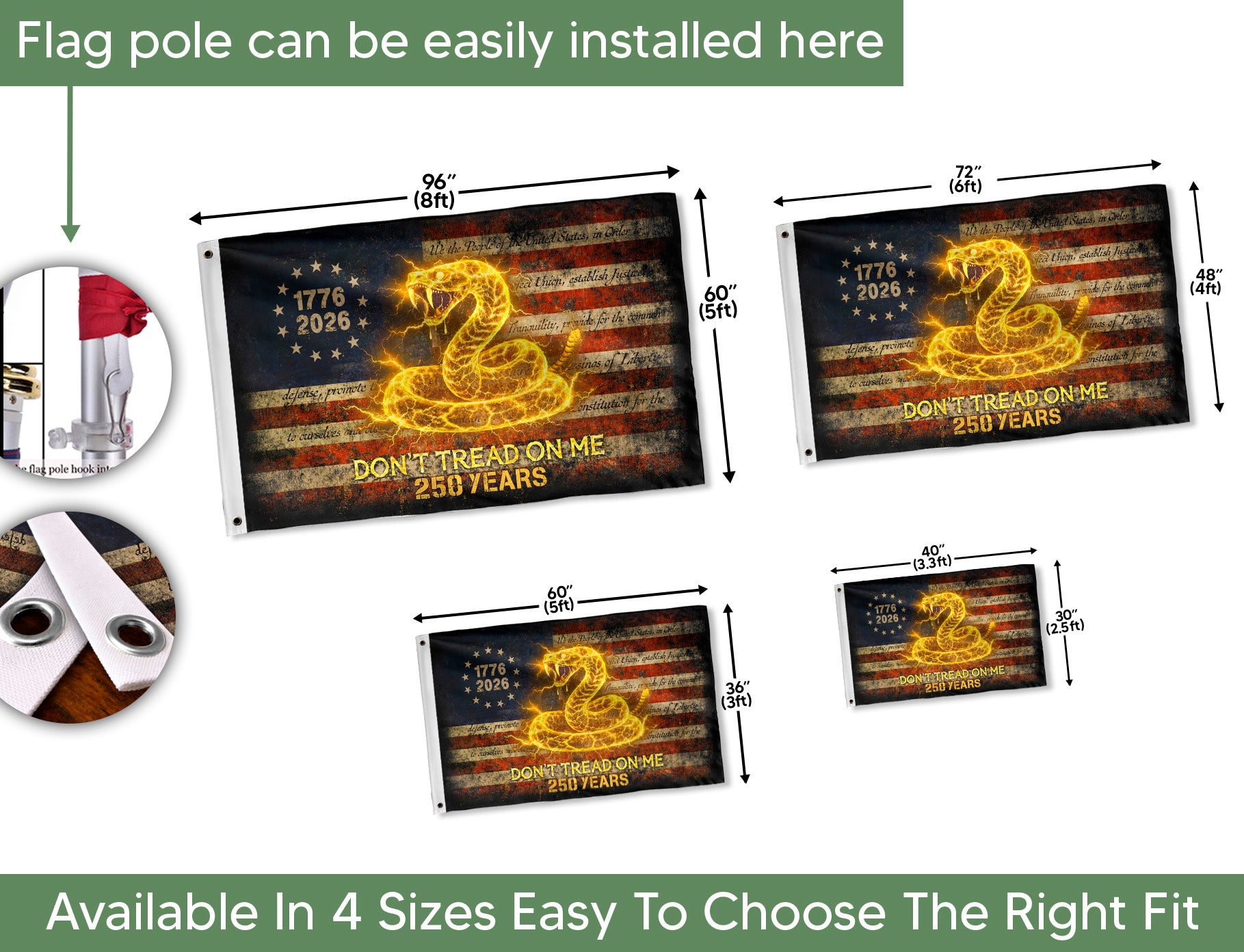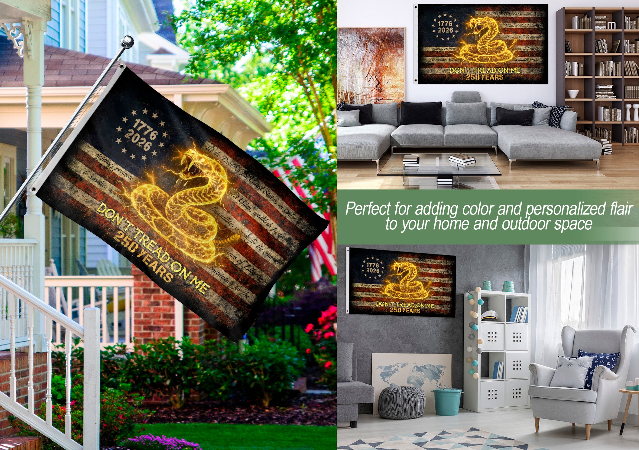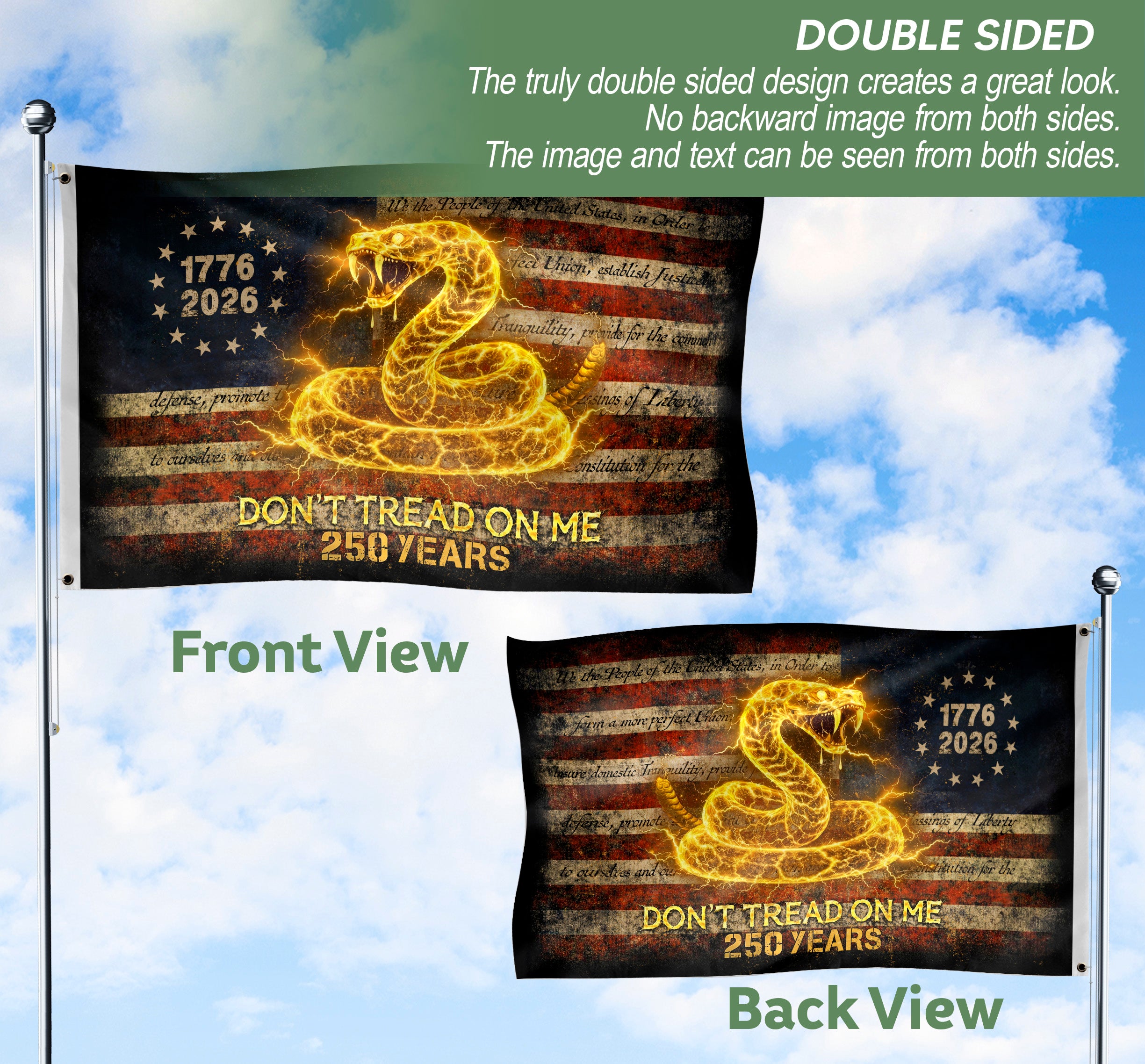 Celebrate America’s 250th anniversary with this striking double-sided Gadsden flag banner featuring the iconic yellow snake coiled in defiance and the bold ‘Don’t Tread On Me’ slogan. Spanning from 1776 to 2026, this historic banner honors the resilience and independence that defined the nation. Crafted from durable, weather-resistant polyester fabric, it measures standard flag size for versatile display on poles, walls, or fences. Perfect for patriots, history enthusiasts, Fourth of July events, parades, veteran gatherings, or home decor to showcase unwavering American spirit. The vibrant yellow background with black snake and text ensures high visibility and timeless appeal. Easy to hang with reinforced grommets on all sides. Proudly display this symbol of liberty and warning against tyranny.