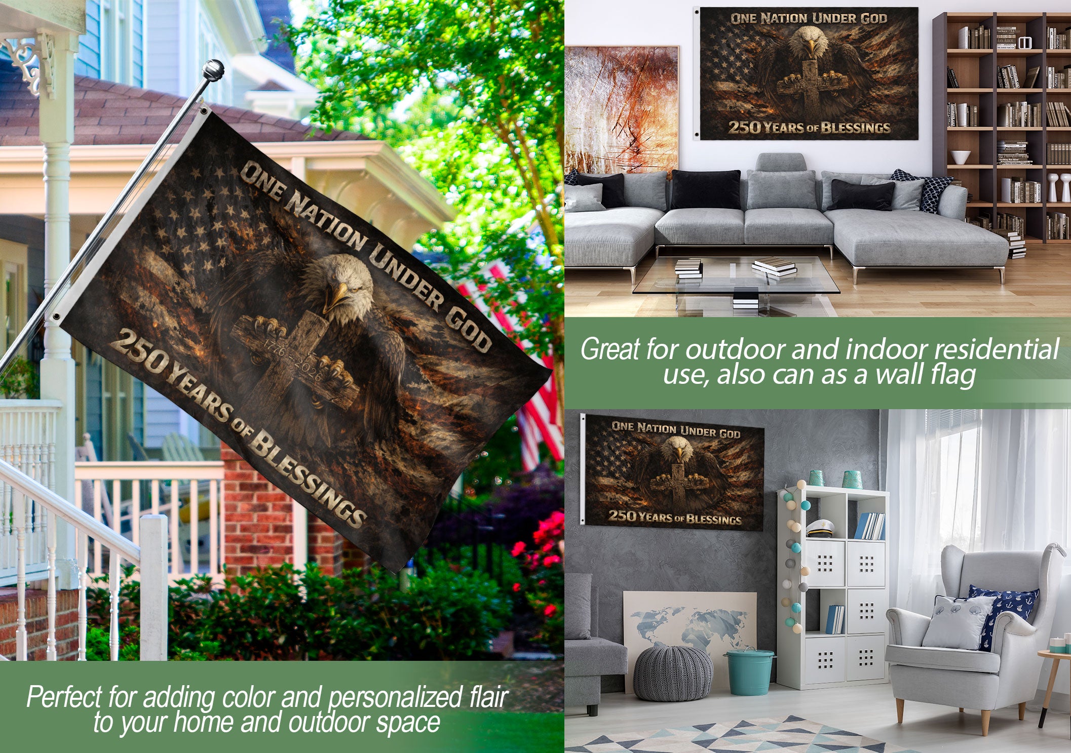 Celebrate 250 years of American independence with this striking double-sided flag banner spanning 1776-2026. Featuring a powerful bald eagle, cross, and ‘One Nation Under God’ motto, it honors the nation’s courageous history, faith-driven strength, and enduring spiritual foundation. Crafted for durability, this religious patriotic banner is ideal for displaying at home, events, parades, or outdoor gatherings to showcase devotion and national pride. Perfect for history enthusiasts, veterans, and patriots marking the semiquincentennial milestone.