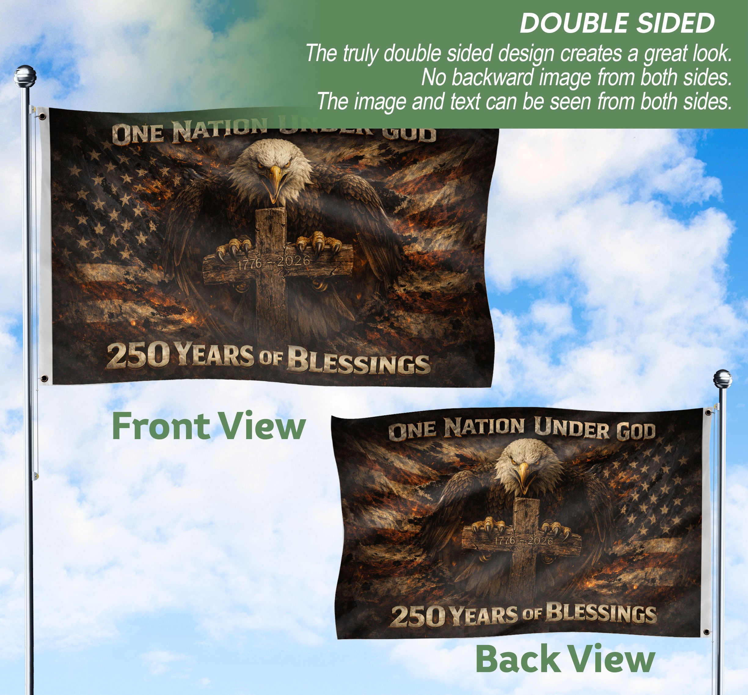 America 250th Anniversary Double-Sided Flag 1776-2026 Bald Eagle Cross One Nation Under God Banner