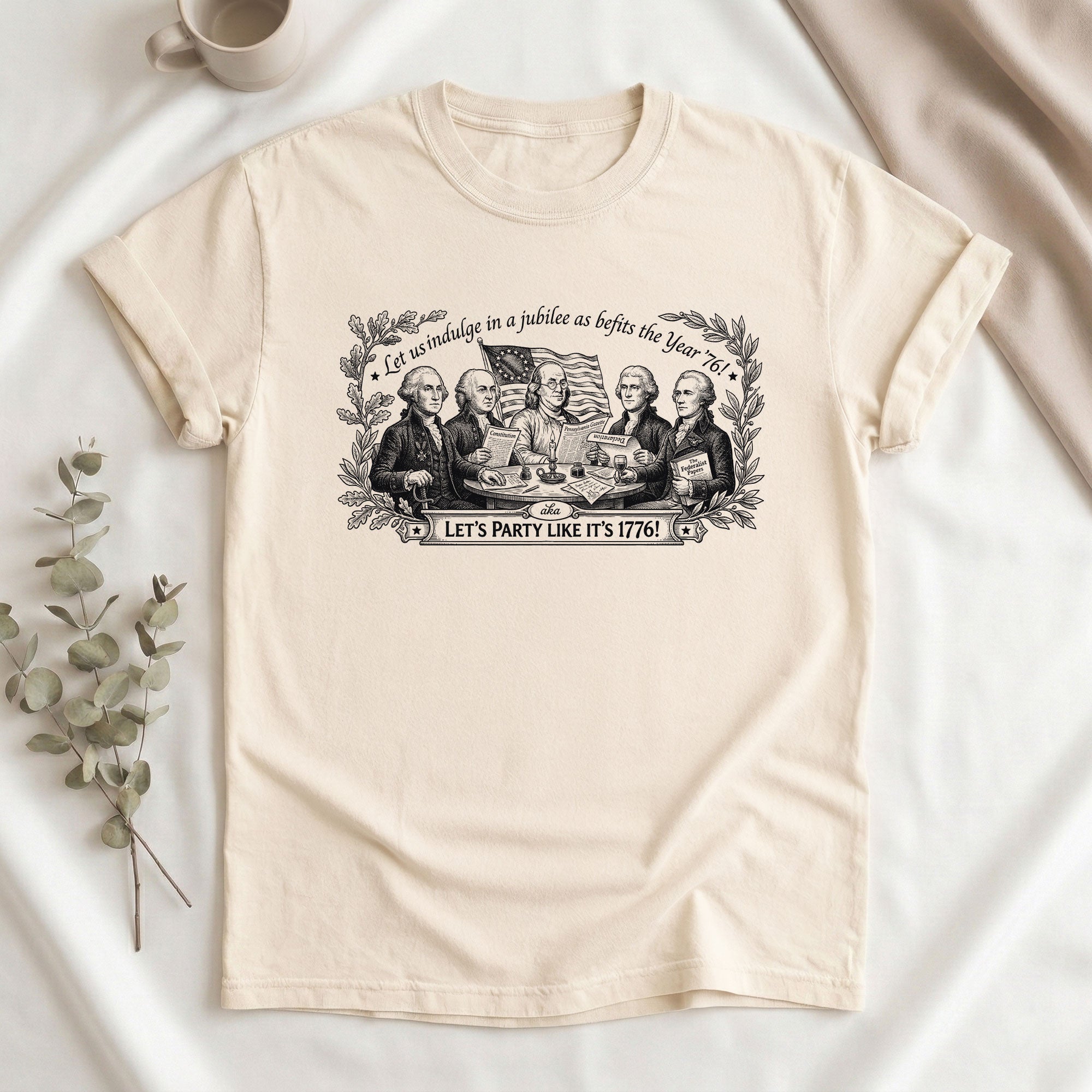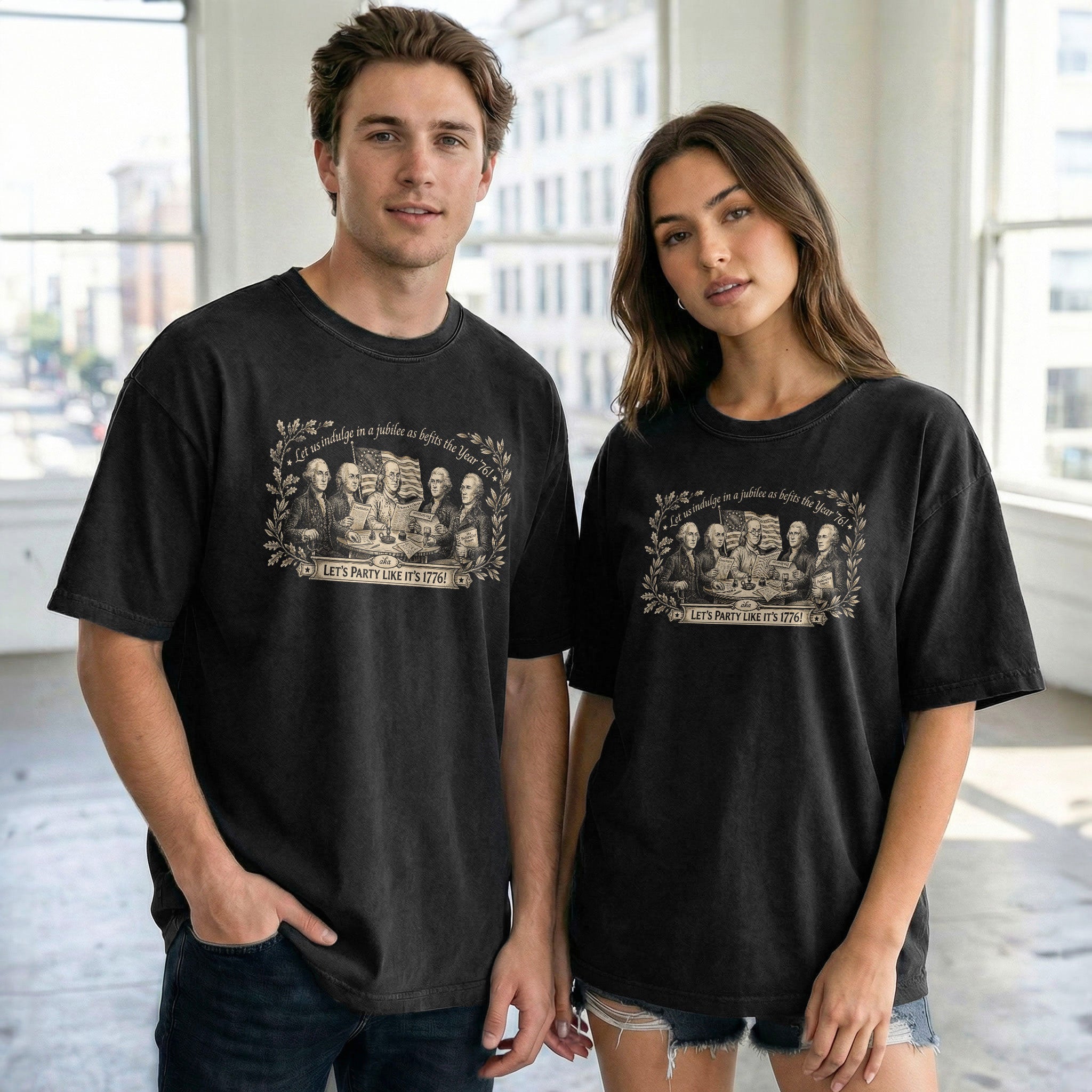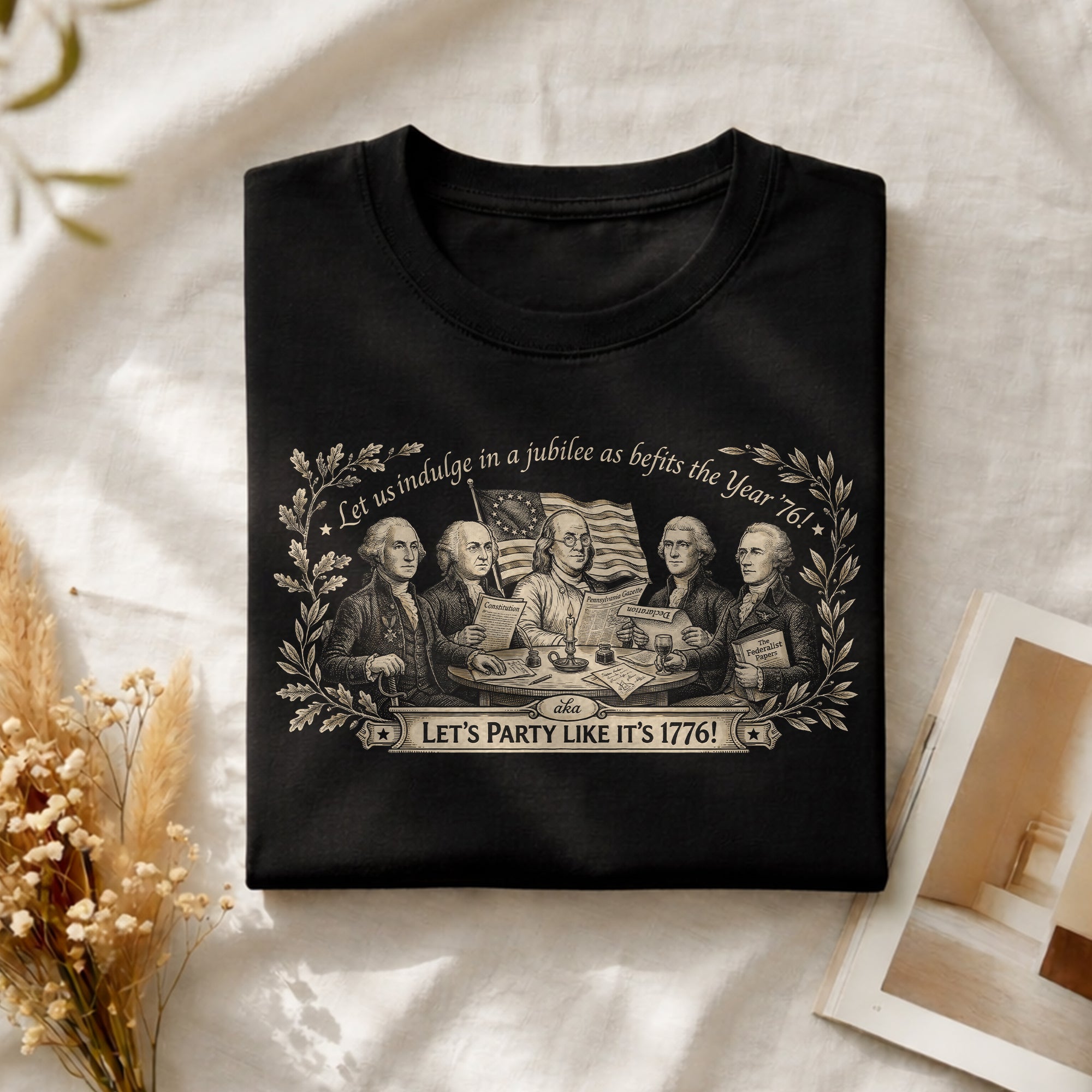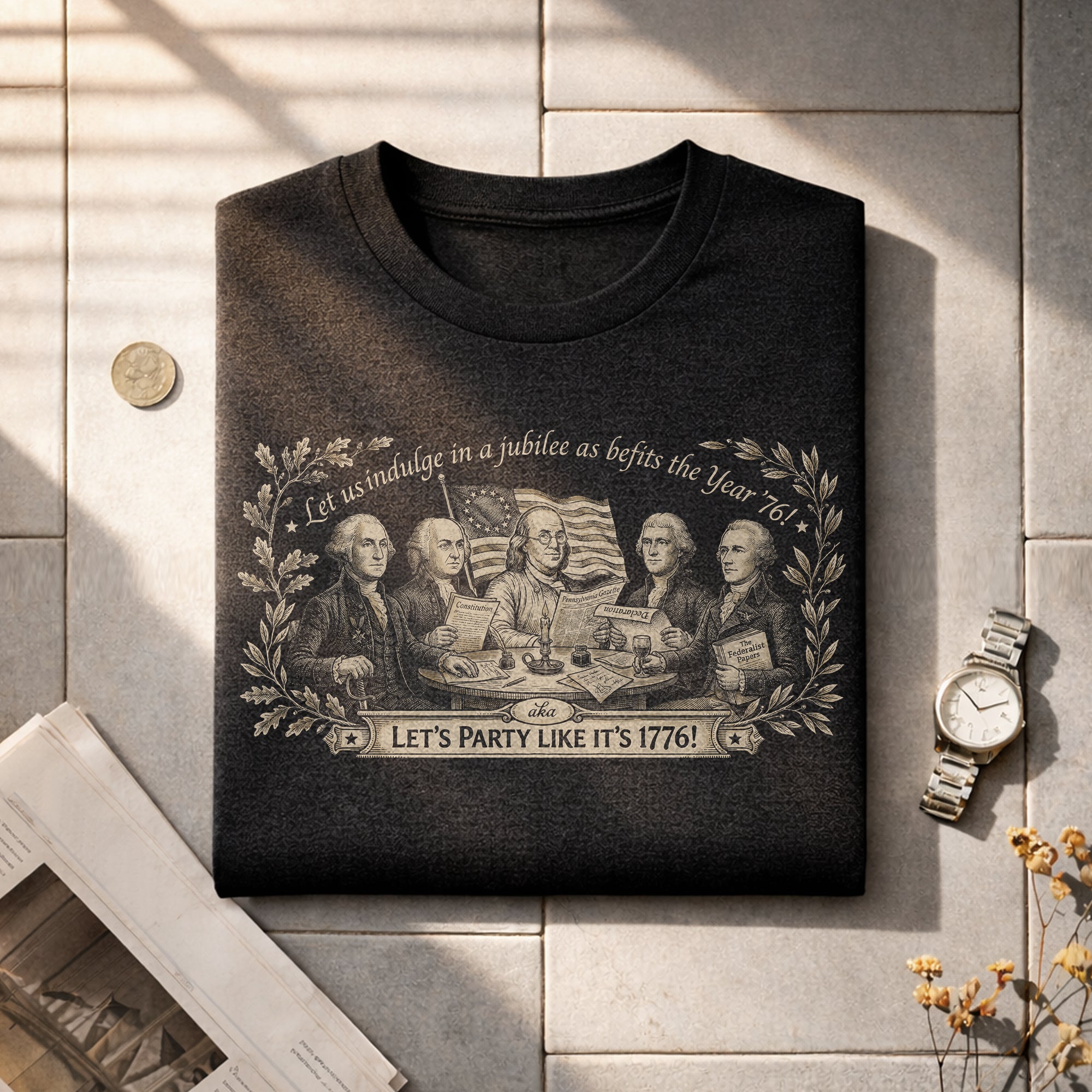 Celebrate America’s 250th anniversary with this classic Founding Fathers vintage T-shirt. Featuring a patriotic historical design and the iconic quote ‘Let’s Party Like It’s 1776,’ this unisex tee is perfect for Independence Day, 4th of July barbecues, patriotic events, and everyday wear. Made from soft, breathable cotton blend fabric for all-day comfort, it offers a relaxed fit suitable for men and women. The distressed vintage print captures the revolutionary spirit of 1776, honoring the birth of the United States. Ideal for history buffs, patriots, and anyone excited about Semiquincentennial celebrations. Machine washable and durable for repeated wear.