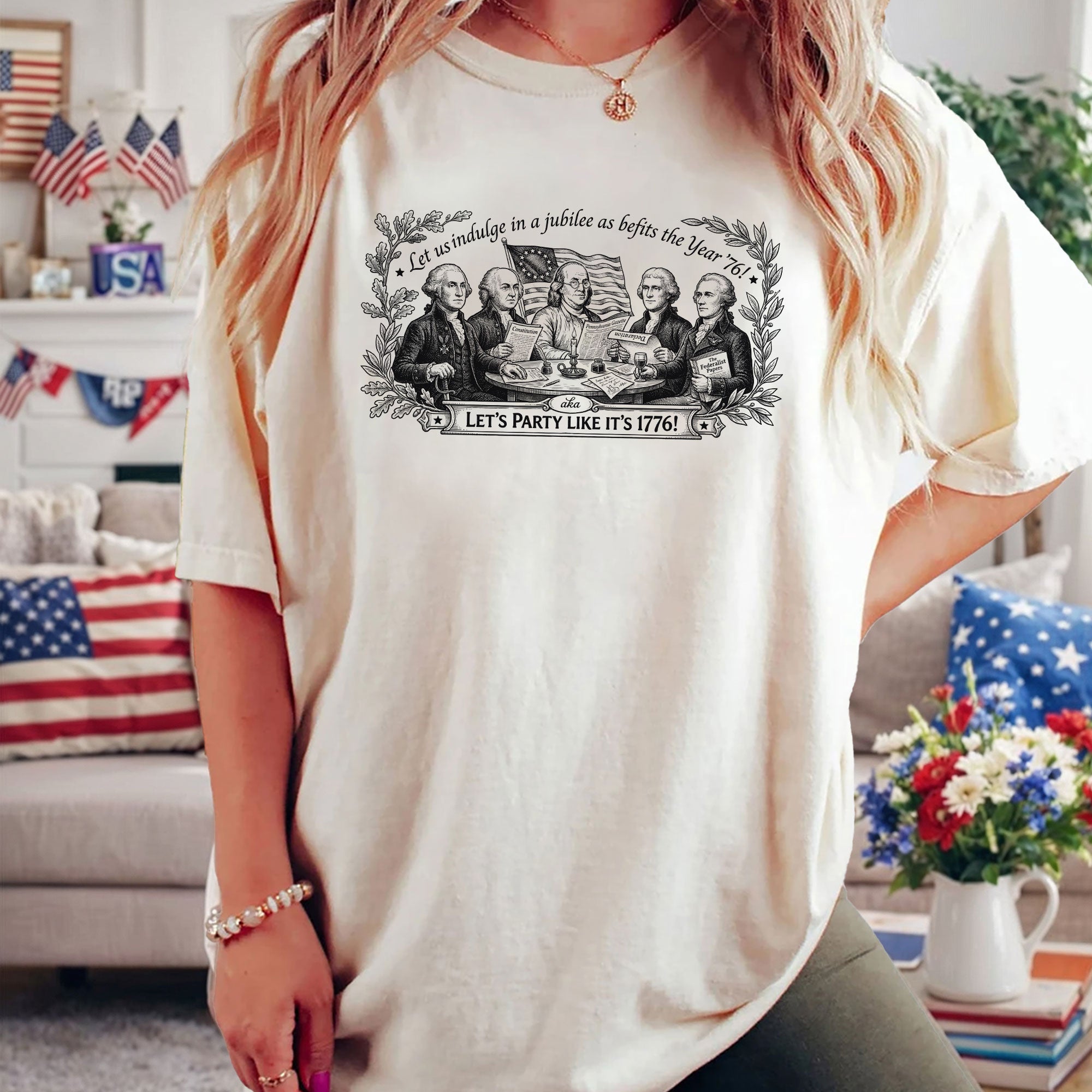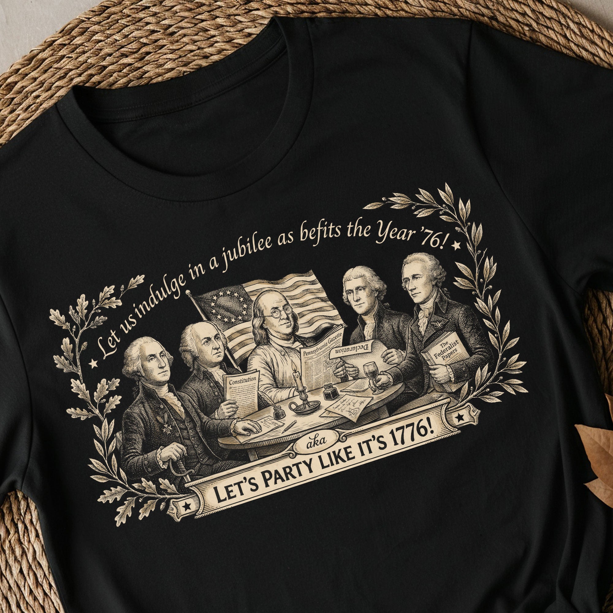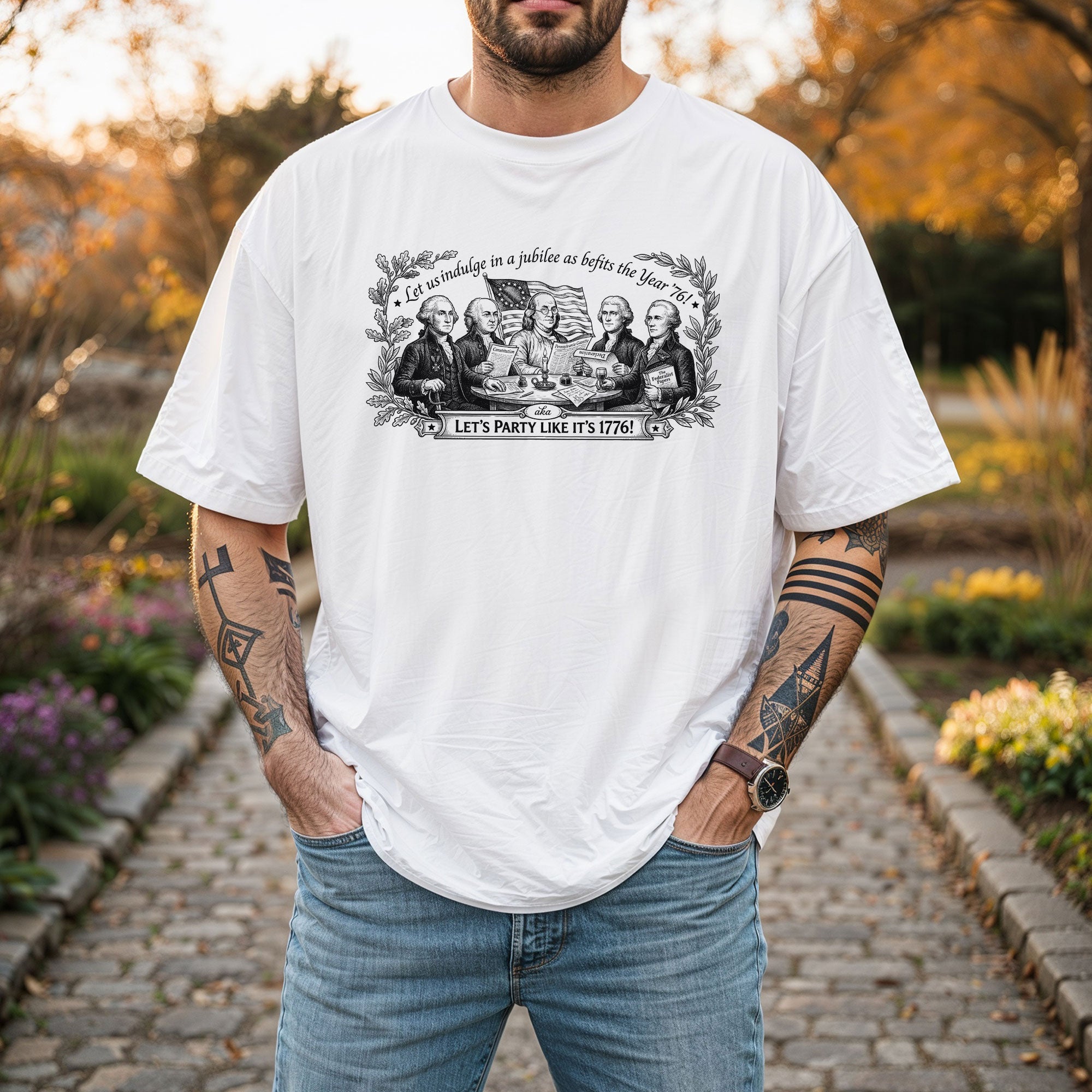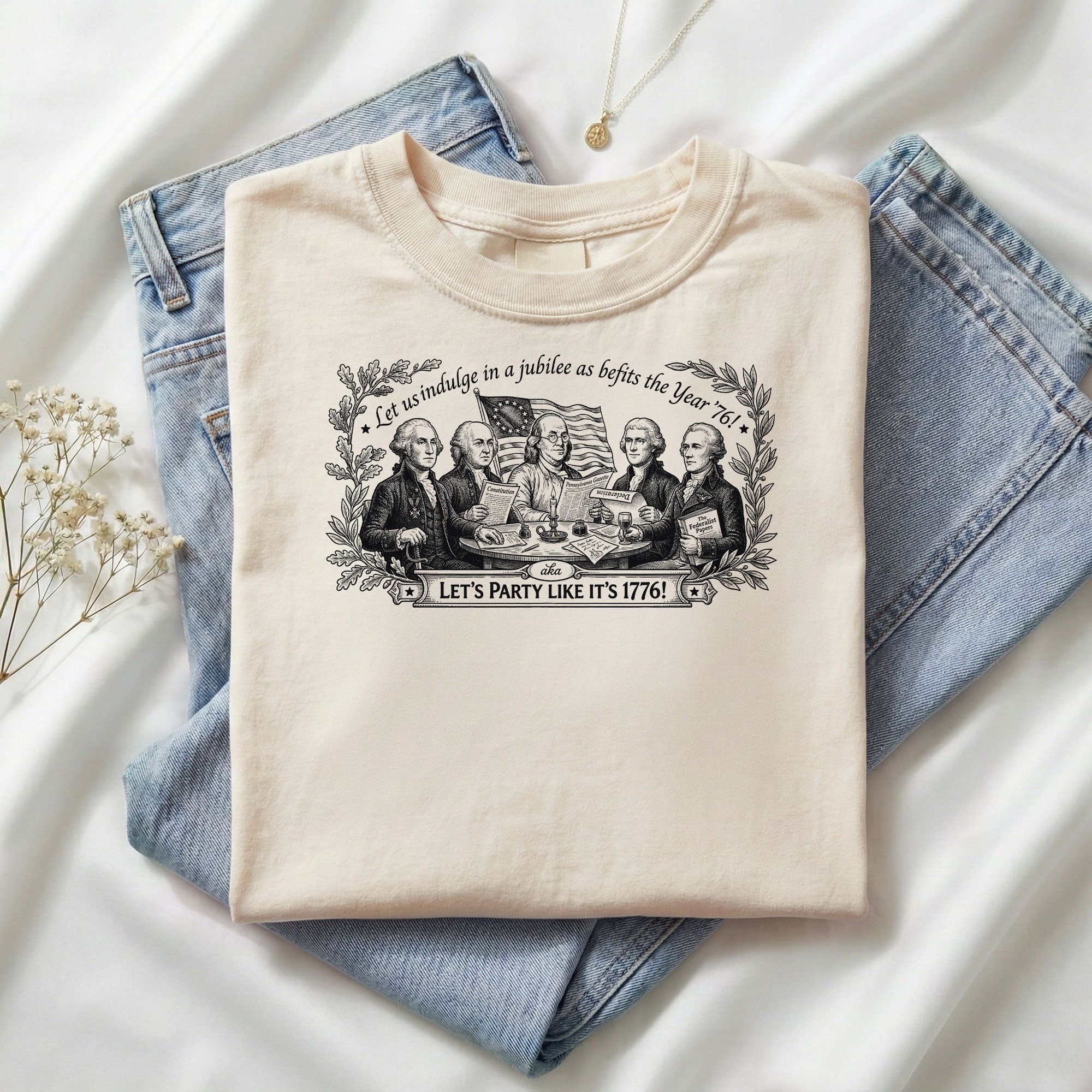 Celebrate America’s 250th anniversary with this classic Founding Fathers vintage T-shirt. Featuring a patriotic historical design and the iconic quote ‘Let’s Party Like It’s 1776,’ this unisex tee is perfect for Independence Day, 4th of July barbecues, patriotic events, and everyday wear. Made from soft, breathable cotton blend fabric for all-day comfort, it offers a relaxed fit suitable for men and women. The distressed vintage print captures the revolutionary spirit of 1776, honoring the birth of the United States. Ideal for history buffs, patriots, and anyone excited about Semiquincentennial celebrations. Machine washable and durable for repeated wear.
