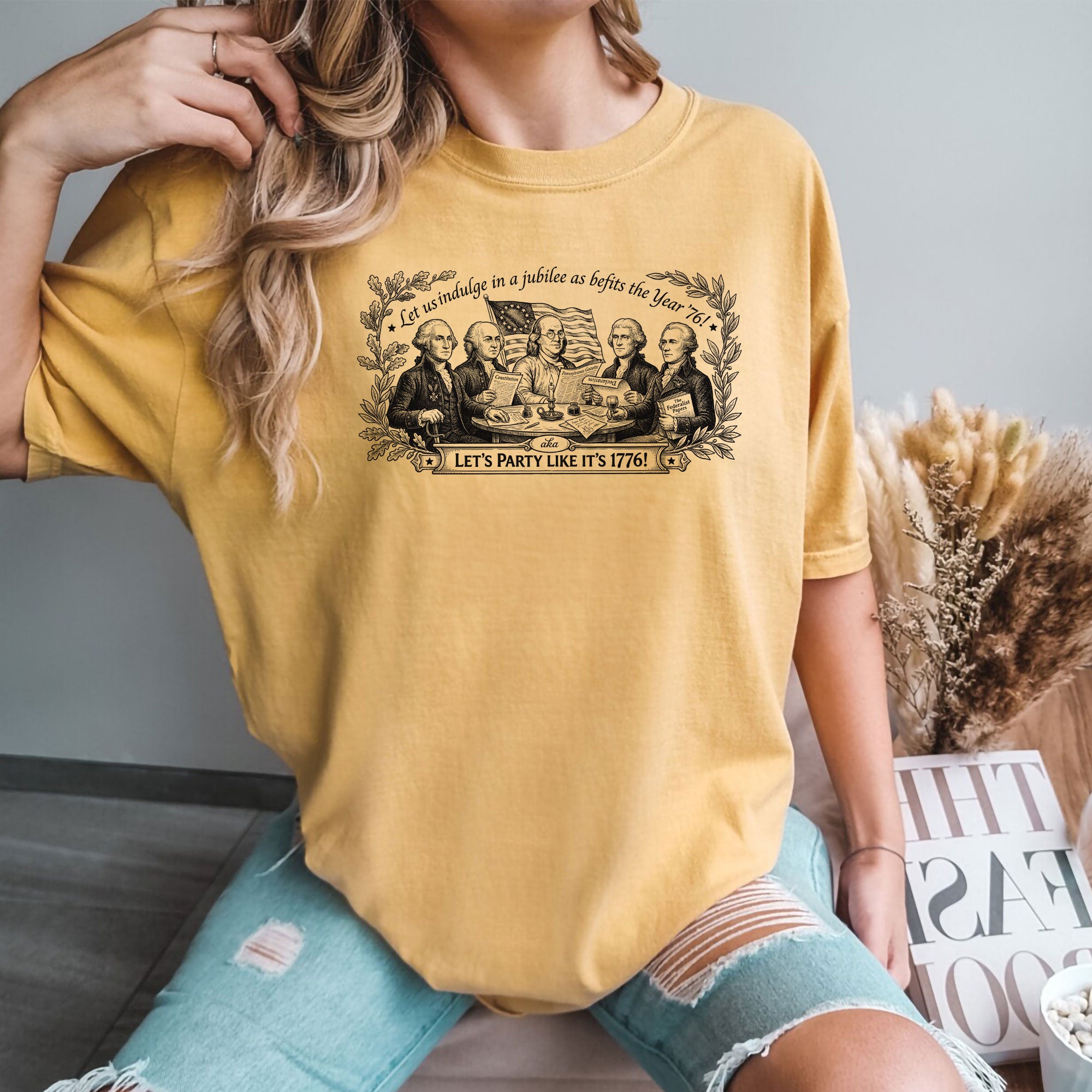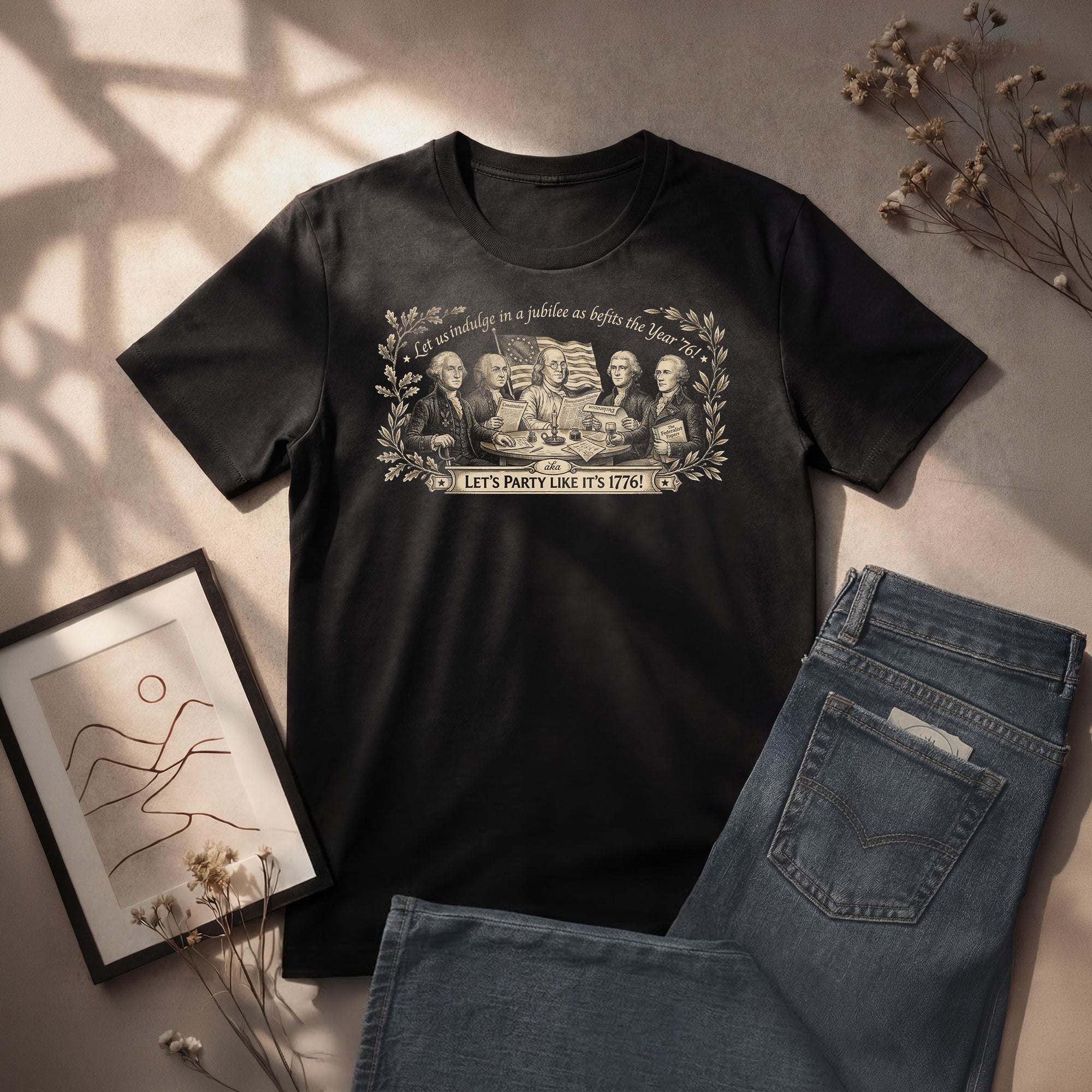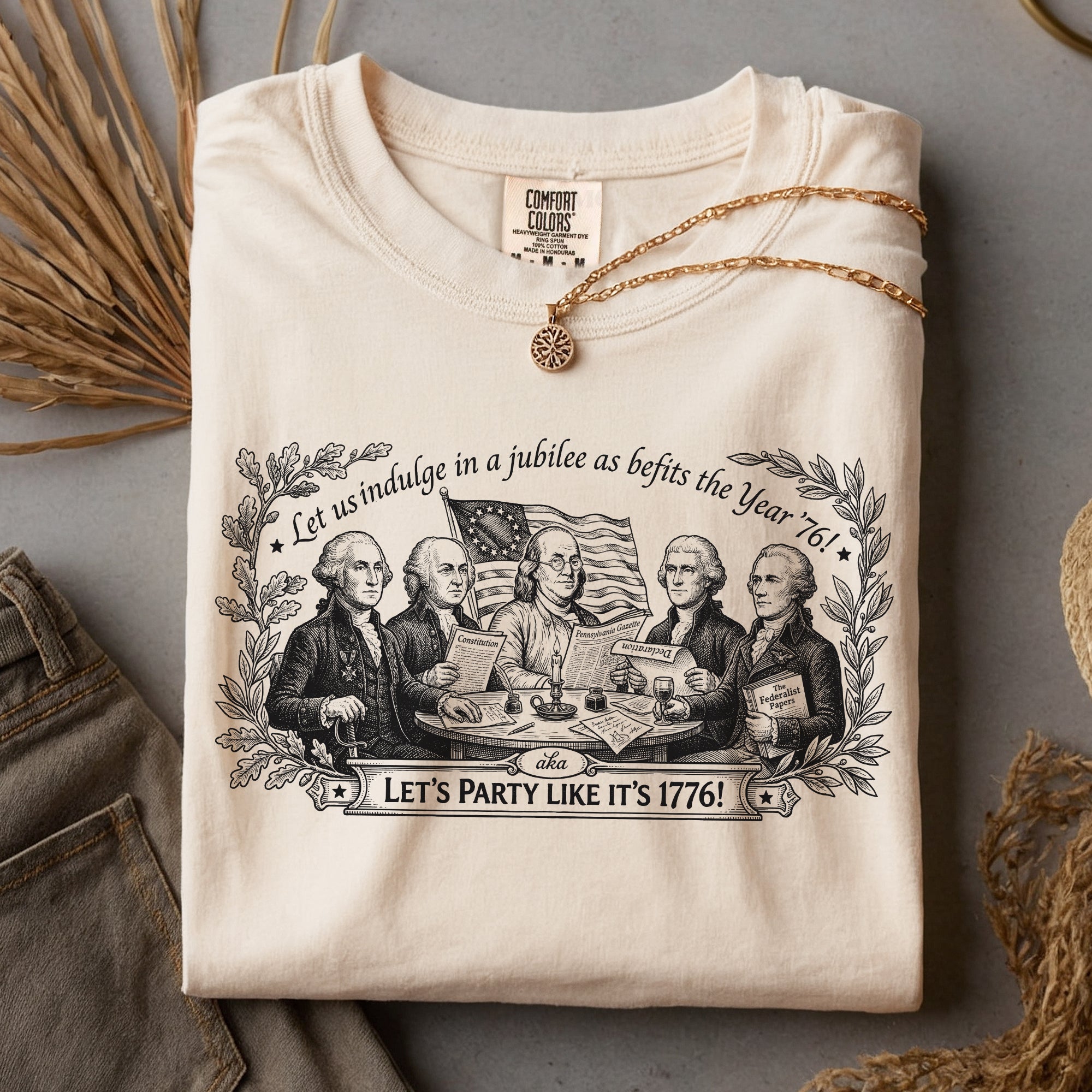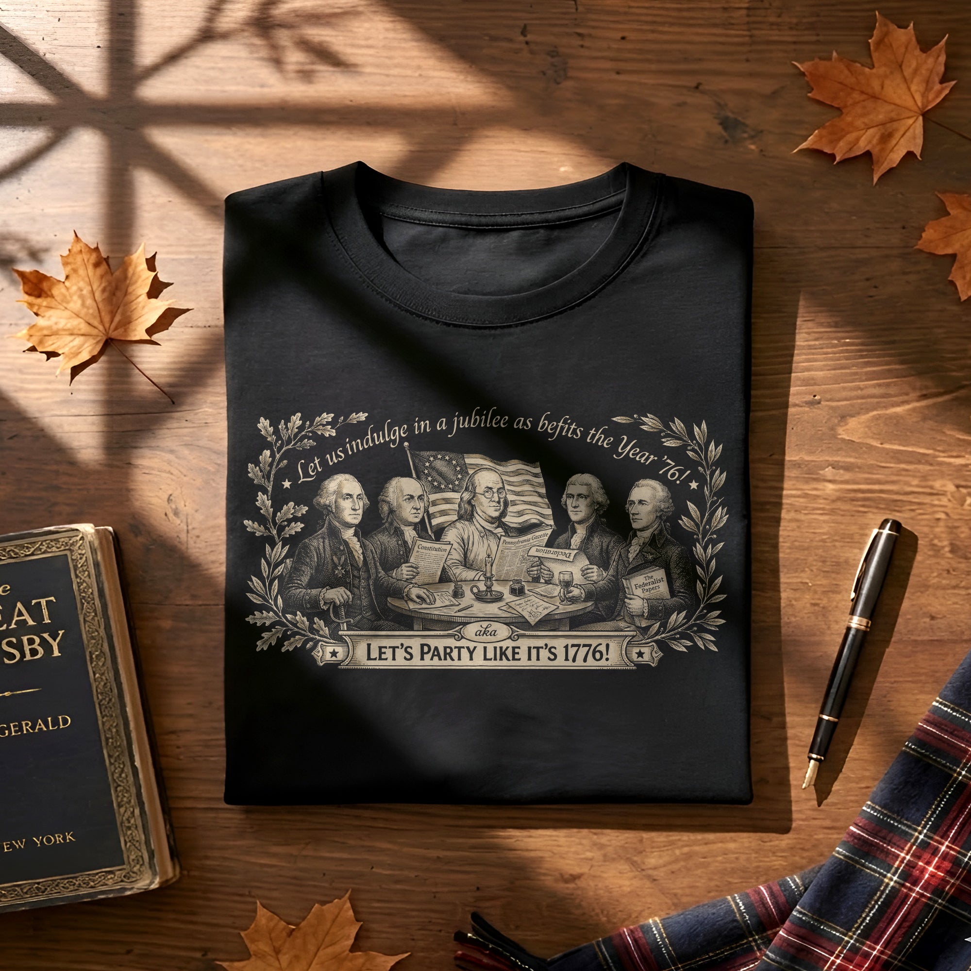 Celebrate America’s 250th anniversary with this classic Founding Fathers vintage T-shirt. Featuring a patriotic historical design and the iconic quote ‘Let’s Party Like It’s 1776,’ this unisex tee is perfect for Independence Day, 4th of July barbecues, patriotic events, and everyday wear. Made from soft, breathable cotton blend fabric for all-day comfort, it offers a relaxed fit suitable for men and women. The distressed vintage print captures the revolutionary spirit of 1776, honoring the birth of the United States. Ideal for history buffs, patriots, and anyone excited about Semiquincentennial celebrations. Machine washable and durable for repeated wear.