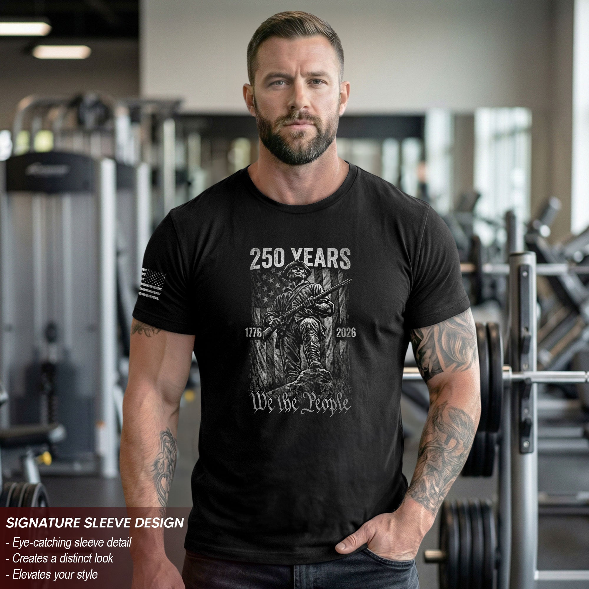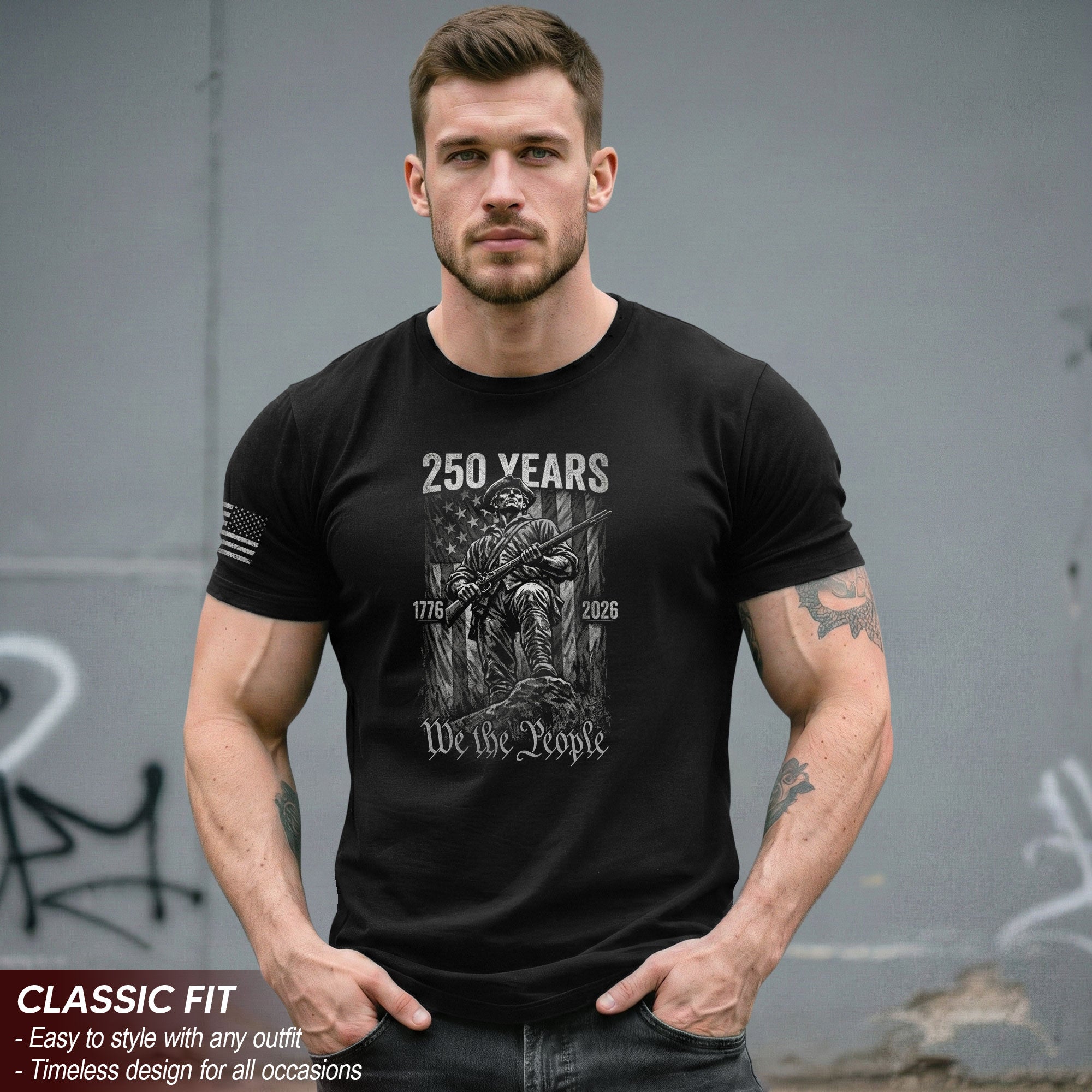 Celebrate America’s 250th anniversary from 1776 to 2026 with this patriotic T-shirt featuring the iconic Minuteman and “We The People” script. Crafted from premium, soft cotton for all-day comfort, this tee honors the courage and sacrifice of the American Revolution heroes. Perfect for history enthusiasts, patriots, and Fourth of July events. The bold graphic design captures the spirit of independence and national pride. Available in multiple sizes for men, women, and unisex fit. Machine washable and durable for everyday wear. Ideal for barbecues, parades, veterans’ events, or casual outings. Show your American spirit with this limited-edition tribute to 250 years of freedom.