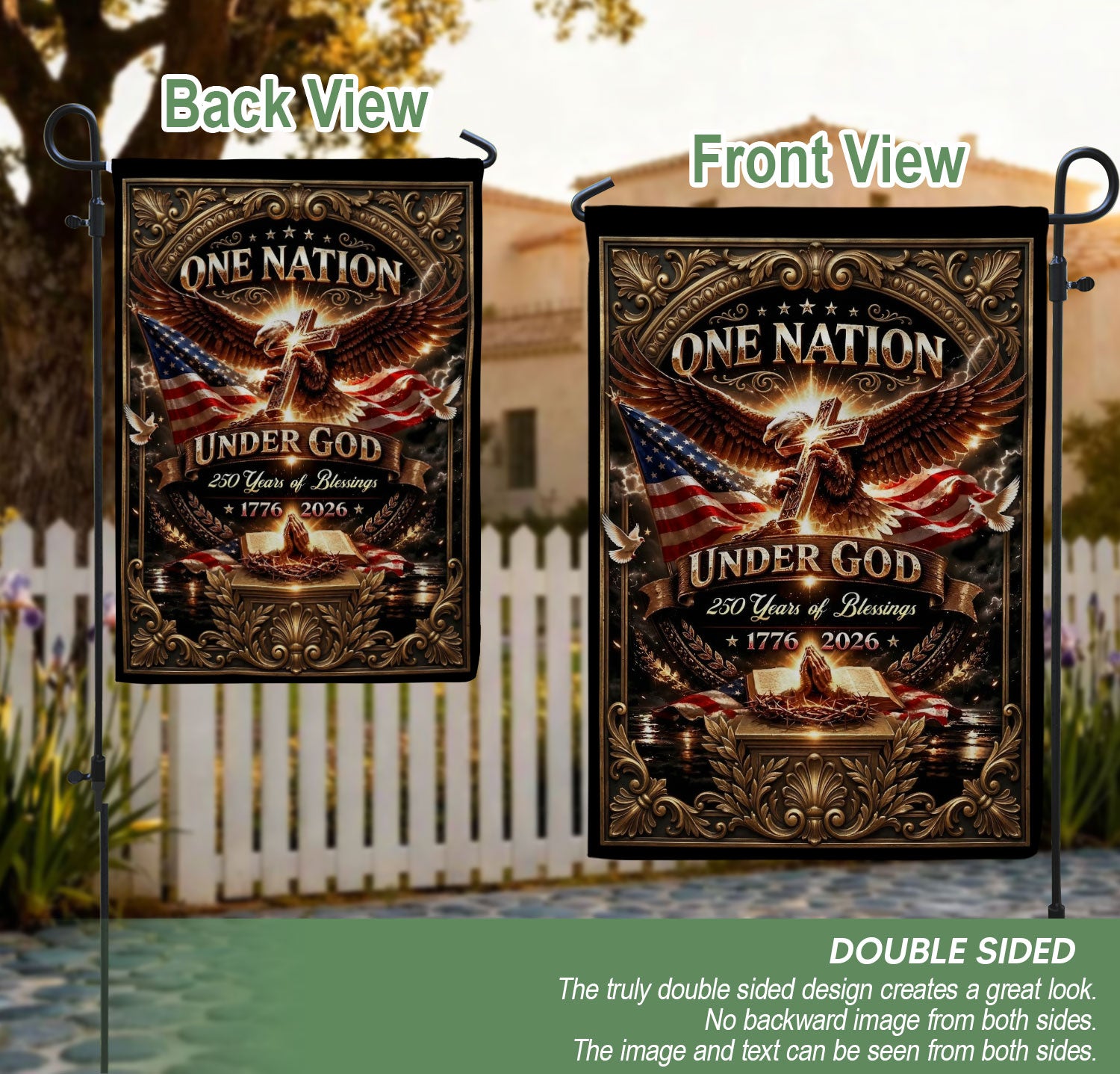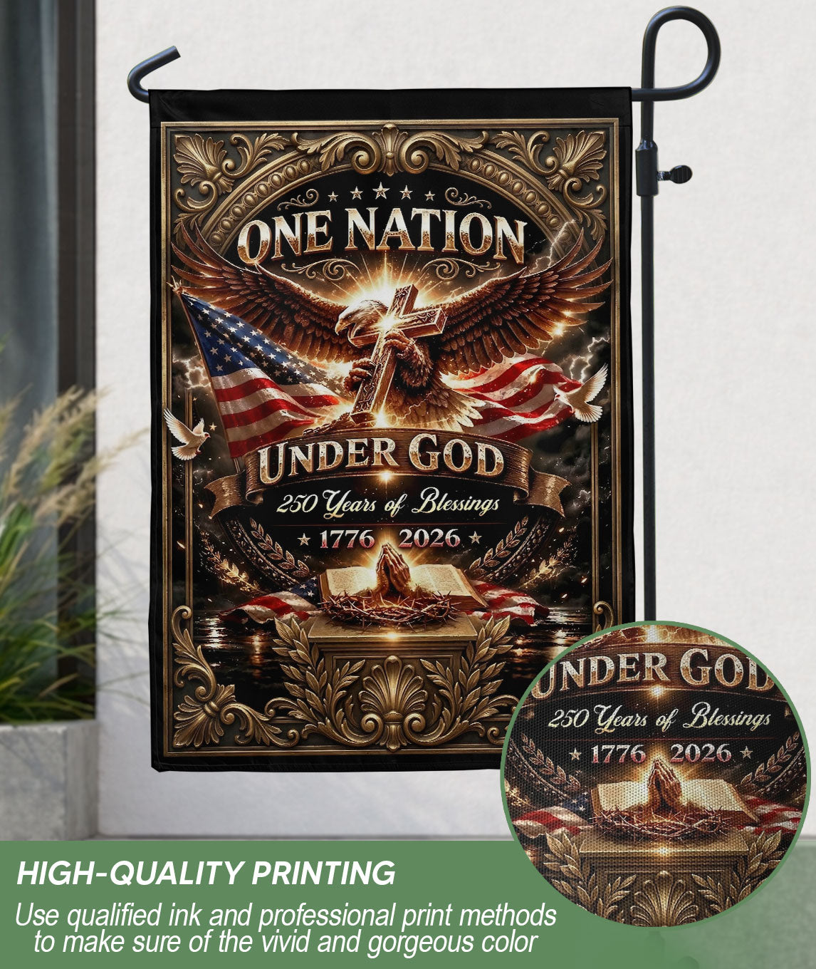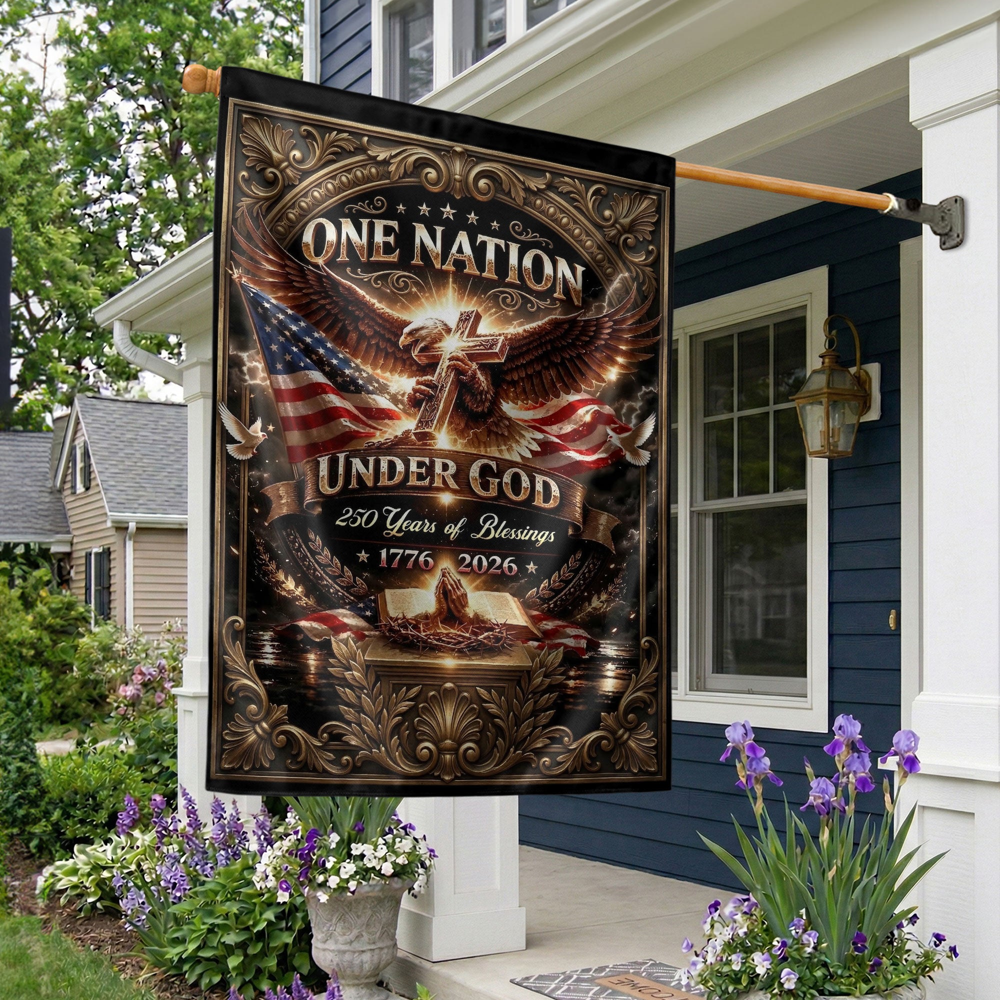 Celebrate 250 years of American blessings from 1776 to 2026 with this Christian One Nation Under God USA house flag. Featuring a powerful eagle and cross design, this patriotic faith banner symbolizes strength, divine protection, and national gratitude. Crafted for durability and vibrant outdoor display, it’s ideal for porches, gardens, or homes showing pride in faith and freedom. Perfect for Independence Day, Memorial Day, or everyday patriotic décor. Double-sided printing ensures clear visibility from both sides, with premium polyester material resistant to weather and fading.
