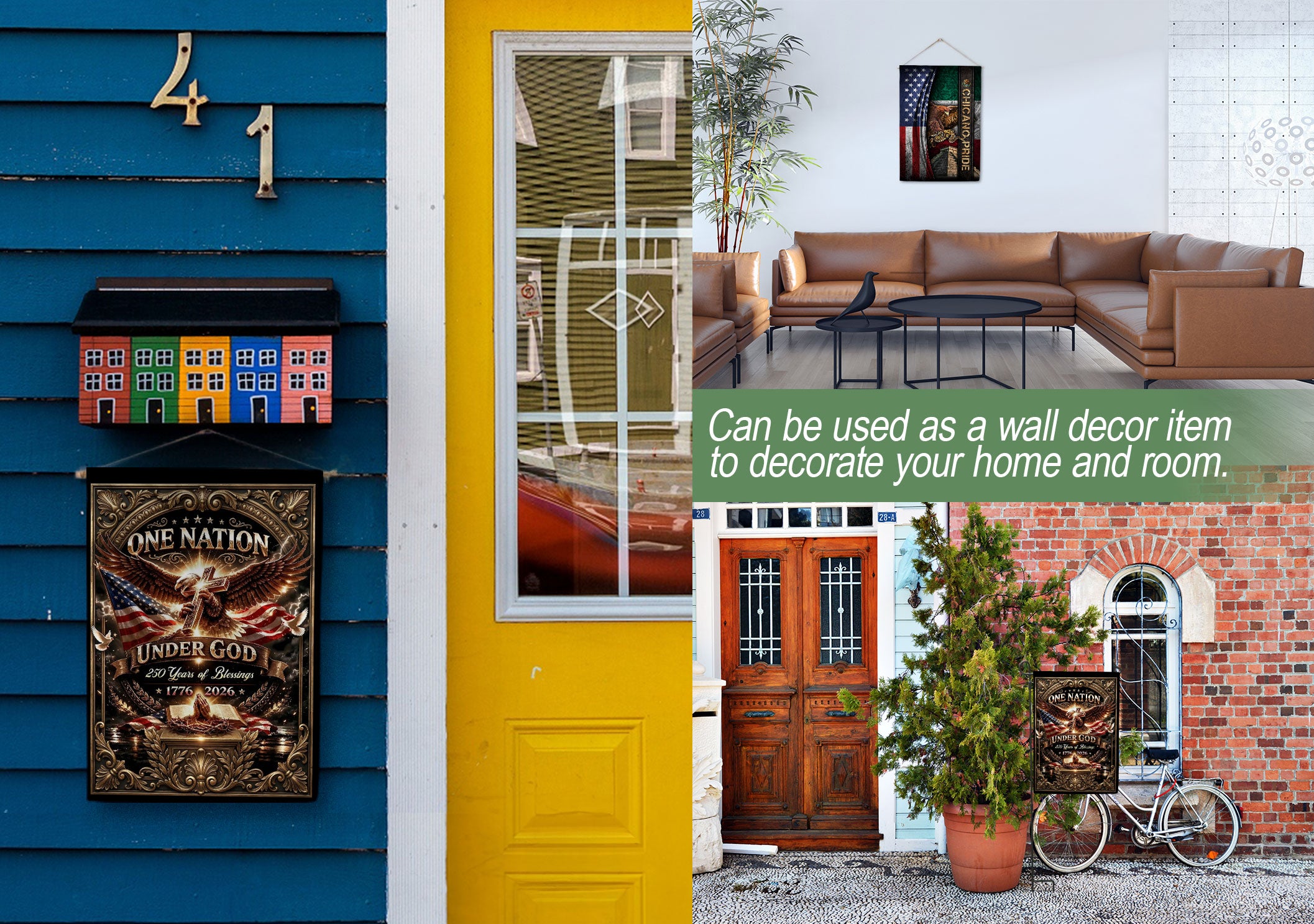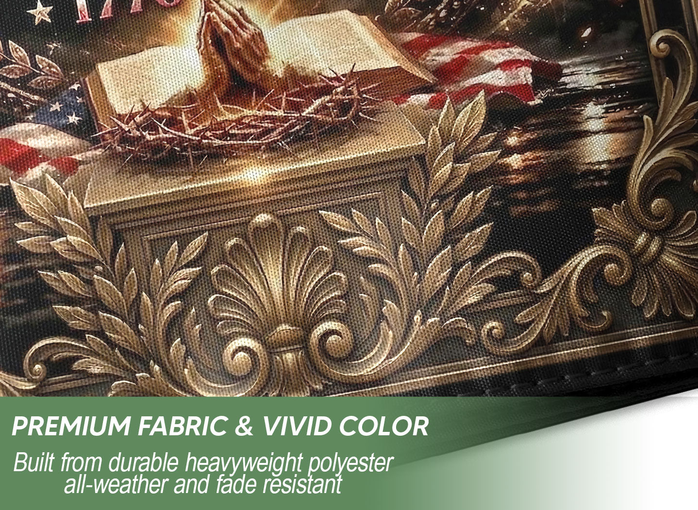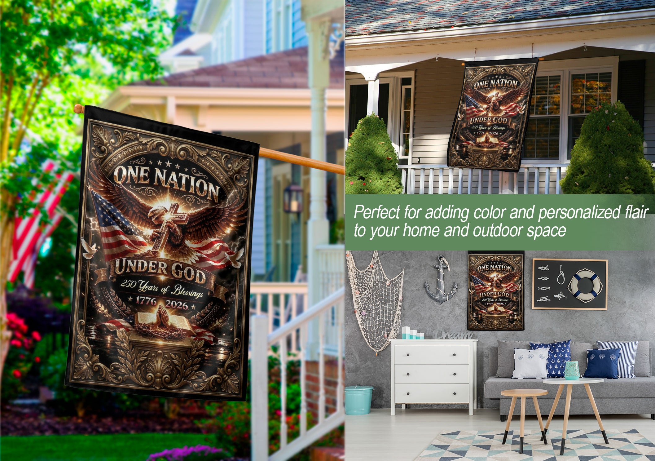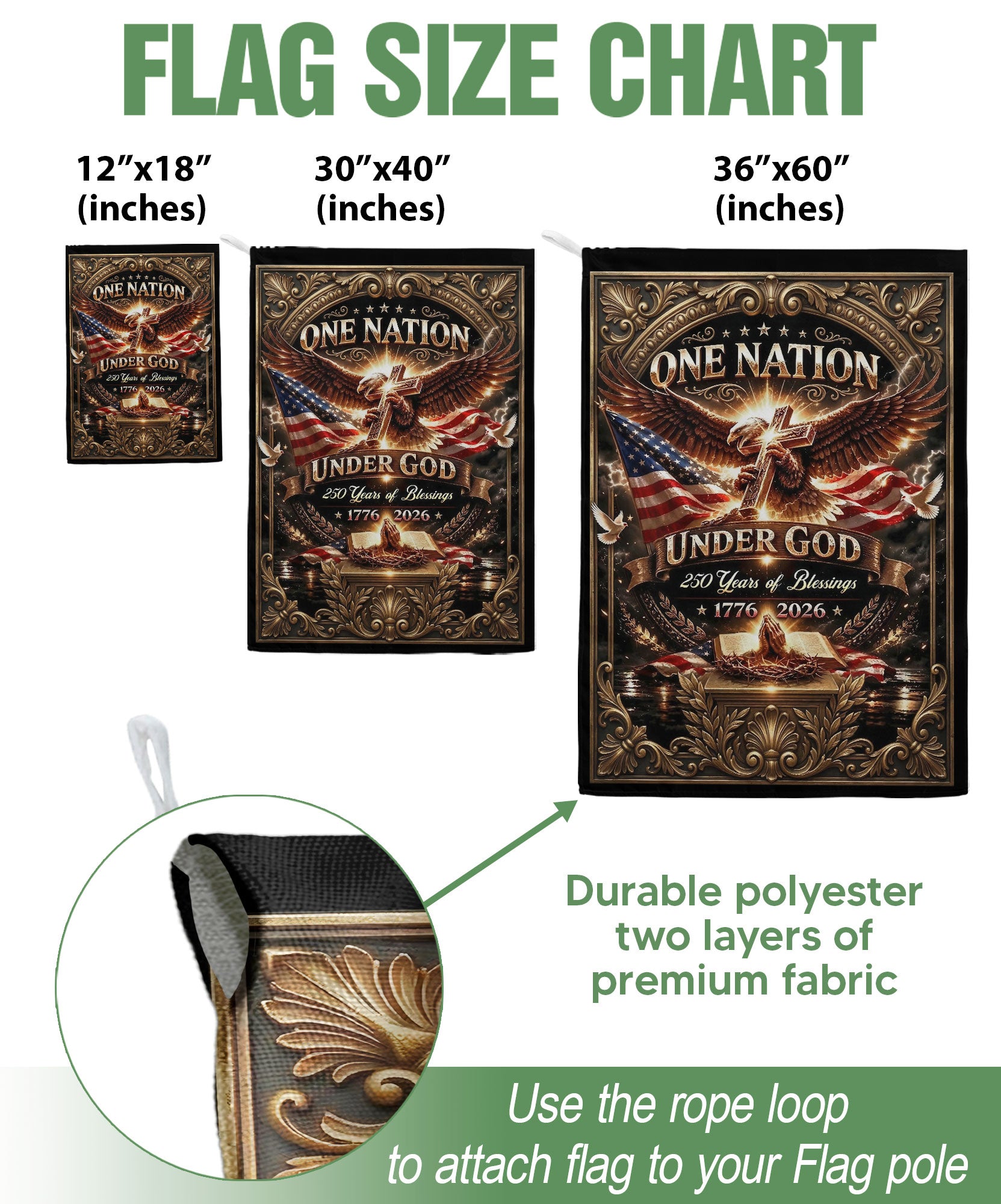 Celebrate 250 years of American blessings from 1776 to 2026 with this Christian One Nation Under God USA house flag. Featuring a powerful eagle and cross design, this patriotic faith banner symbolizes strength, divine protection, and national gratitude. Crafted for durability and vibrant outdoor display, it’s ideal for porches, gardens, or homes showing pride in faith and freedom. Perfect for Independence Day, Memorial Day, or everyday patriotic décor. Double-sided printing ensures clear visibility from both sides, with premium polyester material resistant to weather and fading.