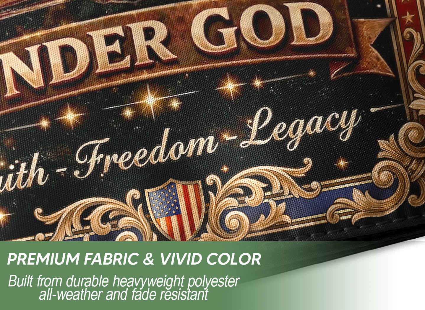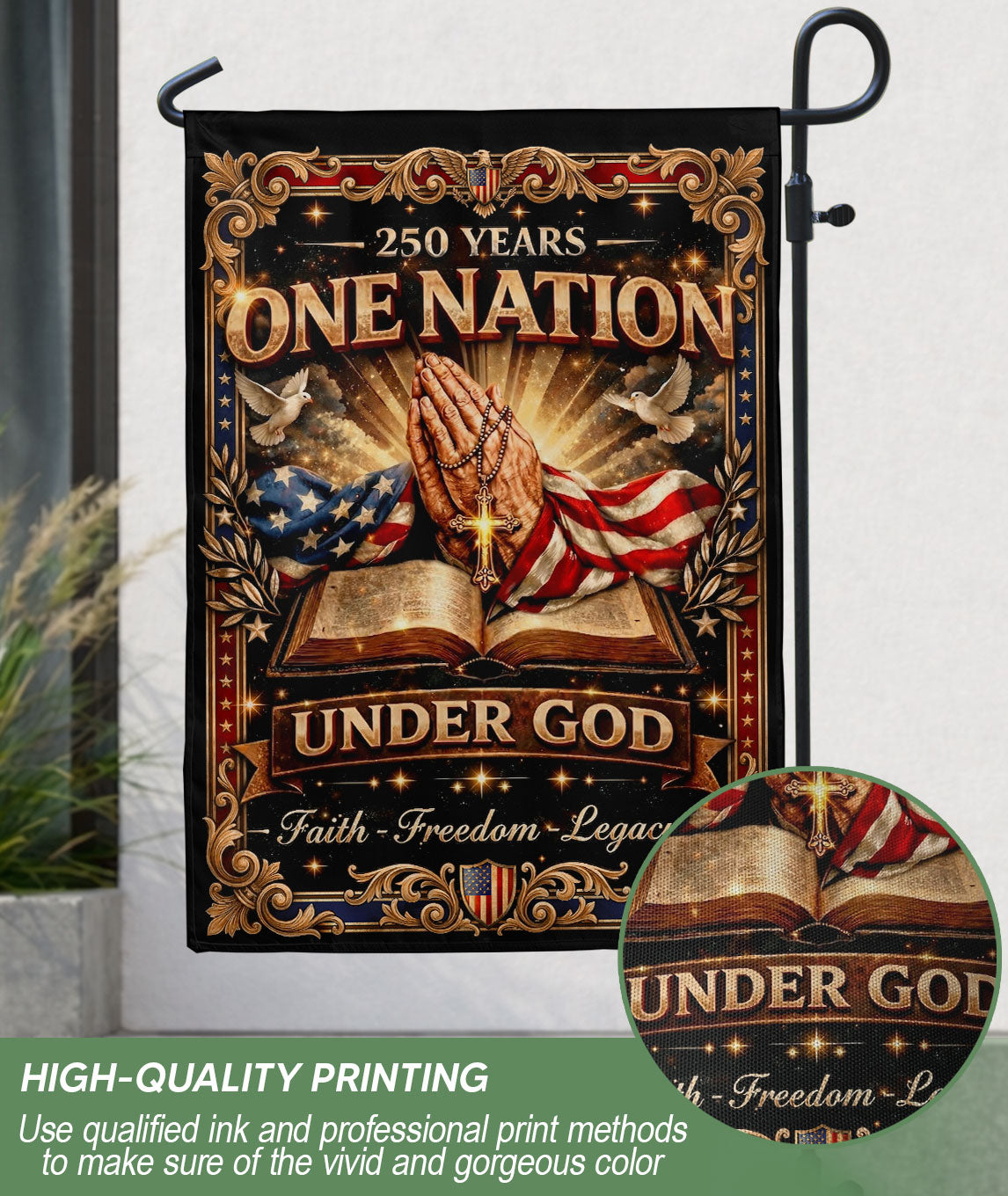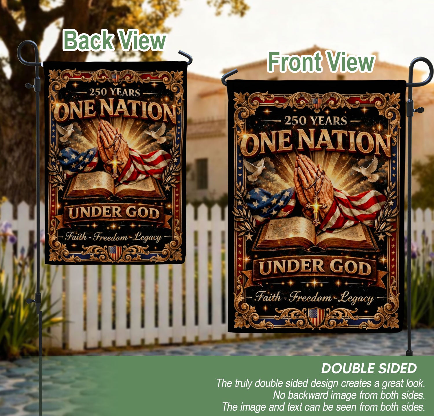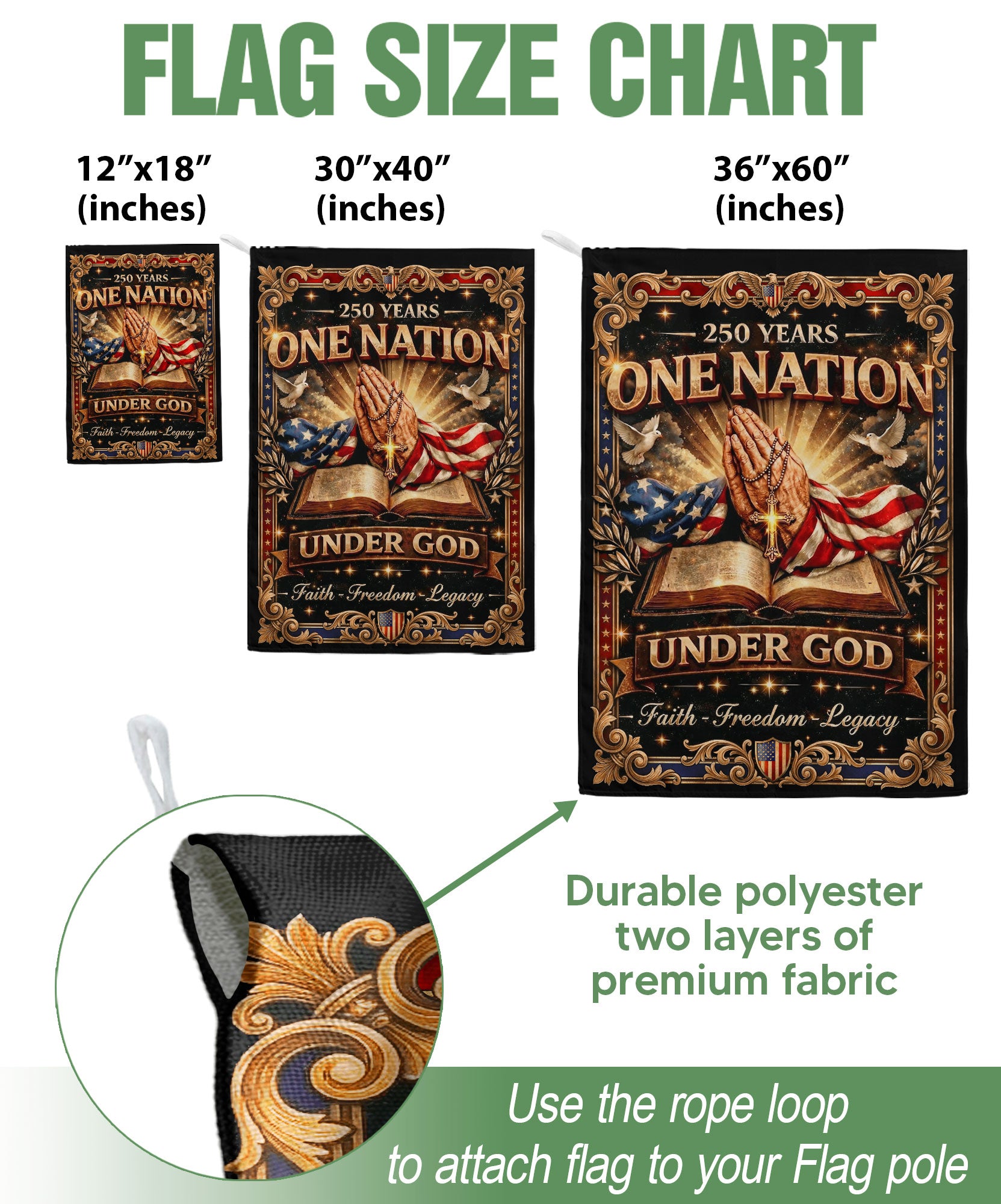 Celebrate America’s 250th anniversary with this inspiring Christian house flag featuring ‘One Nation Under God.’ The design showcases a prayerful scene with an open Bible, symbolizing faith, freedom, and patriotic unity. Perfect for displaying outside your home to honor the nation’s journey, this durable house flag combines religious devotion with American pride. Crafted for outdoor use, it withstands weather while proudly waving your values. Ideal for patriots, churches, and faith-based celebrations.