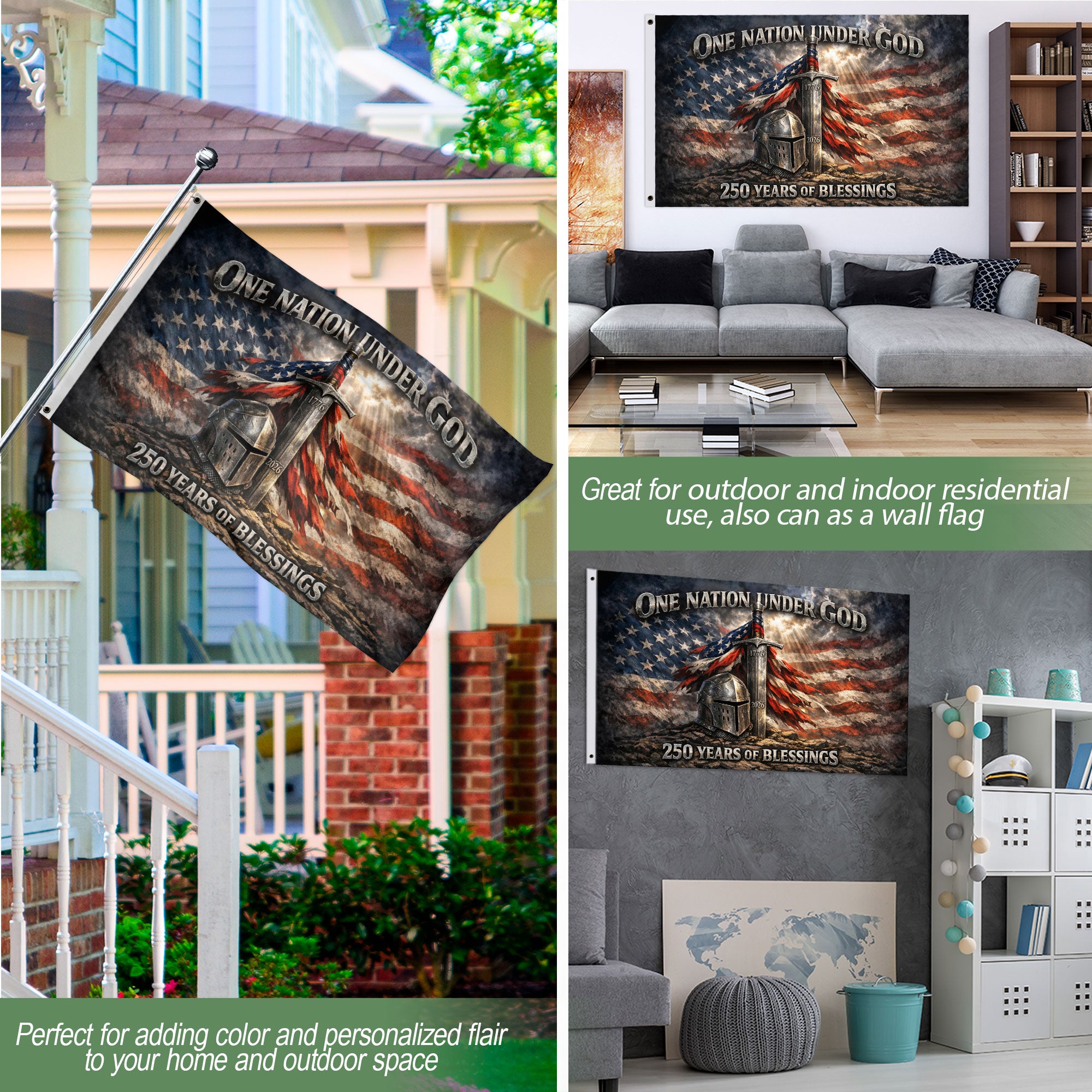 Celebrate America’s 250th birthday with this Christian patriotic One Nation Under God USA double-sided flag. The design features ‘250 Years of Blessings,’ honoring the nation’s rich history, spiritual heritage, and enduring spirit of unity and devotion. Perfect for outdoor display on poles, porches, gardens, or patios, this flag serves as a meaningful tribute to 250 years of American blessings and foundational values. Crafted from high-quality, durable polyester fabric with reinforced stitching, it withstands wind, rain, and sun exposure for long-lasting performance. Double-sided printing ensures the vibrant graphics and bold colors are visible from both sides, making it ideal for homes, events, or patriotic collections. Show your faith and patriotism on Independence Day, Fourth of July, Memorial Day, or every day. Easy to hang with grommets or pole sleeves, this weather-resistant flag combines spiritual symbolism with American pride.