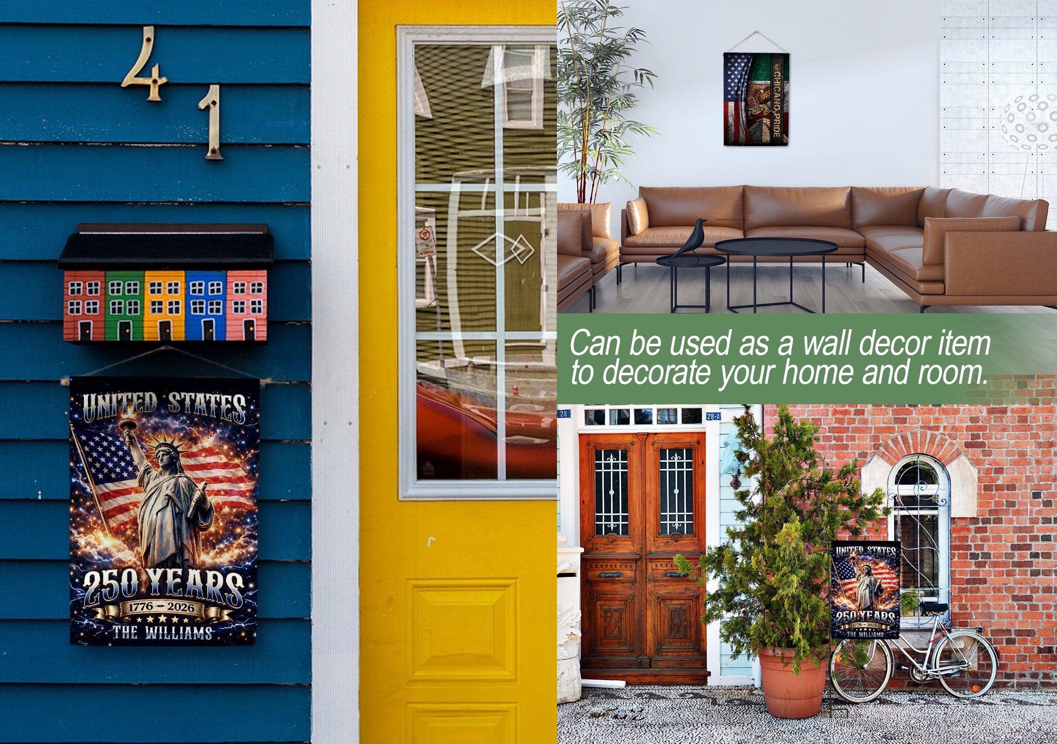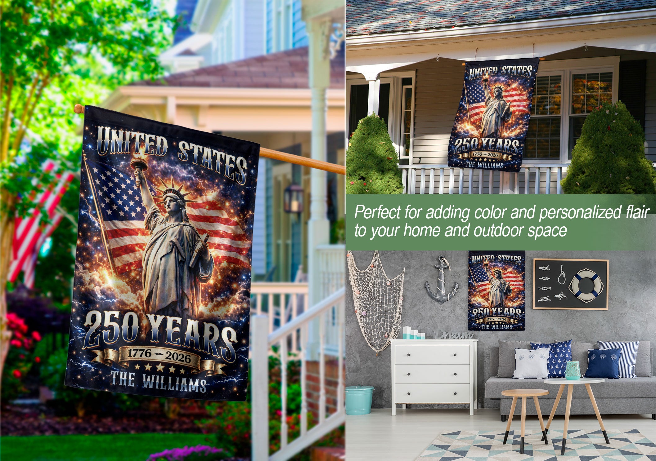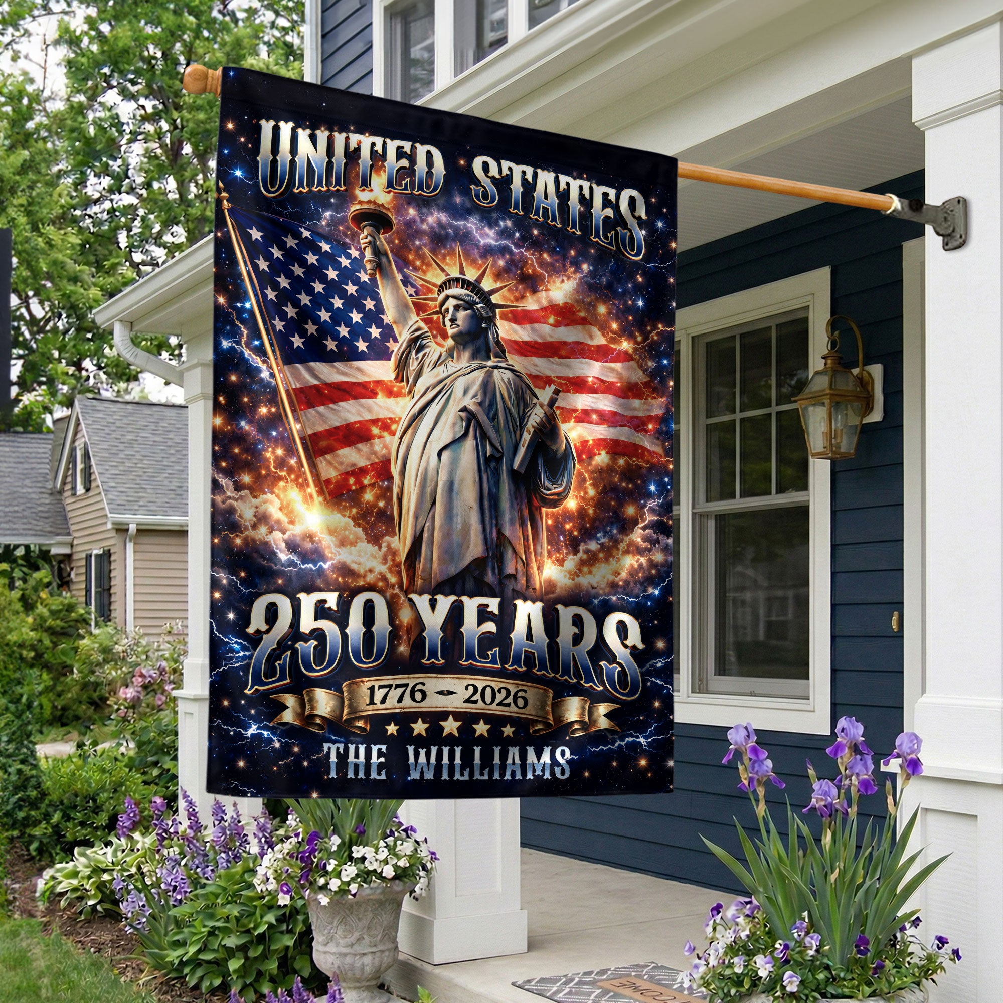 Celebrate America’s 250th anniversary with this personalized garden flag featuring the Statue of Liberty, USA flag, and vibrant fireworks. Customizable with your family name, it spans from 1776 to 2026, honoring the nation’s founding and historic milestone. Made for outdoor display, this durable patriotic flag shows family pride in gardens, yards, or porches. Weather-resistant material ensures long-lasting vibrancy. Ideal for Independence Day, historical commemorations, or everyday American spirit display.