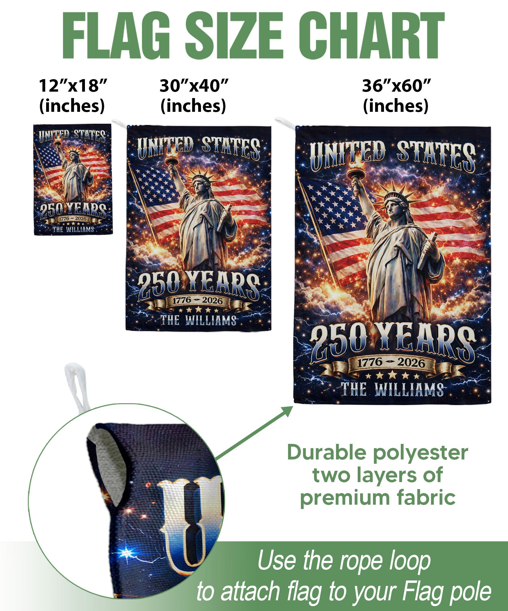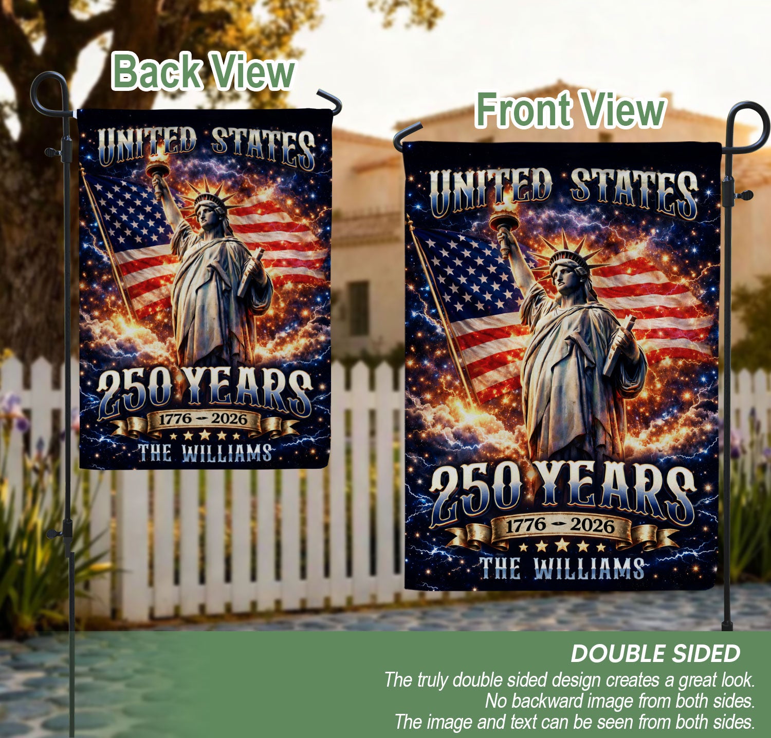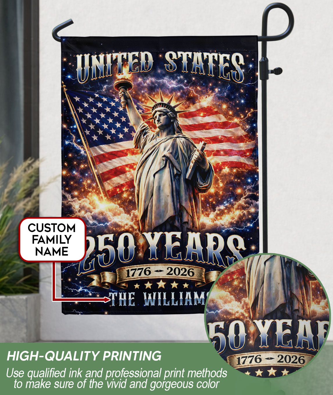 Custom Family Name 250th Anniversary Garden Flag Statue of Liberty USA Flag 1776-2026