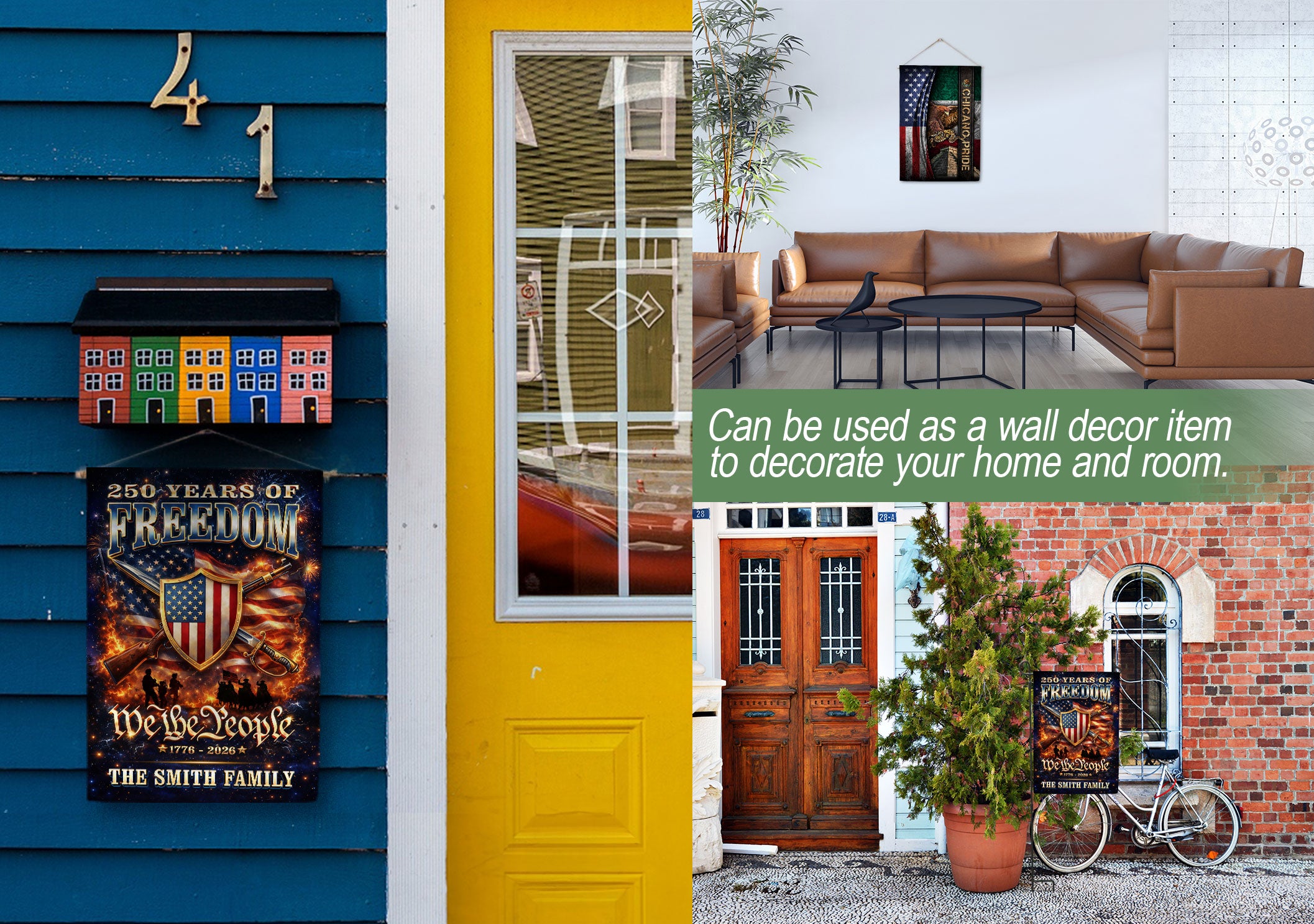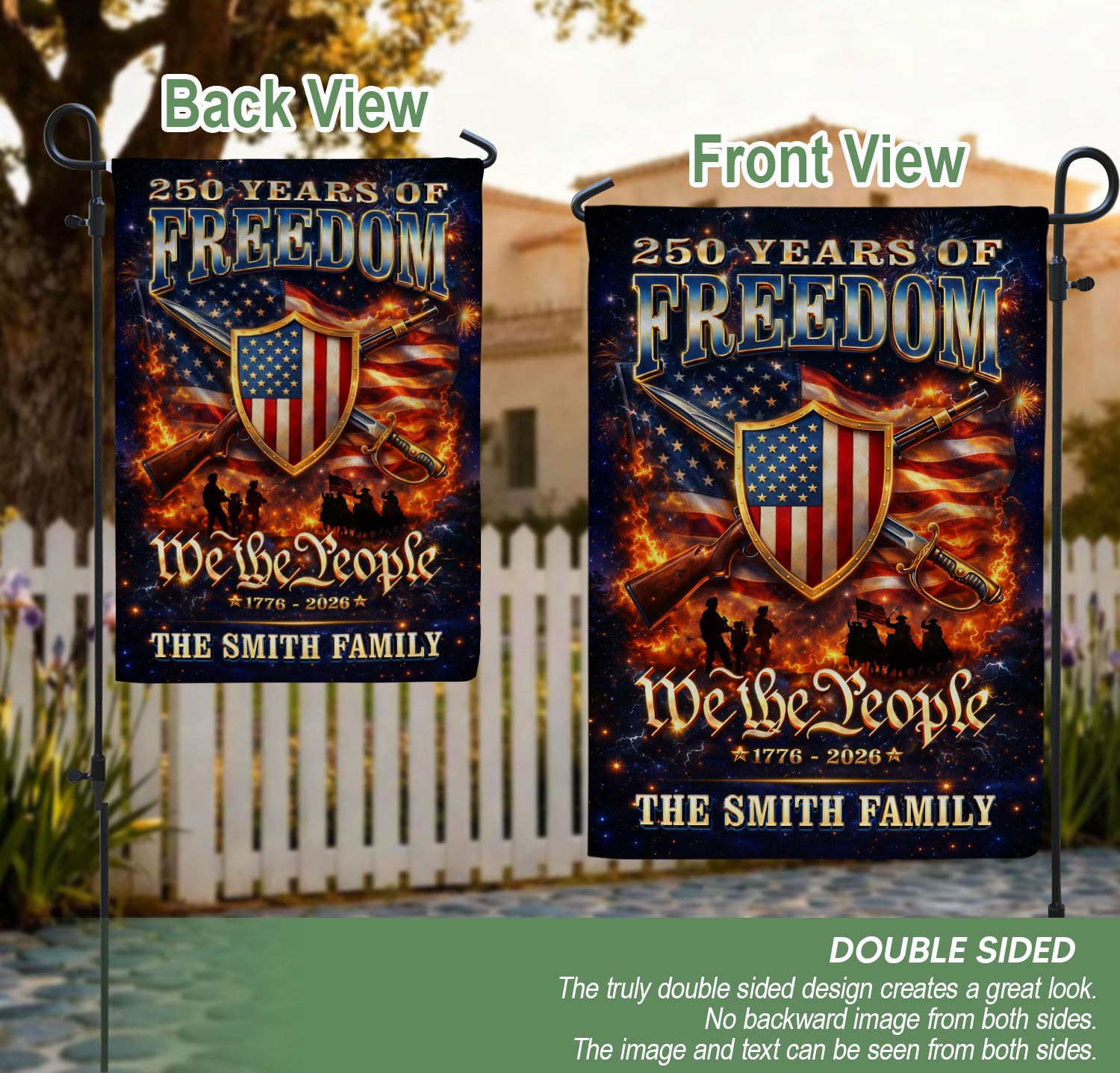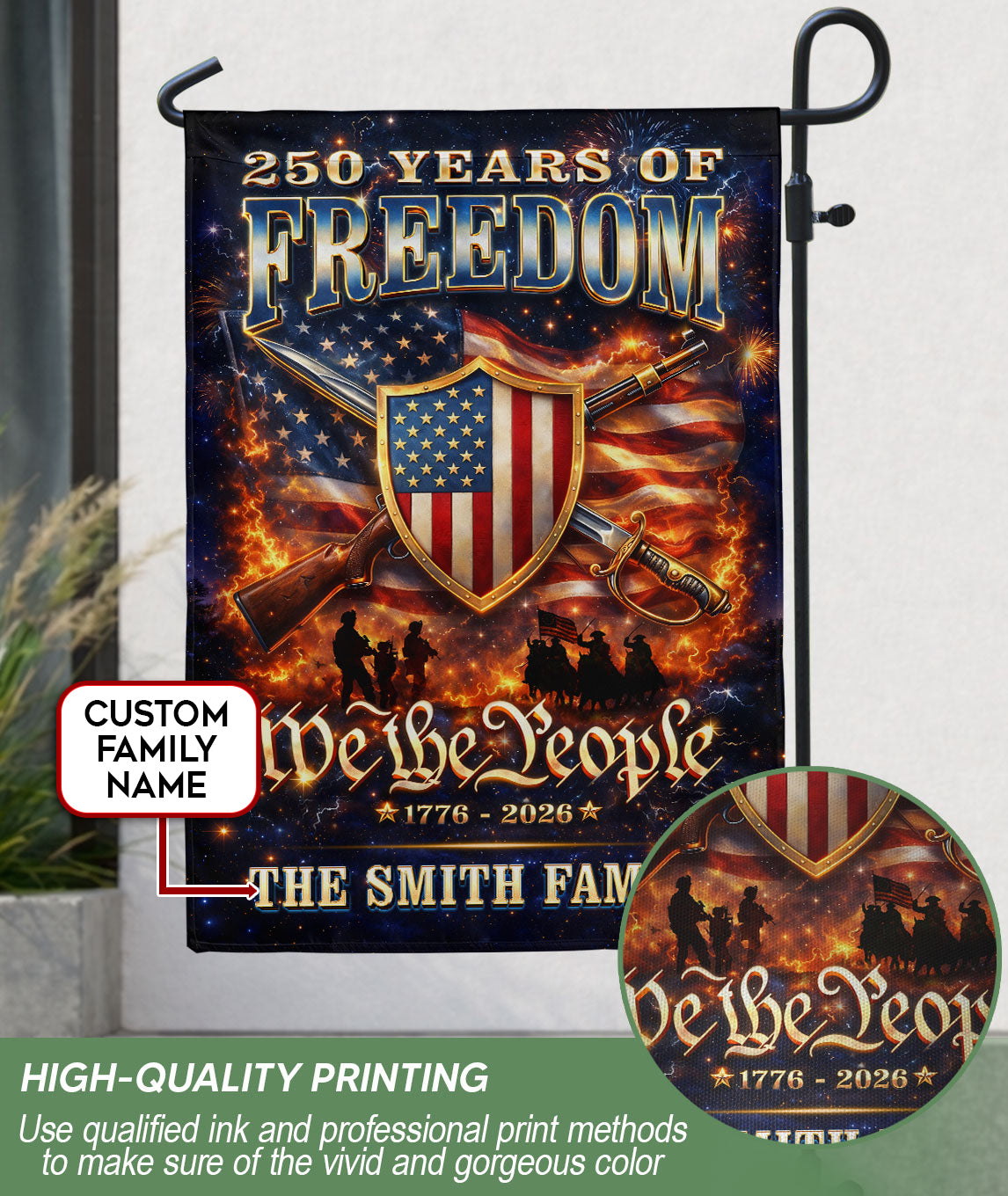 Celebrate America’s 250th anniversary of independence from 1776 to 2026 with this custom family name garden flag. Featuring a bold patriotic design with the American flag, ‘We The People’ message, and your personalized family name, this flag showcases national pride in your yard, porch, or garden. Crafted from durable, weather-resistant fabric, it withstands outdoor elements for long-lasting display. Vibrant colors and high-quality printing ensure it stands out year-round, perfect for Fourth of July, Memorial Day, or everyday patriotism. Easy to hang with a standard garden flag pole (not included). Personalize it with your family name for a unique touch.