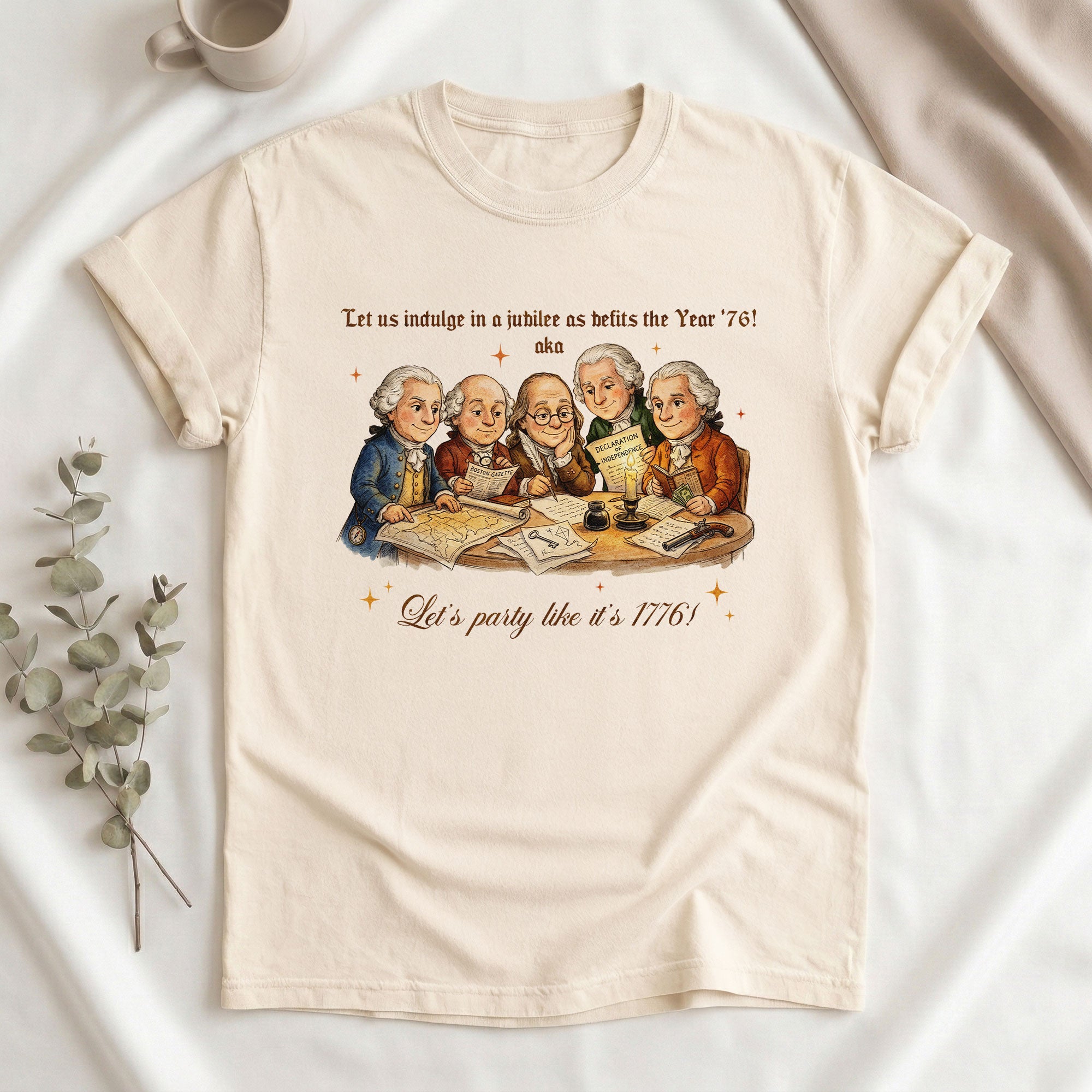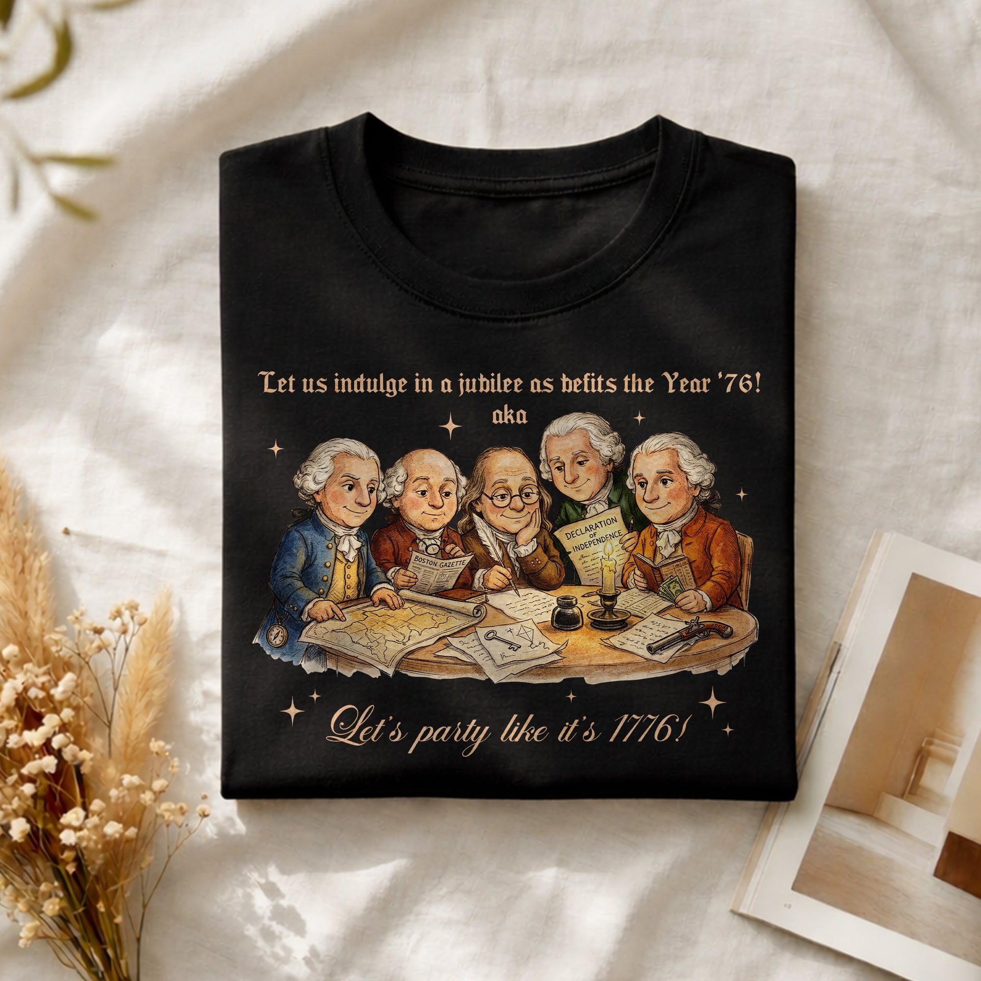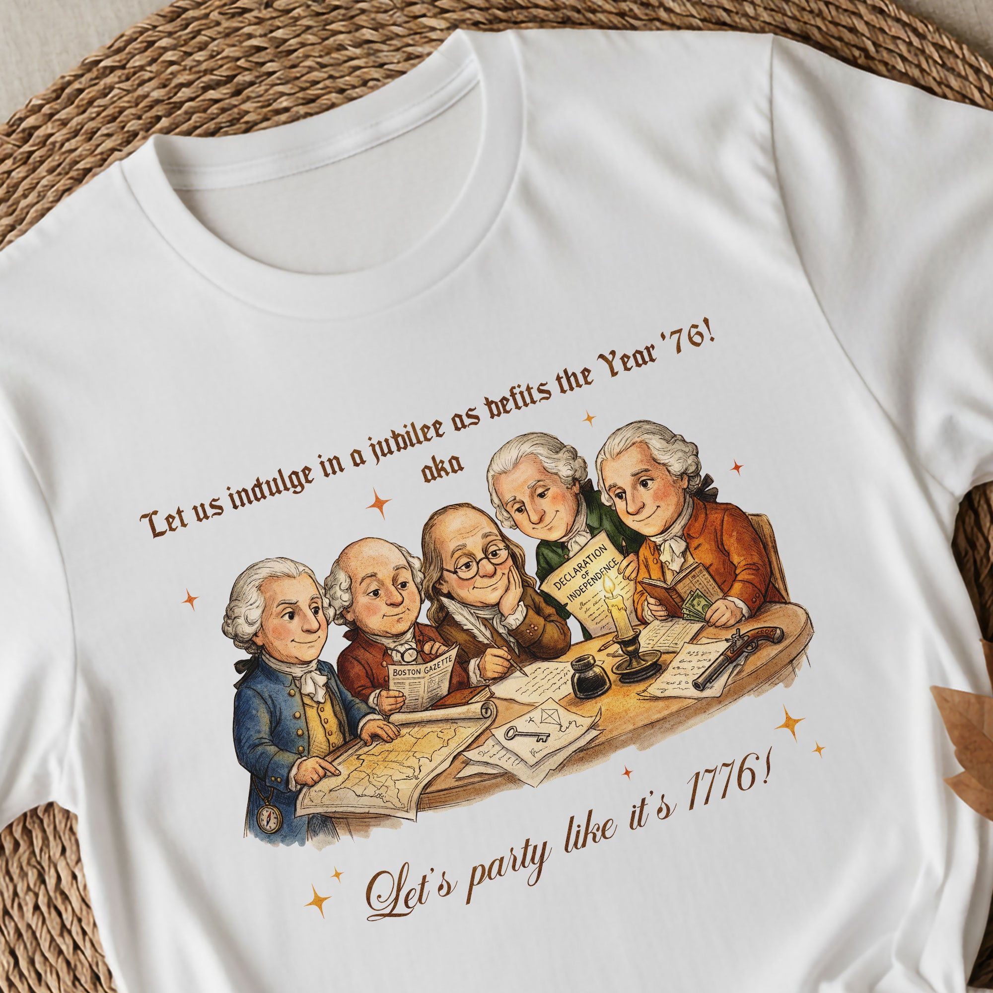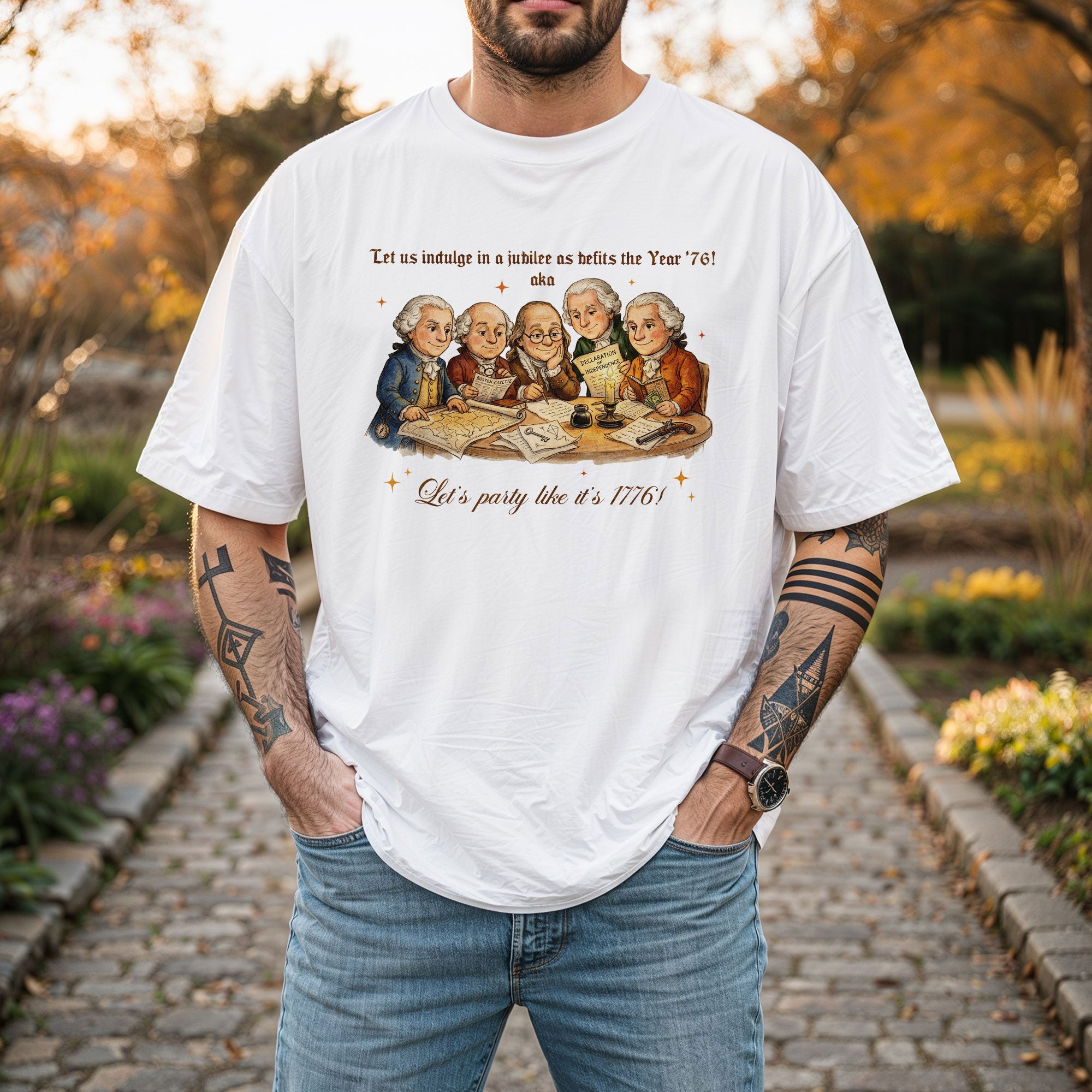 Celebrate America’s 250th anniversary with this vintage-style 1776 Founding Fathers T-shirt. Featuring a classic patriotic illustration and the fun quote “Let’s party like it’s 1776,” this soft, comfortable tee is ideal for Independence Day, 4th of July barbecues, historical events, or everyday patriotic wear. Crafted from high-quality, breathable cotton blend fabric for all-day comfort, it offers a relaxed fit suitable for men, women, and history enthusiasts. Perfect for showing your American pride during the semiquincentennial celebrations or any time you want to channel revolutionary spirit. Machine washable and durable for repeated wear.