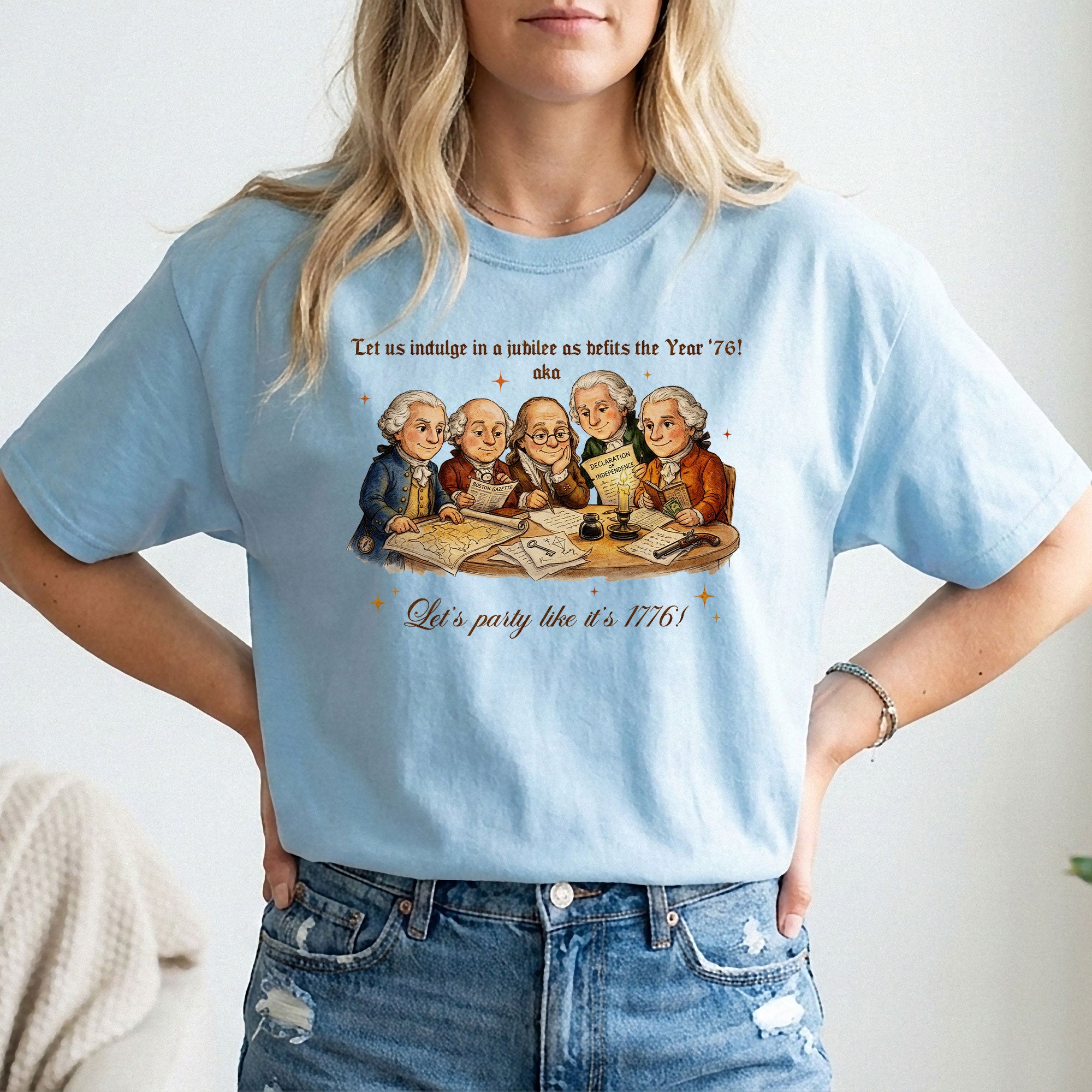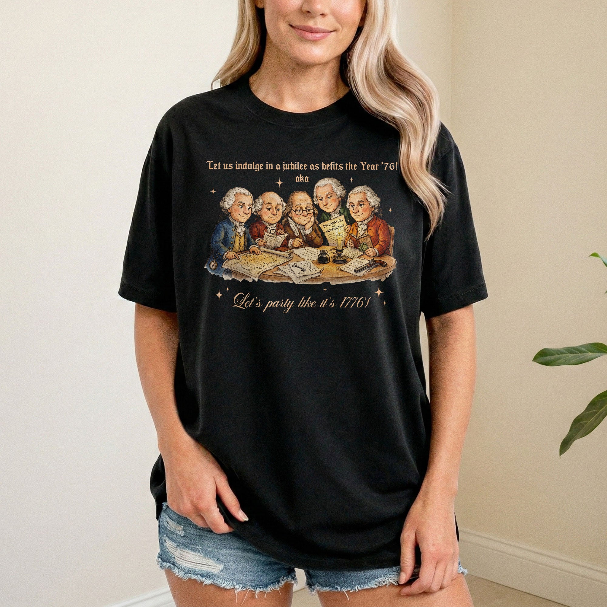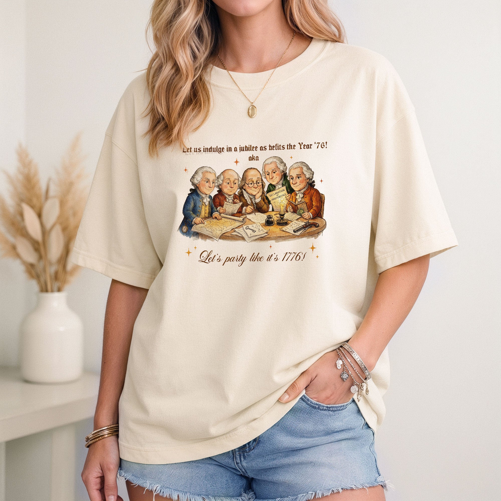 Celebrate America’s 250th anniversary with this vintage-style 1776 Founding Fathers T-shirt. Featuring a classic patriotic illustration and the fun quote “Let’s party like it’s 1776,” this soft, comfortable tee is ideal for Independence Day, 4th of July barbecues, historical events, or everyday patriotic wear. Crafted from high-quality, breathable cotton blend fabric for all-day comfort, it offers a relaxed fit suitable for men, women, and history enthusiasts. Perfect for showing your American pride during the semiquincentennial celebrations or any time you want to channel revolutionary spirit. Machine washable and durable for repeated wear.