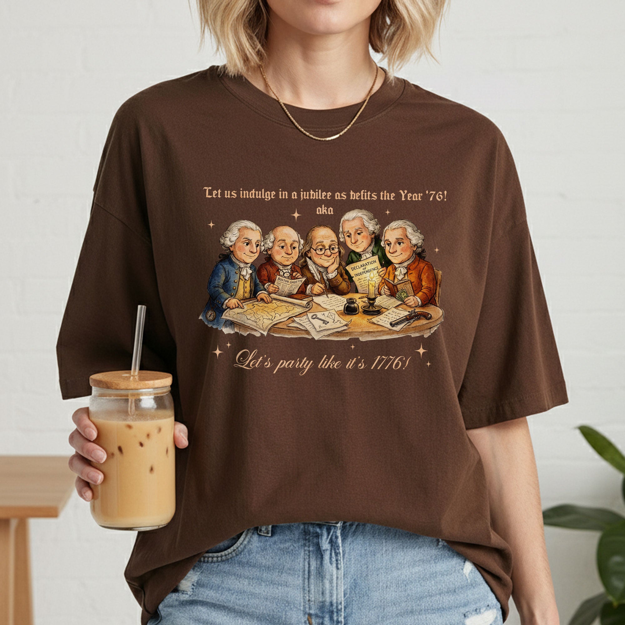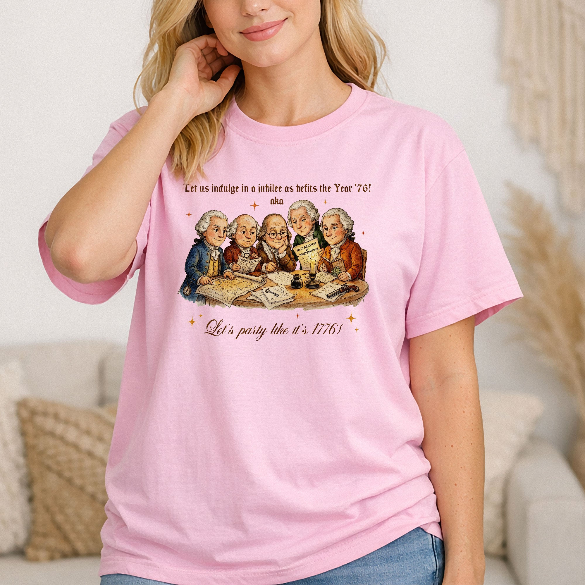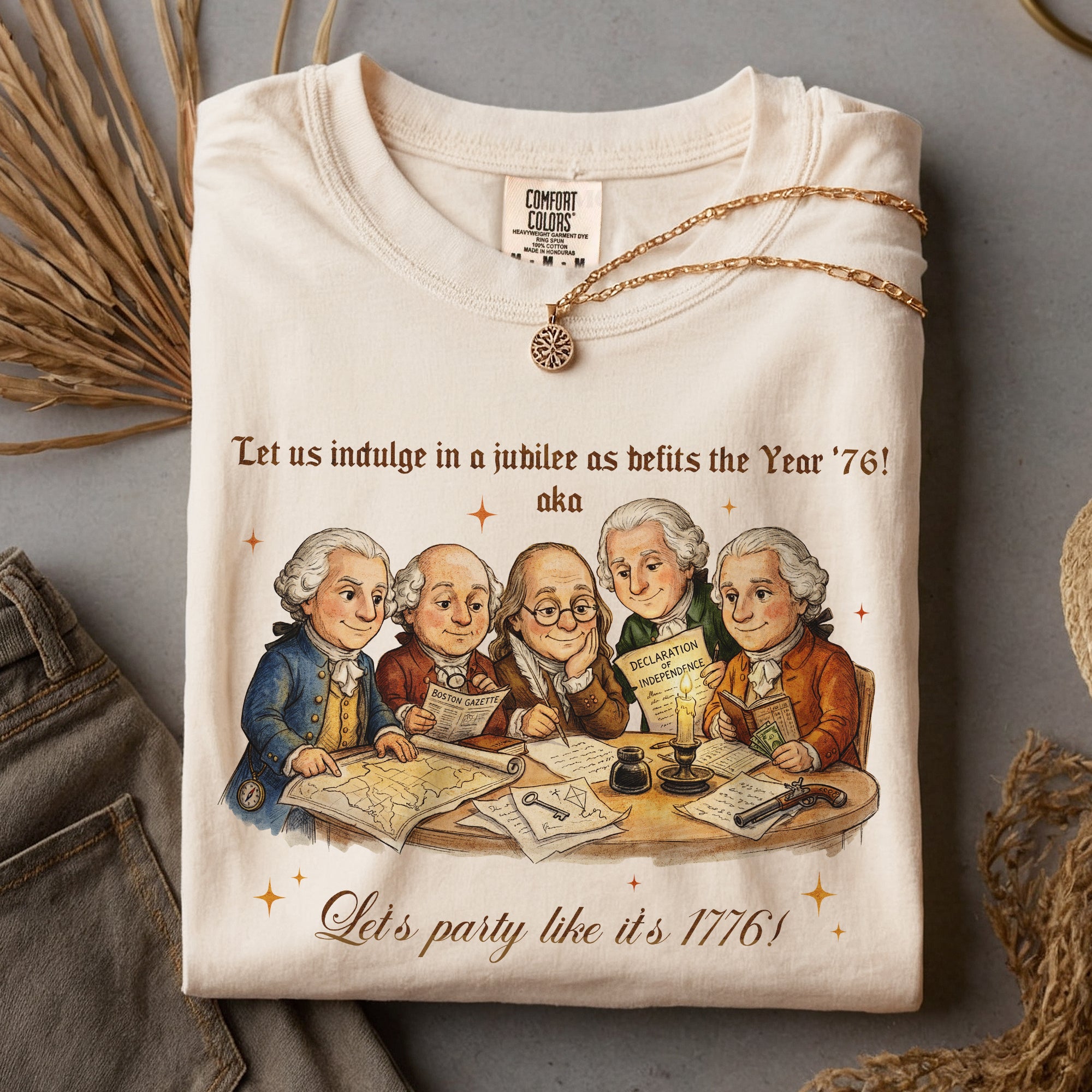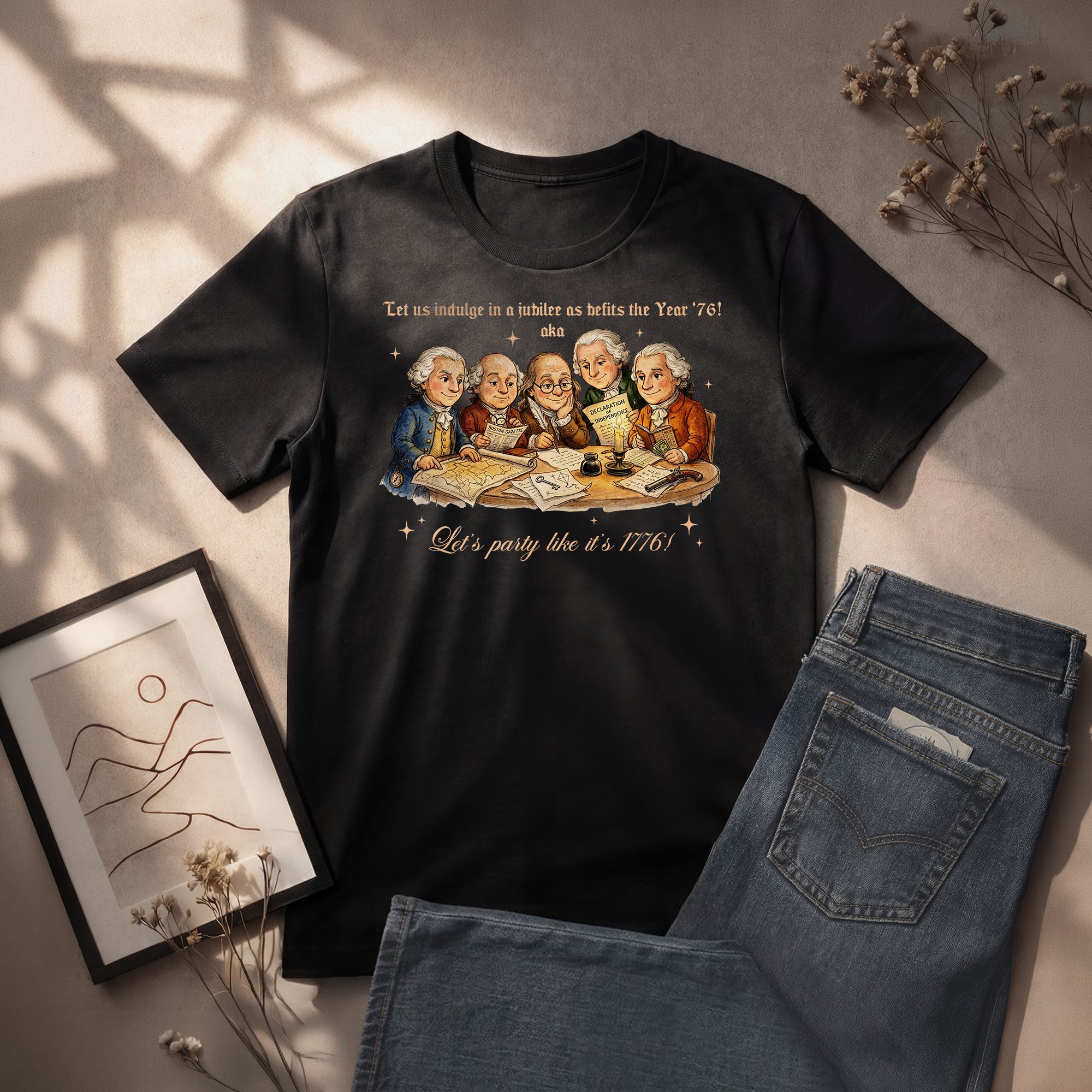 Celebrate America’s 250th anniversary with this vintage-style 1776 Founding Fathers T-shirt. Featuring a classic patriotic illustration and the fun quote “Let’s party like it’s 1776,” this soft, comfortable tee is ideal for Independence Day, 4th of July barbecues, historical events, or everyday patriotic wear. Crafted from high-quality, breathable cotton blend fabric for all-day comfort, it offers a relaxed fit suitable for men, women, and history enthusiasts. Perfect for showing your American pride during the semiquincentennial celebrations or any time you want to channel revolutionary spirit. Machine washable and durable for repeated wear.