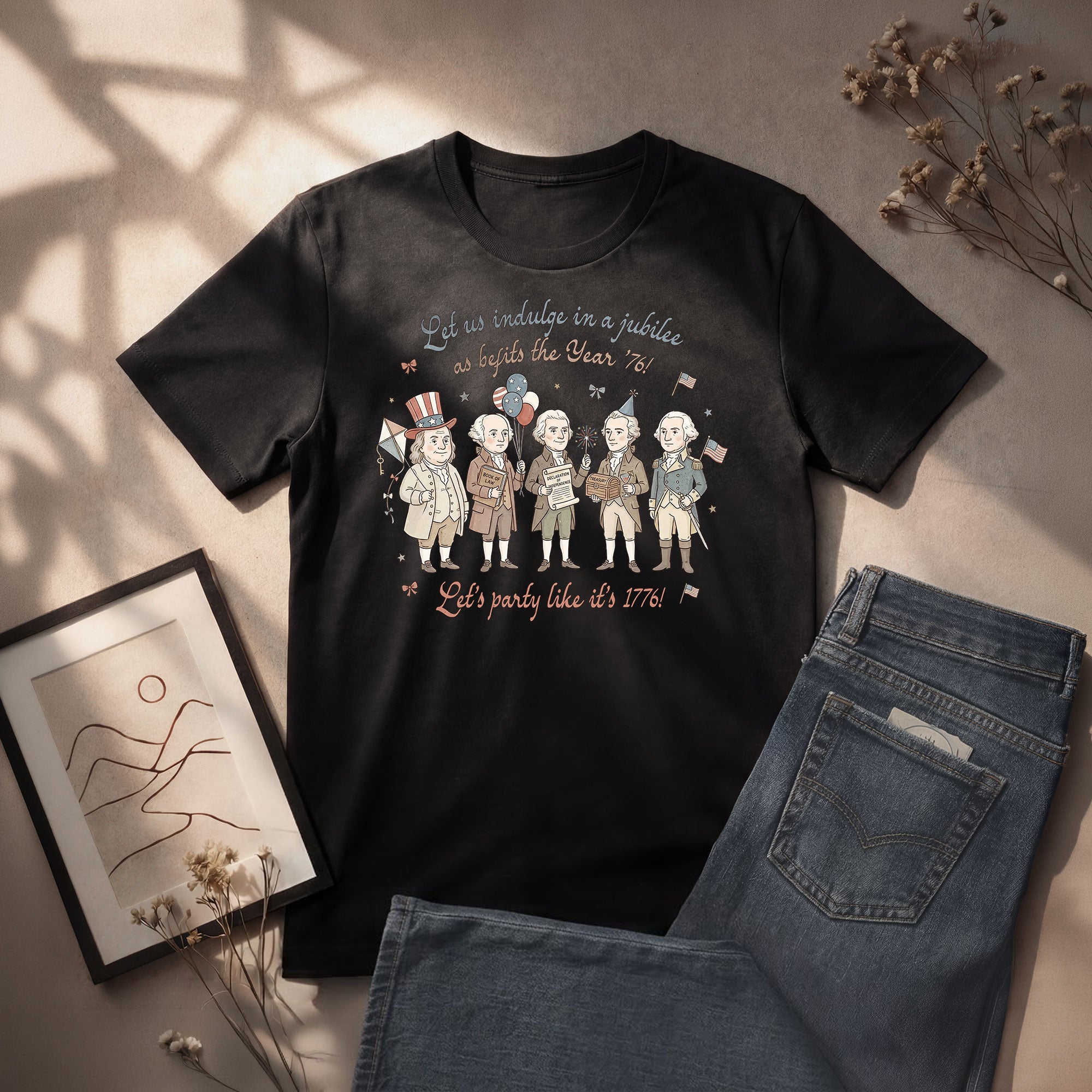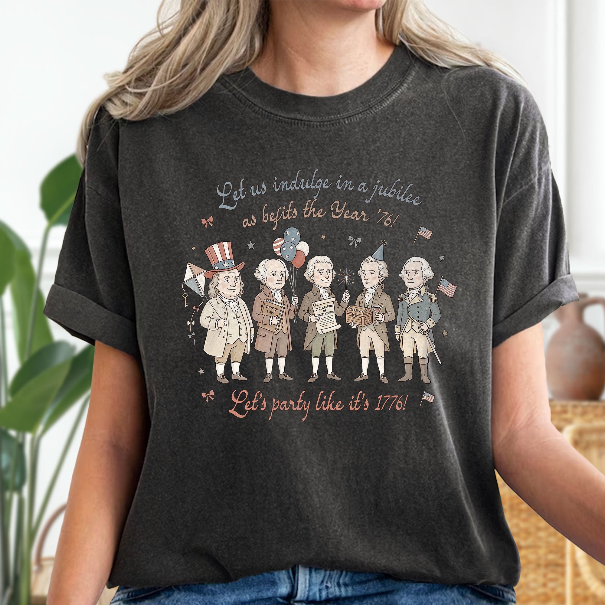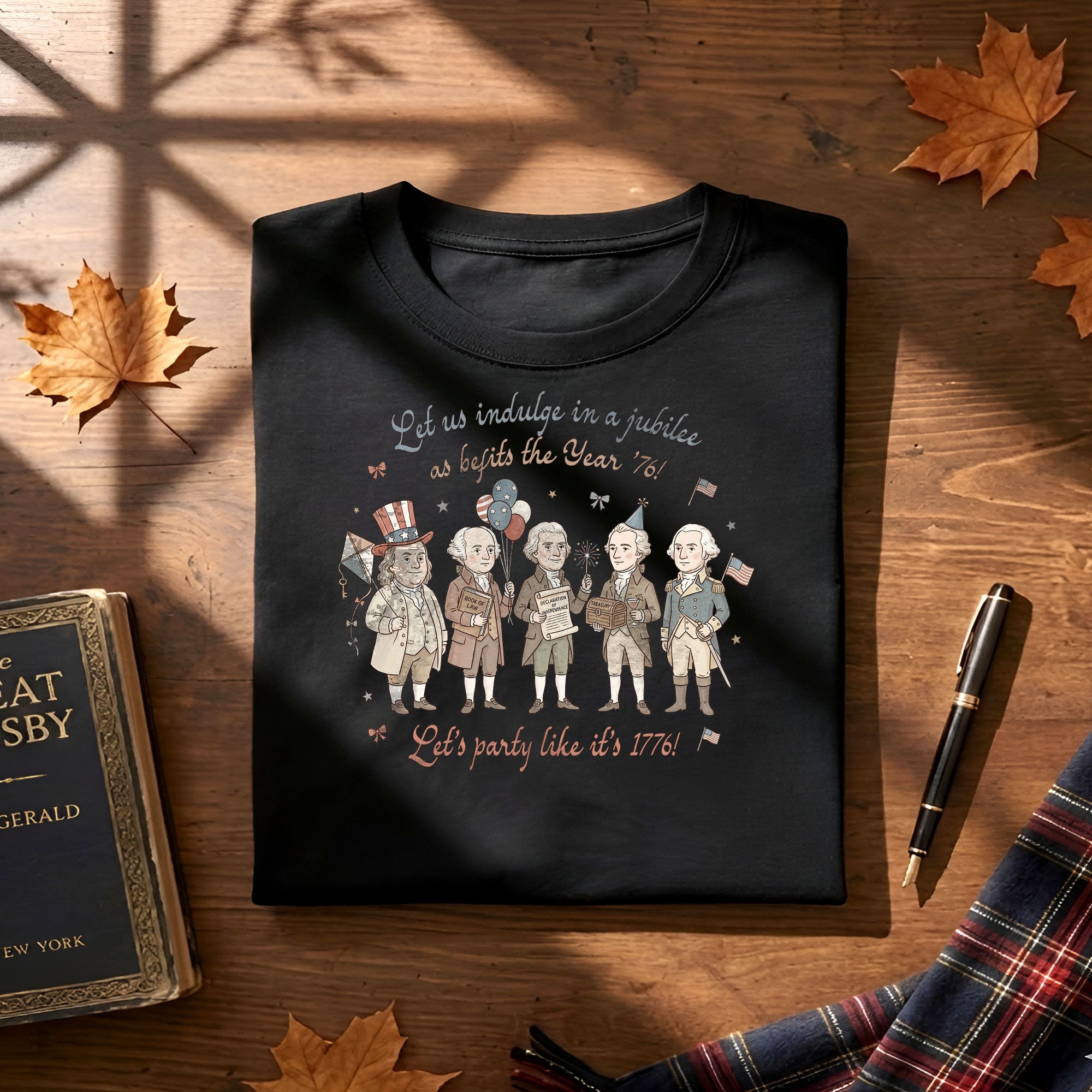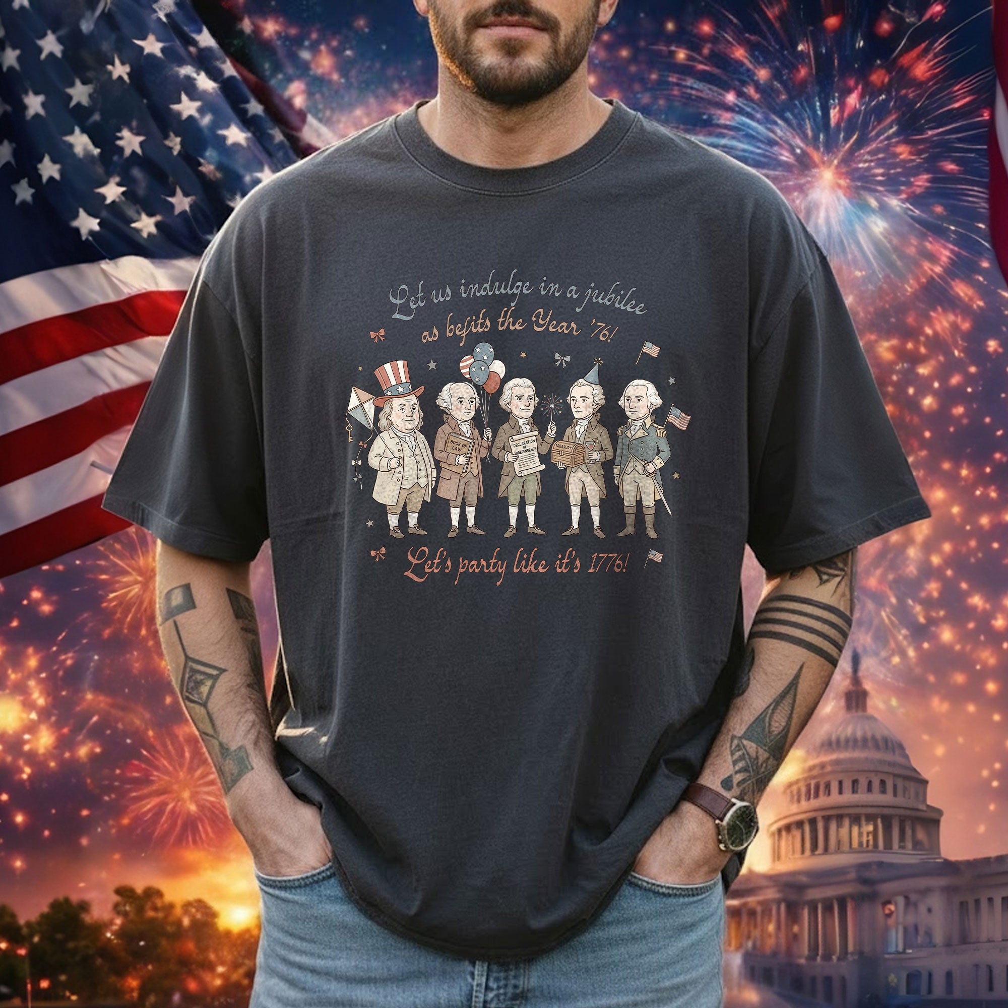 Celebrate America’s 250th anniversary with this humorous Founding Fathers T-Shirt featuring the playful slogan ‘Let’s Party Like It’s 1776.’ This patriotic tee showcases vintage-style artwork of the Founding Fathers in a fun, lighthearted design that honors the spirit of independence and American history. Crafted from soft, comfortable cotton blend fabric, it’s perfect for everyday wear, barbecues, Fourth of July celebrations, historical events, or casual outings. Show your pride in the USA with a unique twist on patriotism. Available in multiple sizes for men, women, and unisex fit. Machine washable for easy care. Ideal for history buffs, patriots, and anyone who loves witty apparel.