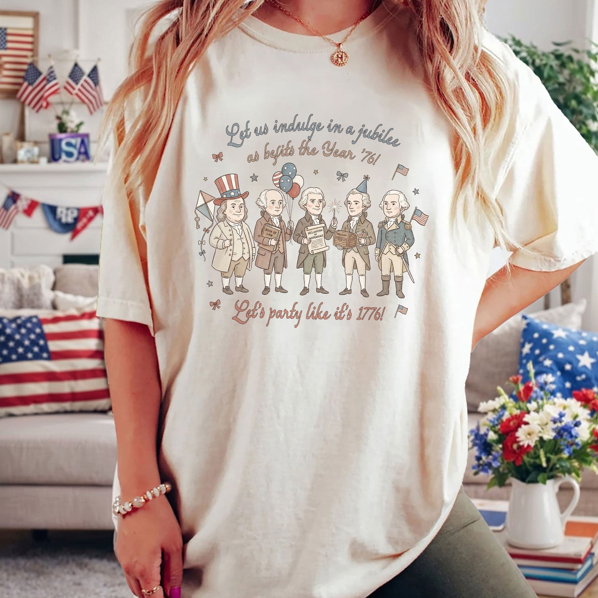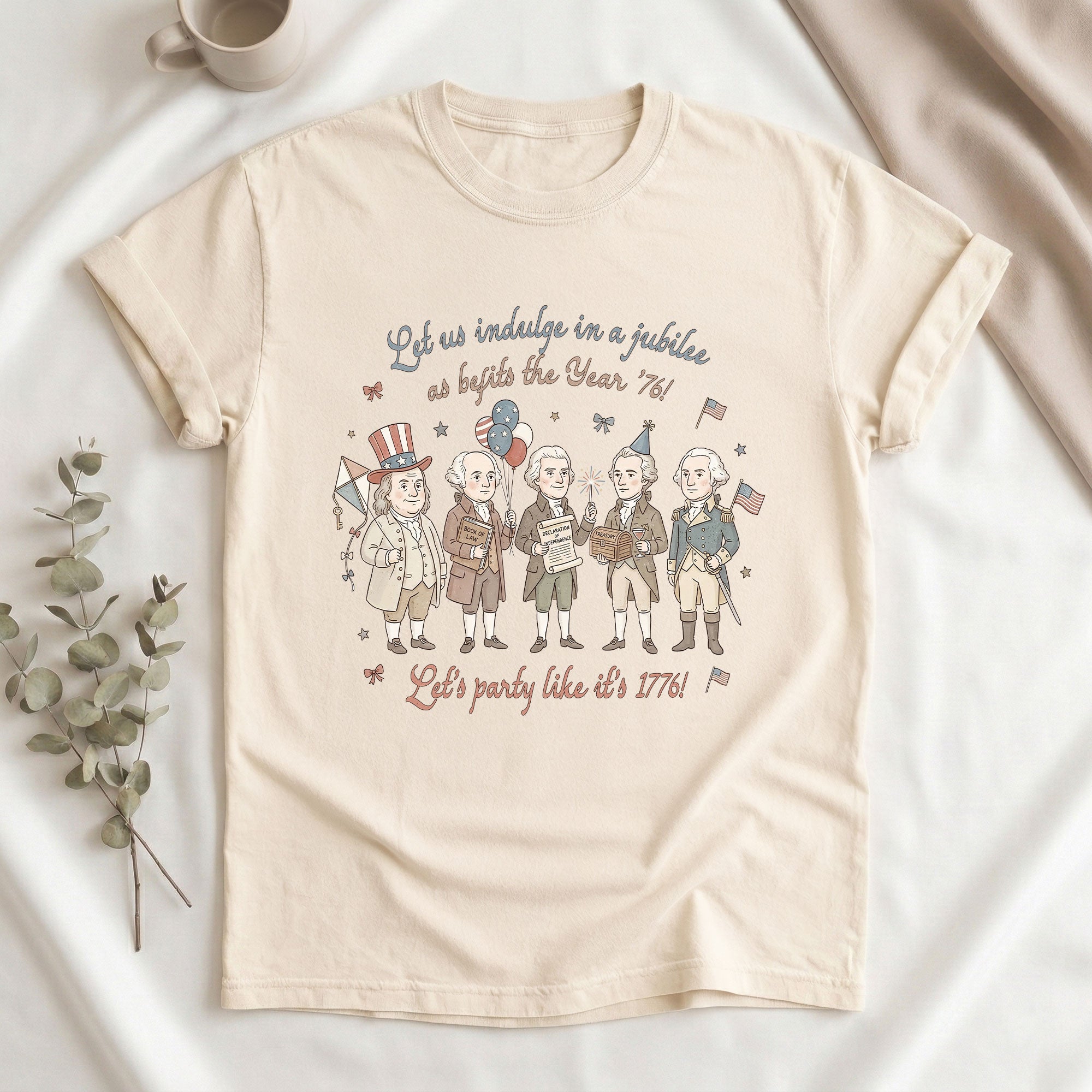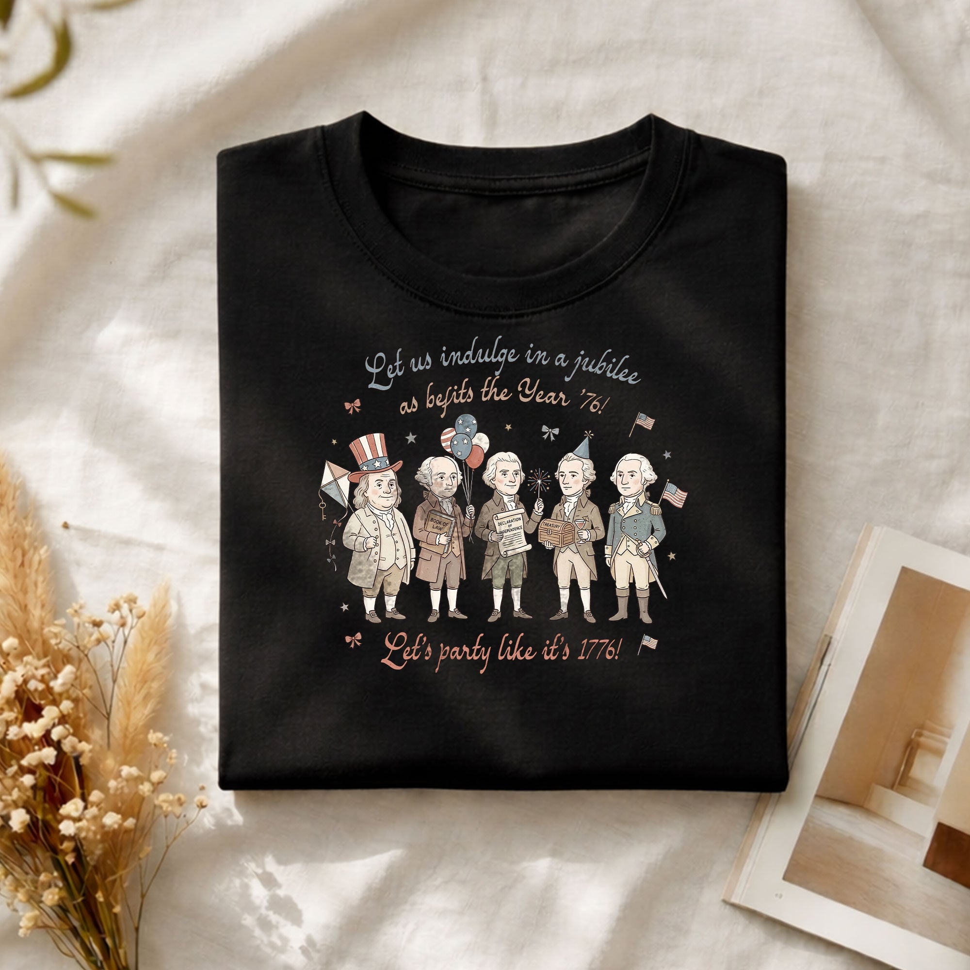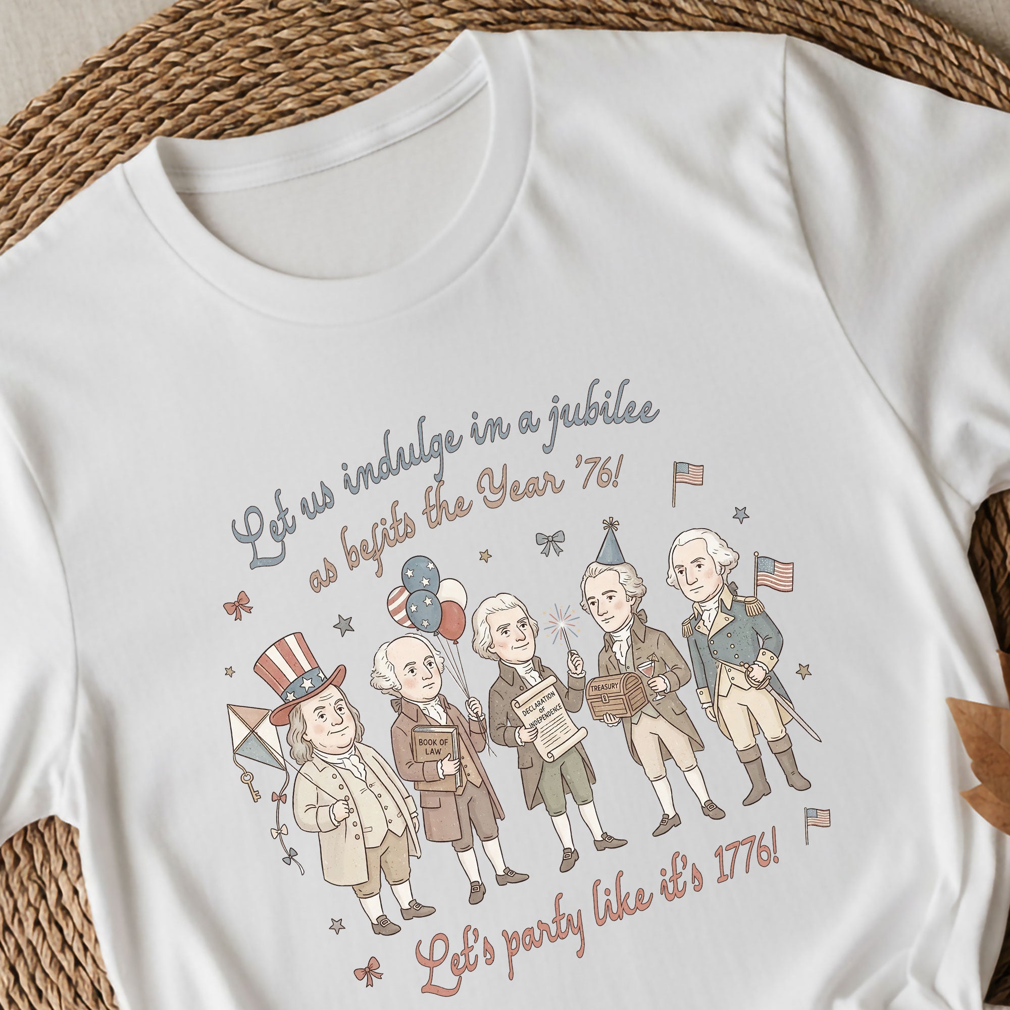 Celebrate America’s 250th anniversary with this humorous Founding Fathers T-Shirt featuring the playful slogan ‘Let’s Party Like It’s 1776.’ This patriotic tee showcases vintage-style artwork of the Founding Fathers in a fun, lighthearted design that honors the spirit of independence and American history. Crafted from soft, comfortable cotton blend fabric, it’s perfect for everyday wear, barbecues, Fourth of July celebrations, historical events, or casual outings. Show your pride in the USA with a unique twist on patriotism. Available in multiple sizes for men, women, and unisex fit. Machine washable for easy care. Ideal for history buffs, patriots, and anyone who loves witty apparel.