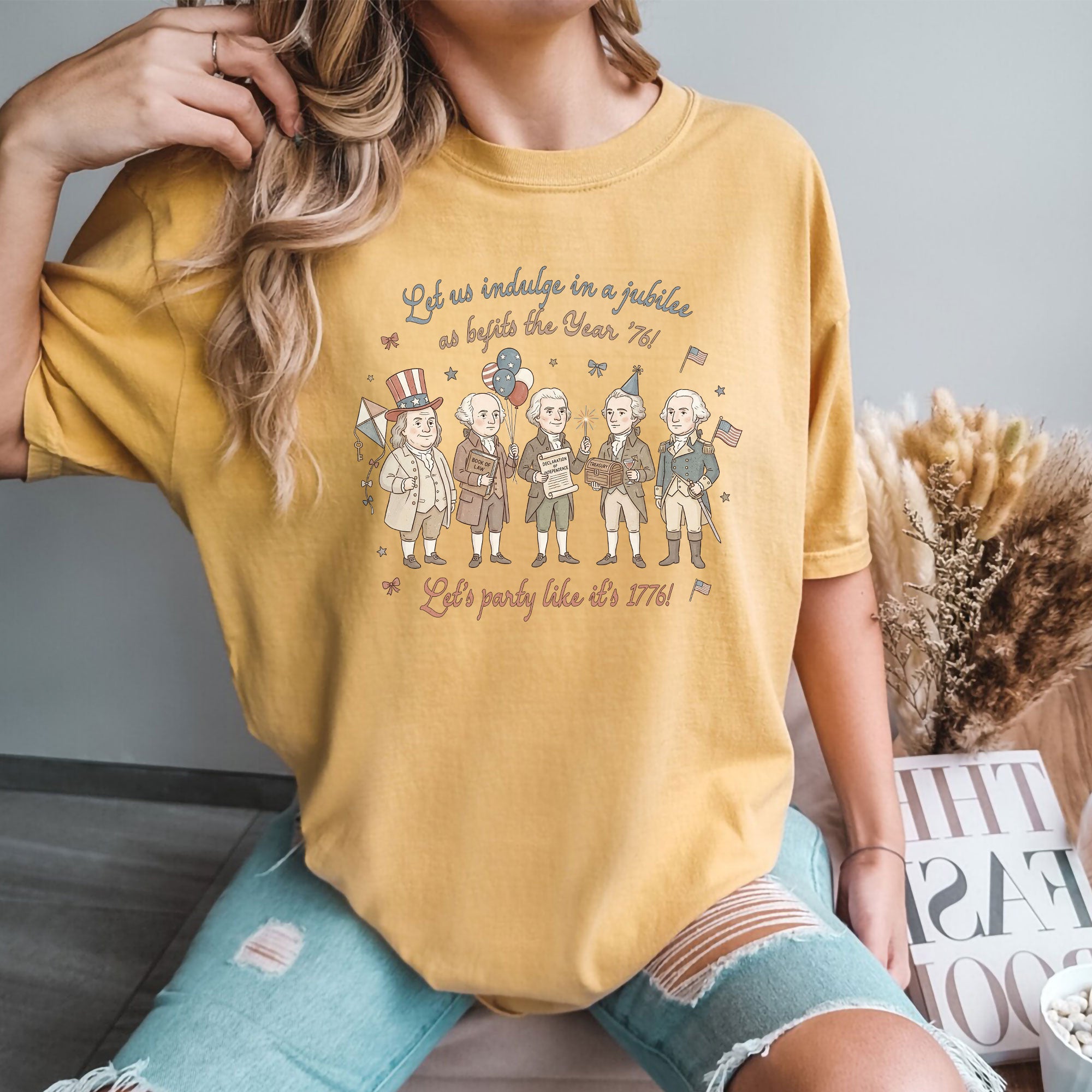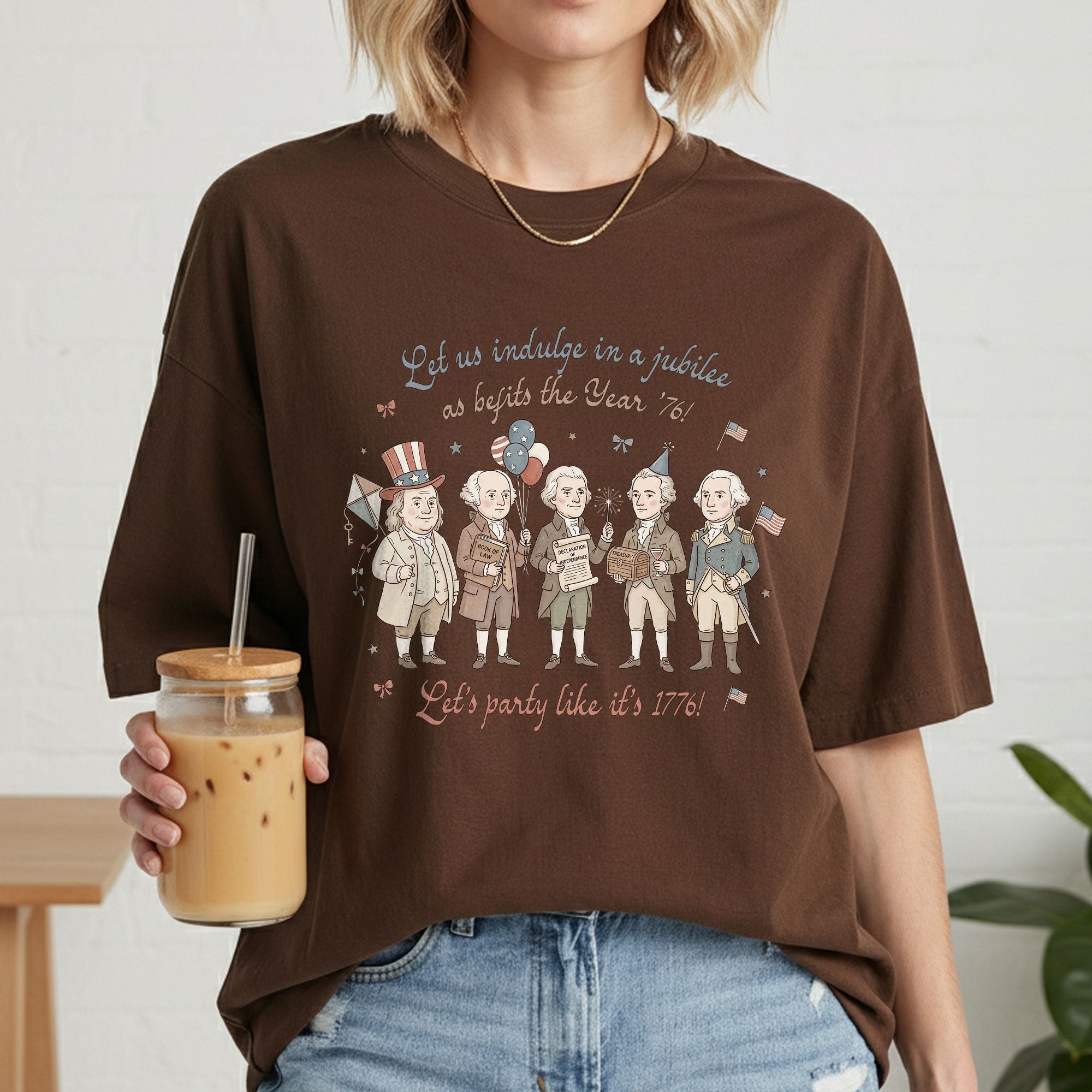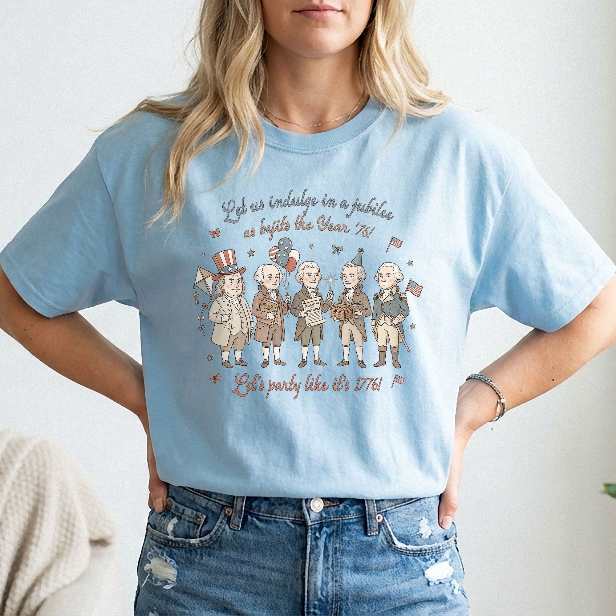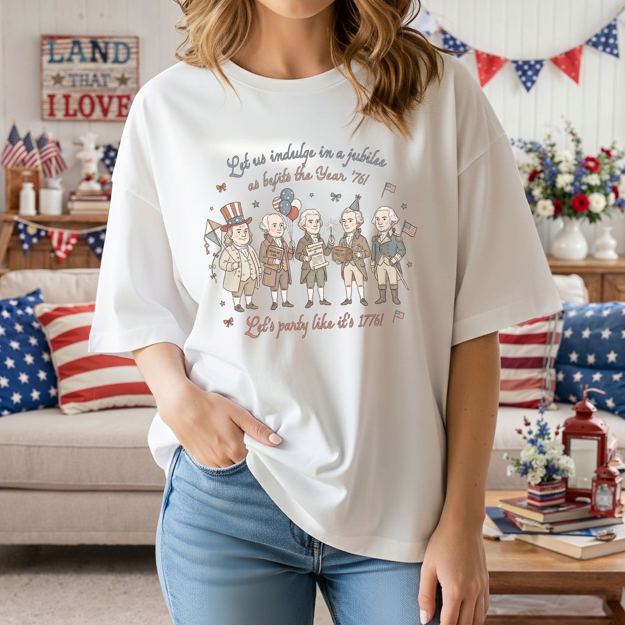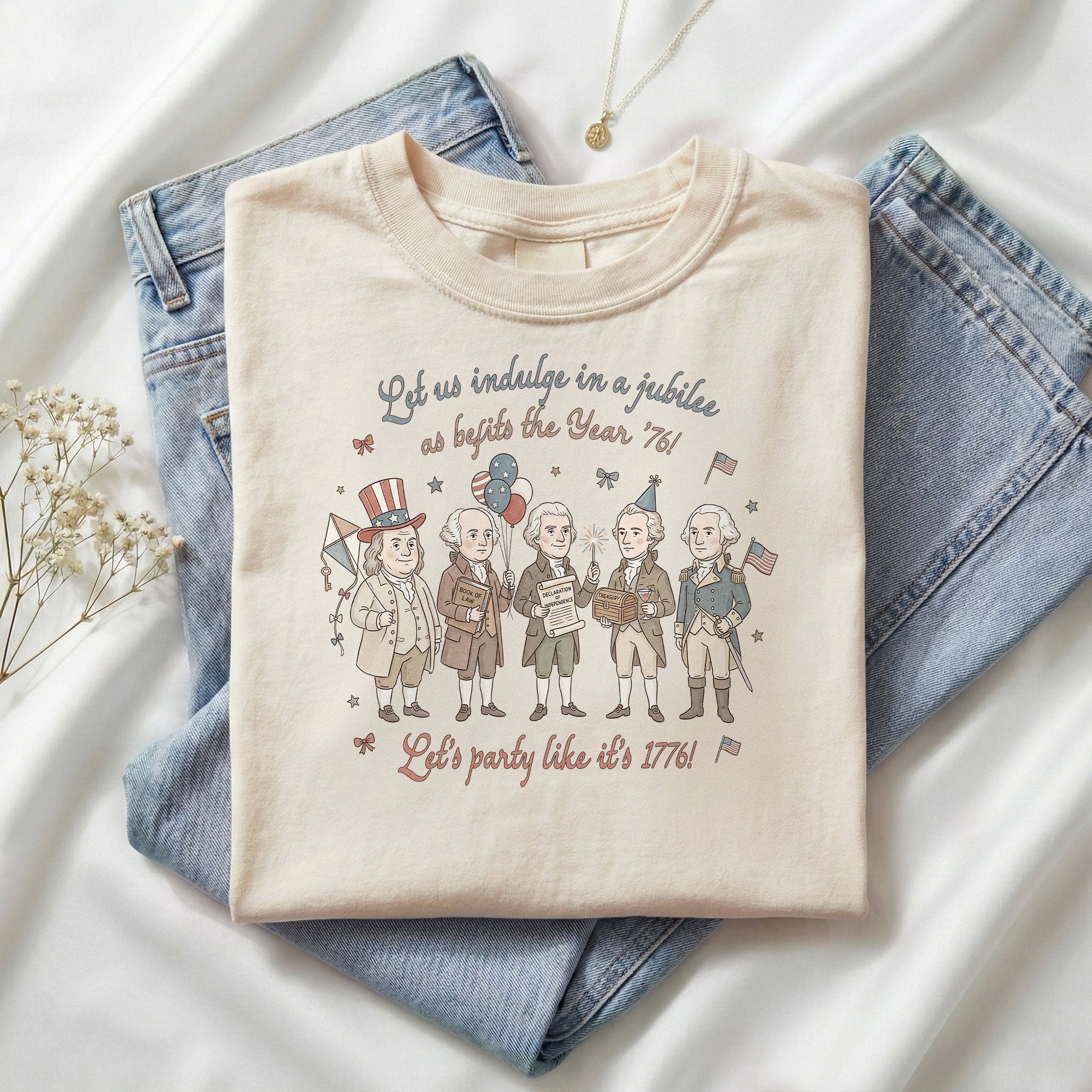 Celebrate America’s 250th anniversary with this humorous Founding Fathers T-Shirt featuring the playful slogan ‘Let’s Party Like It’s 1776.’ This patriotic tee showcases vintage-style artwork of the Founding Fathers in a fun, lighthearted design that honors the spirit of independence and American history. Crafted from soft, comfortable cotton blend fabric, it’s perfect for everyday wear, barbecues, Fourth of July celebrations, historical events, or casual outings. Show your pride in the USA with a unique twist on patriotism. Available in multiple sizes for men, women, and unisex fit. Machine washable for easy care. Ideal for history buffs, patriots, and anyone who loves witty apparel.