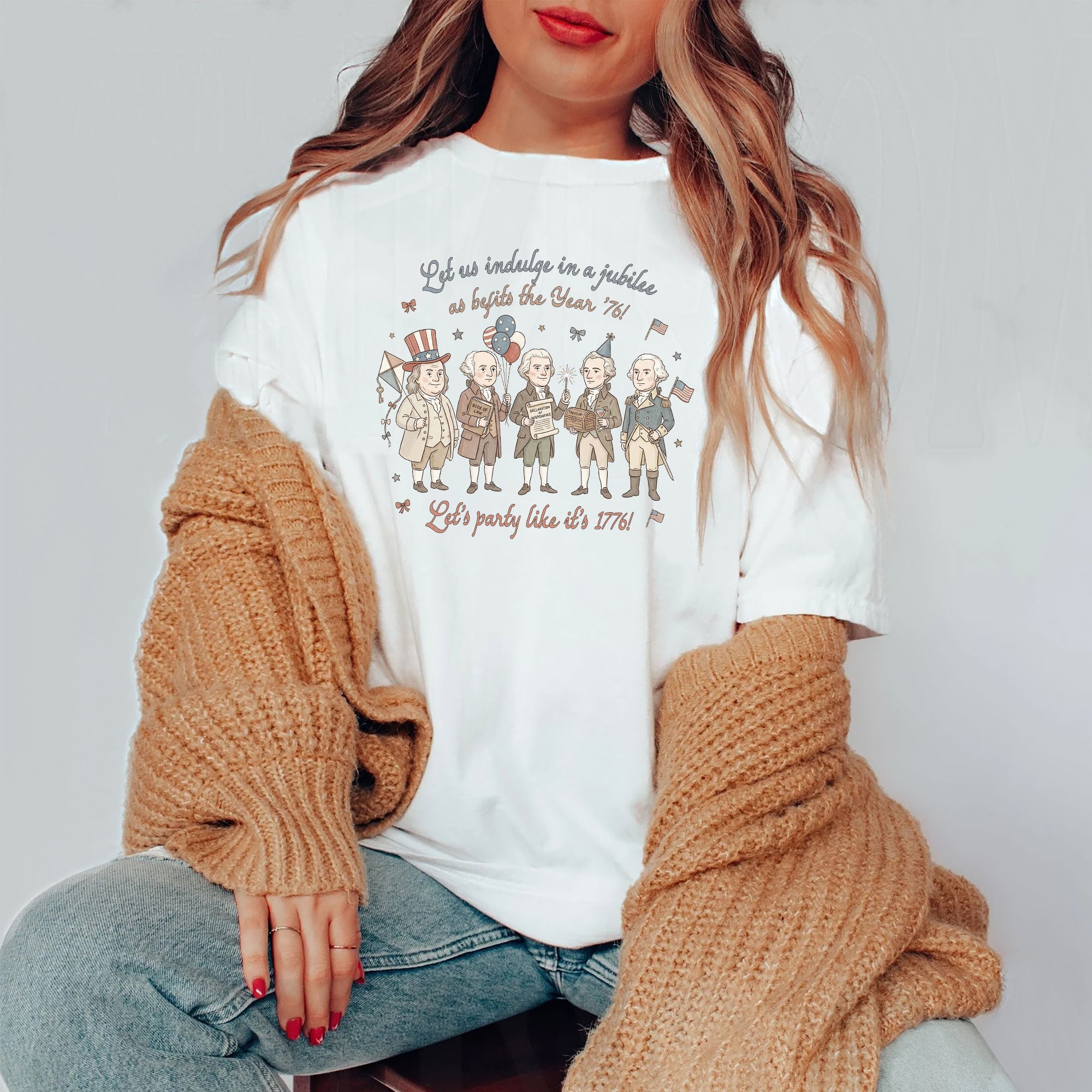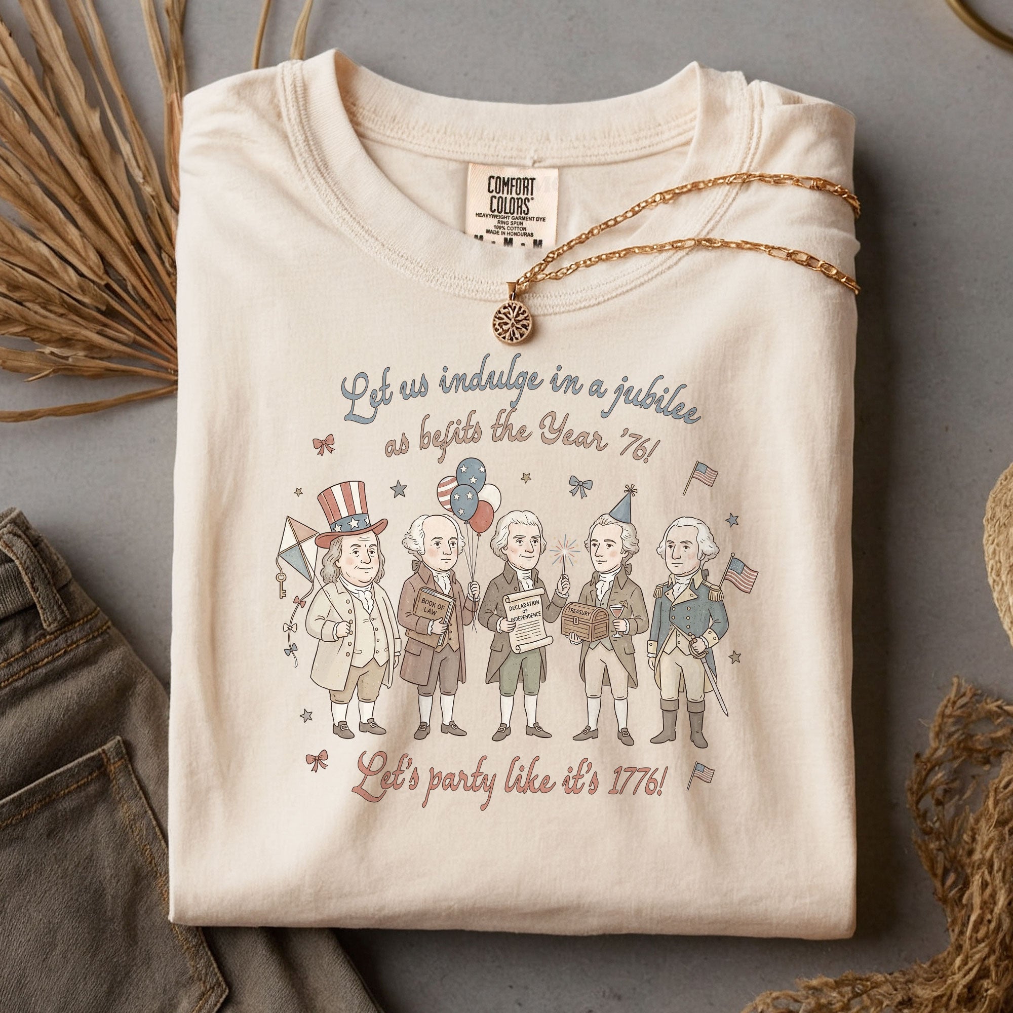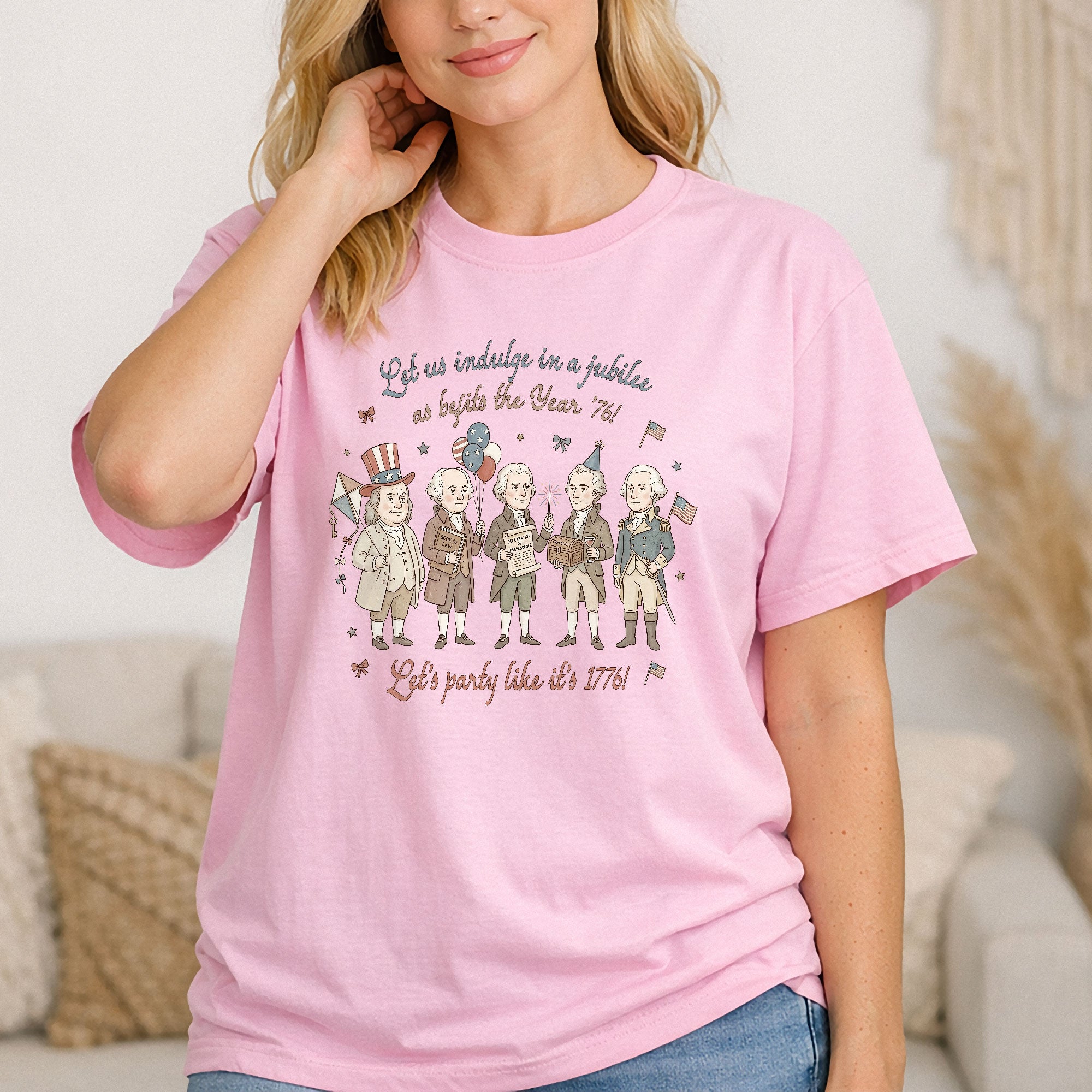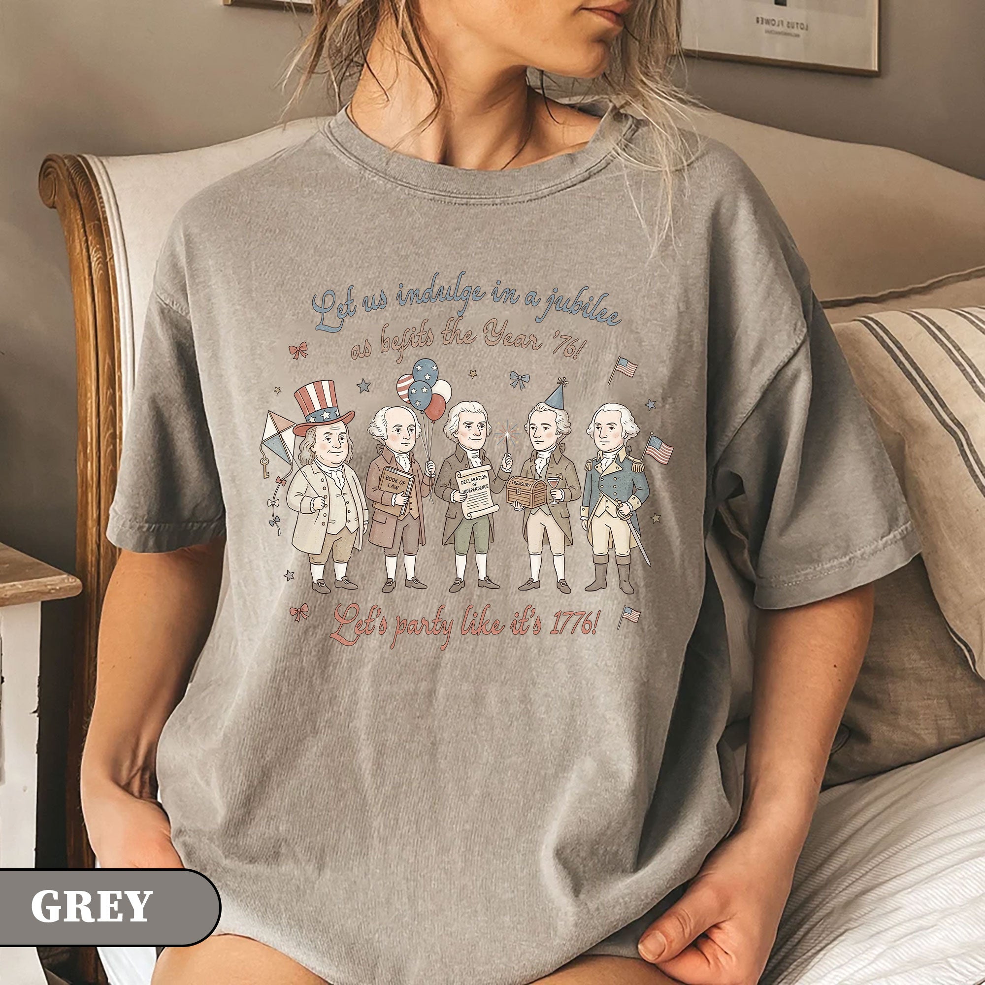 Celebrate America’s 250th anniversary with this humorous Founding Fathers T-Shirt featuring the playful slogan ‘Let’s Party Like It’s 1776.’ This patriotic tee showcases vintage-style artwork of the Founding Fathers in a fun, lighthearted design that honors the spirit of independence and American history. Crafted from soft, comfortable cotton blend fabric, it’s perfect for everyday wear, barbecues, Fourth of July celebrations, historical events, or casual outings. Show your pride in the USA with a unique twist on patriotism. Available in multiple sizes for men, women, and unisex fit. Machine washable for easy care. Ideal for history buffs, patriots, and anyone who loves witty apparel.