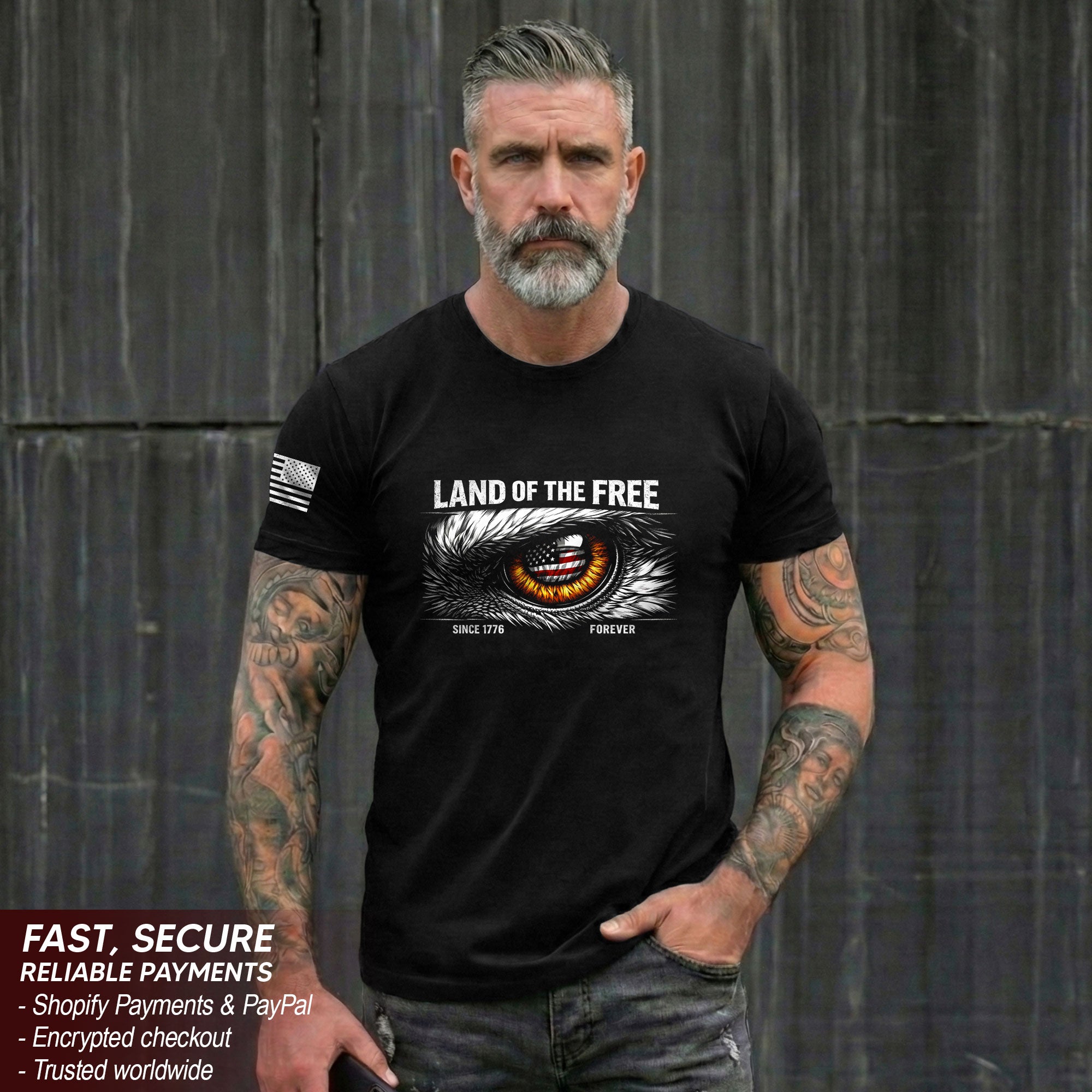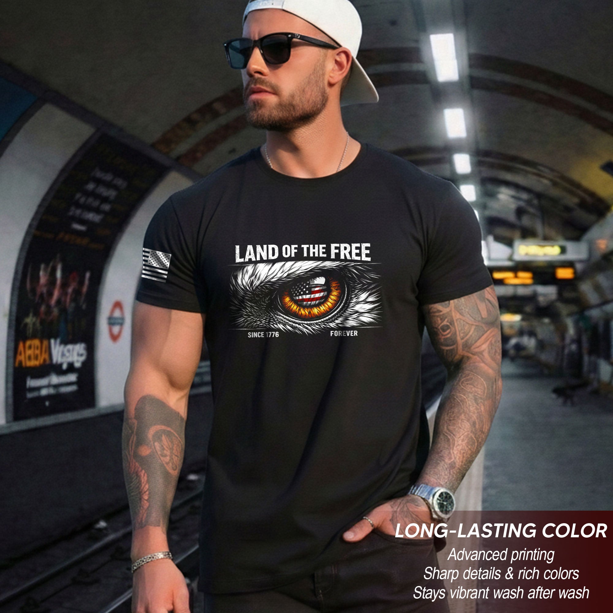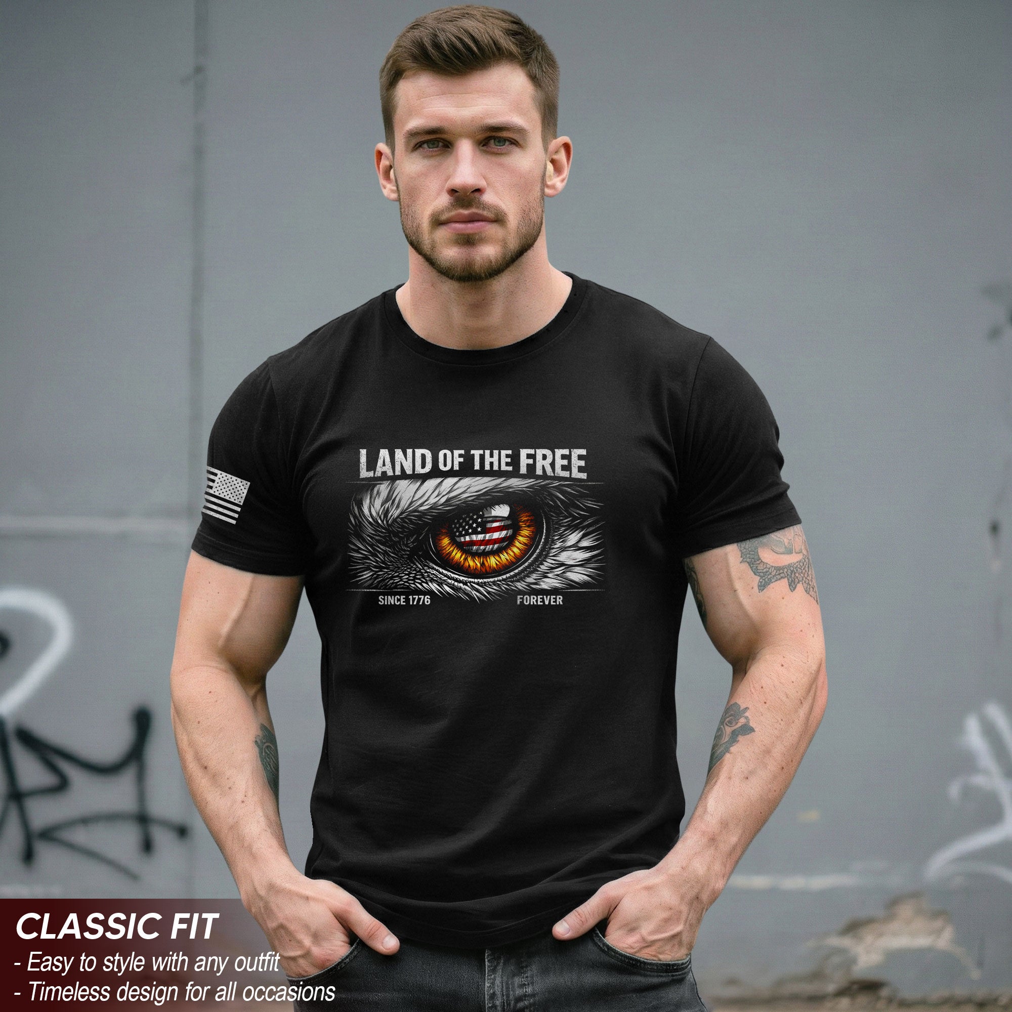 Celebrate 250 years of American independence with this Men’s 250 Years of Freedom 1776-2026 Patriotic T-Shirt. Featuring a striking eagle eye design overlaid on the iconic American flag, this shirt honors the legacy of freedom and the bold spirit that defines the nation. Crafted from soft, breathable cotton for all-day comfort, it’s perfect for patriots who want to show their pride on Independence Day, Memorial Day, Fourth of July barbecues, veterans’ events, or everyday wear. Available in multiple sizes for a great fit. Machine washable and durable for long-lasting wear. Embrace the history and determination of the USA with this bold graphic tee.