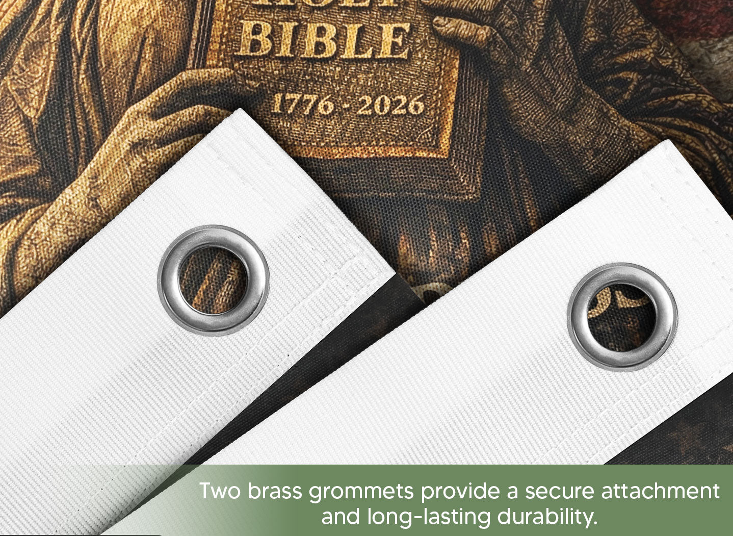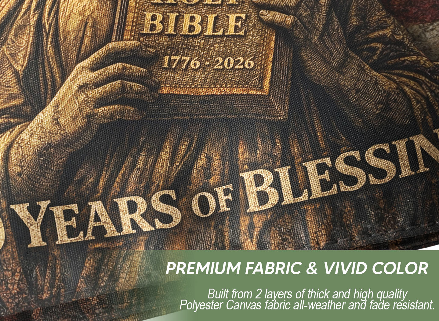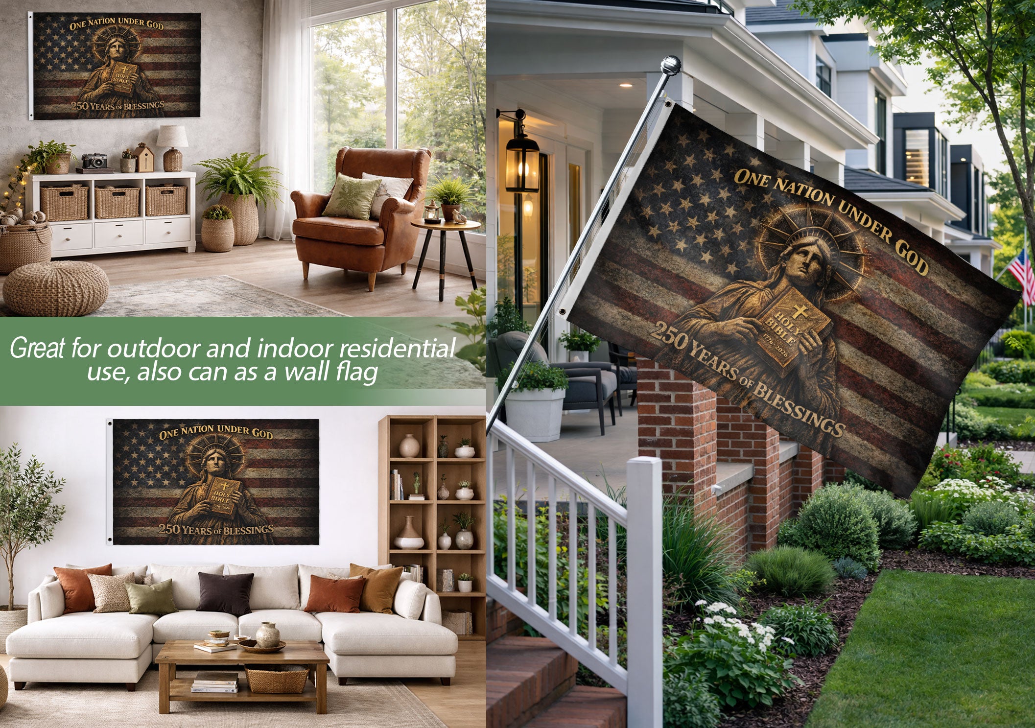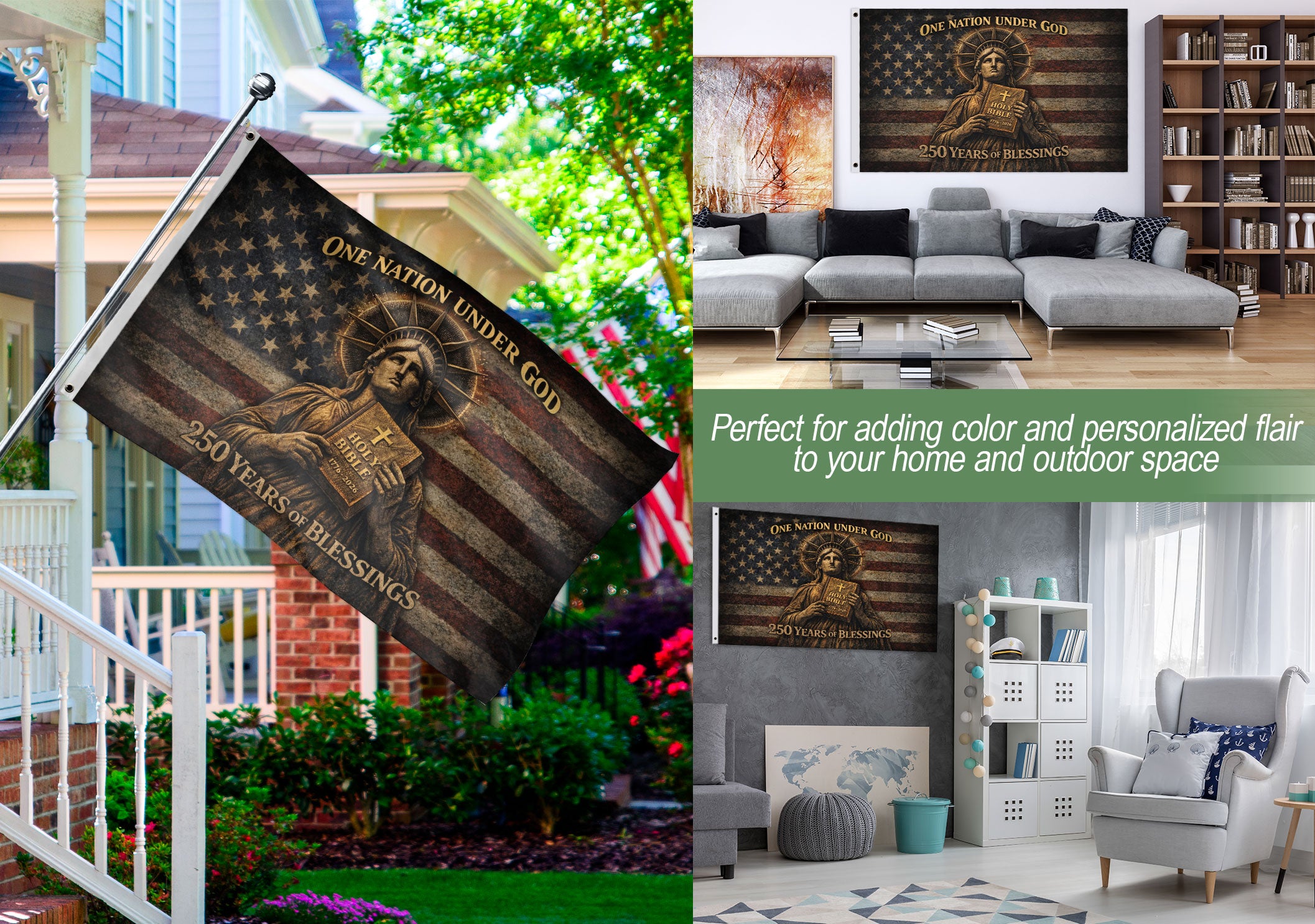 Celebrate the United States’ 250th anniversary from 1776 to 2026 with this striking One Nation Under God double-sided flag. Featuring the Holy Bible and cross emblem, this patriotic banner honors 250 years of American blessings, resilience, faith, and freedom. Crafted from durable, high-quality polyester fabric with vibrant, fade-resistant printing on both sides, it ensures long-lasting display in any weather. Perfect for home porches, garages, events, parades, Fourth of July celebrations, or as a tribute to American heritage and divine providence. Measuring standard flag size, it’s easy to hang with reinforced grommets. Ideal for patriots, history enthusiasts, and faith-driven Americans seeking a meaningful symbol of the nation’s semiquincentennial journey. Show your pride in the land of the free with this resilient, double-sided 1776-2026 anniversary flag.