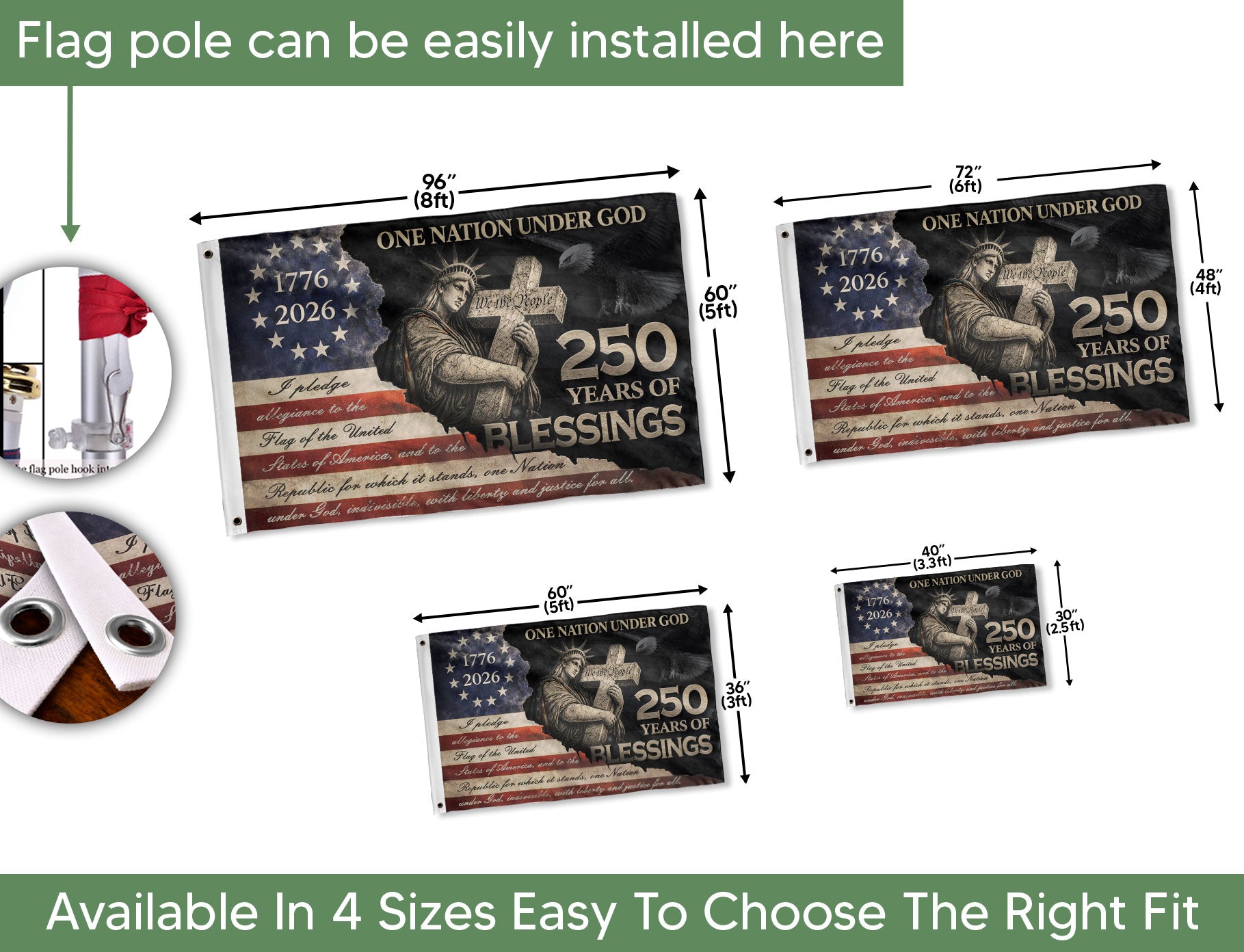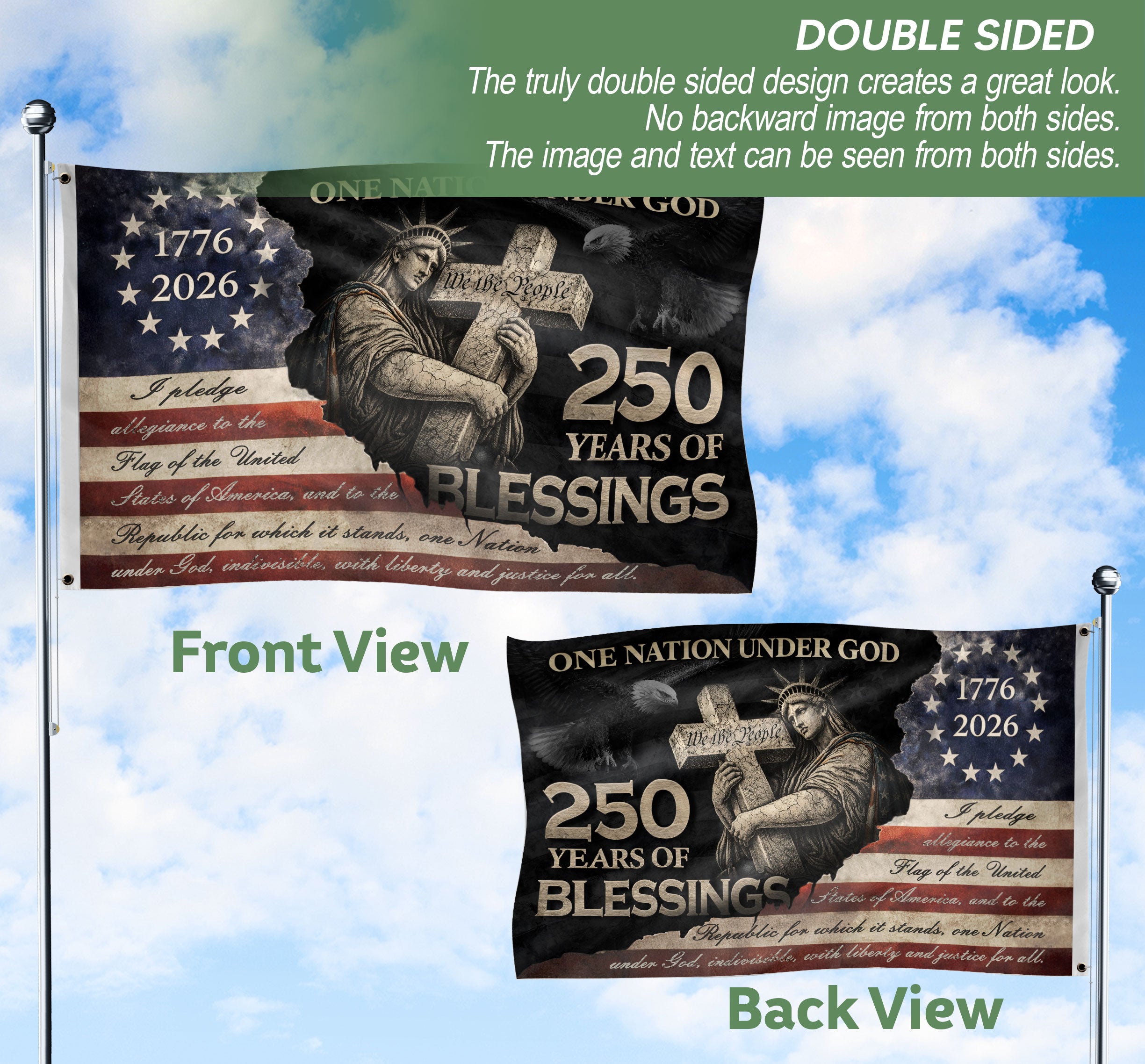 Celebrate 250 years of American blessings with this Pledge of Allegiance house flag, spanning 1776-2026. The profound design showcases the Statue of Liberty embracing a wooden cross inscribed with ‘We The People,’ alongside the full text of the Pledge of Allegiance. Perfect for displaying patriotic Christian values, faith, and freedom on your home. Crafted for outdoor use, this house flag honors the nation’s foundation with durable materials that withstand the elements. Ideal for Independence Day, Memorial Day, or everyday pride in American heritage.
