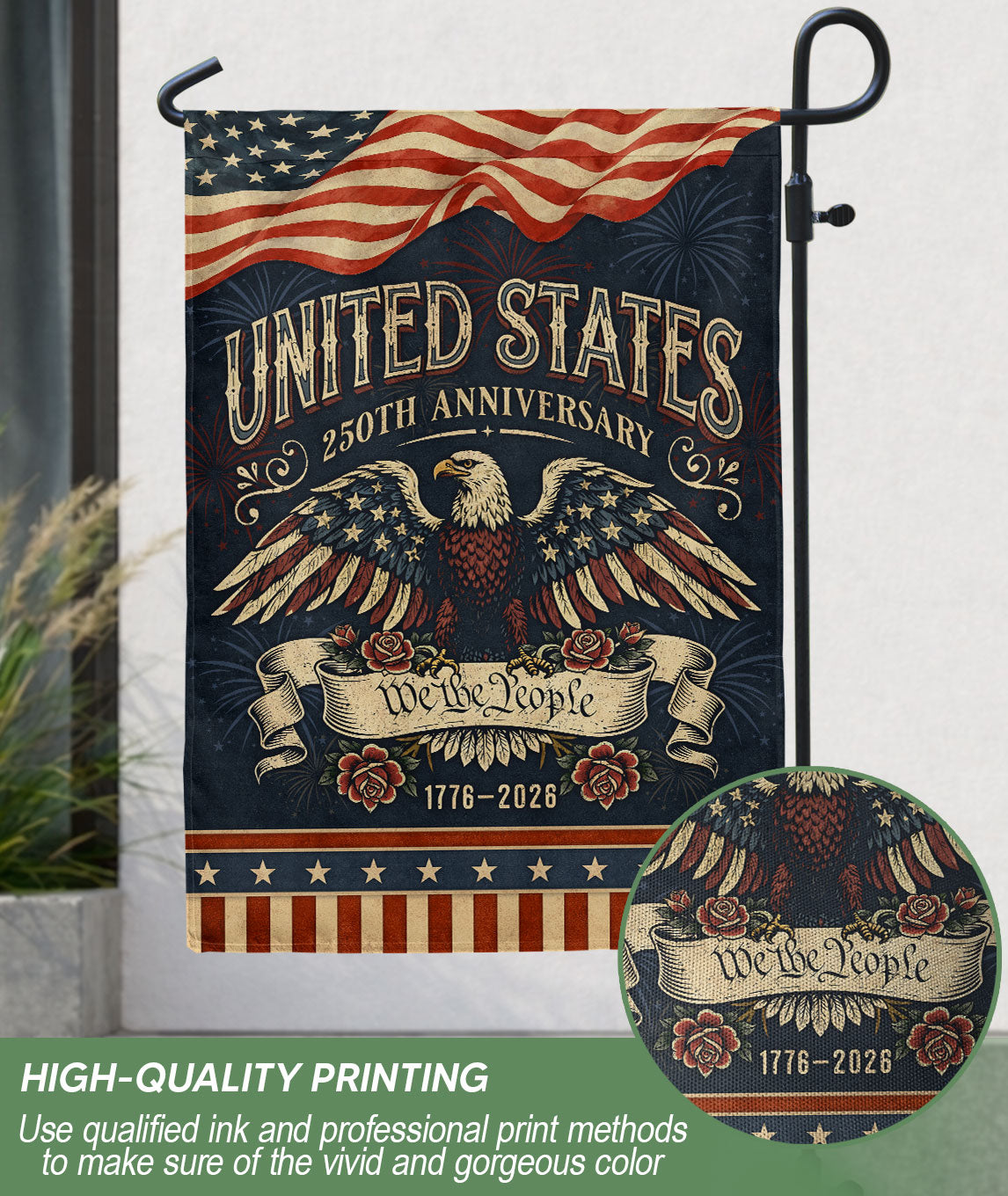 Celebrate America’s 250th anniversary from 1776 to 2026 with this patriotic house flag featuring the iconic We The People Bald Eagle in distressed vintage artwork. This double-sided banner proudly displays the spirit of the founding principles on both sides, making it perfect for porches, gardens, or outdoor displays. Crafted for durability to withstand weather, it’s an ideal way to honor the nation’s milestone in meaningful fashion. Hang it high to show your American pride during parades, holidays, or everyday patriotism.