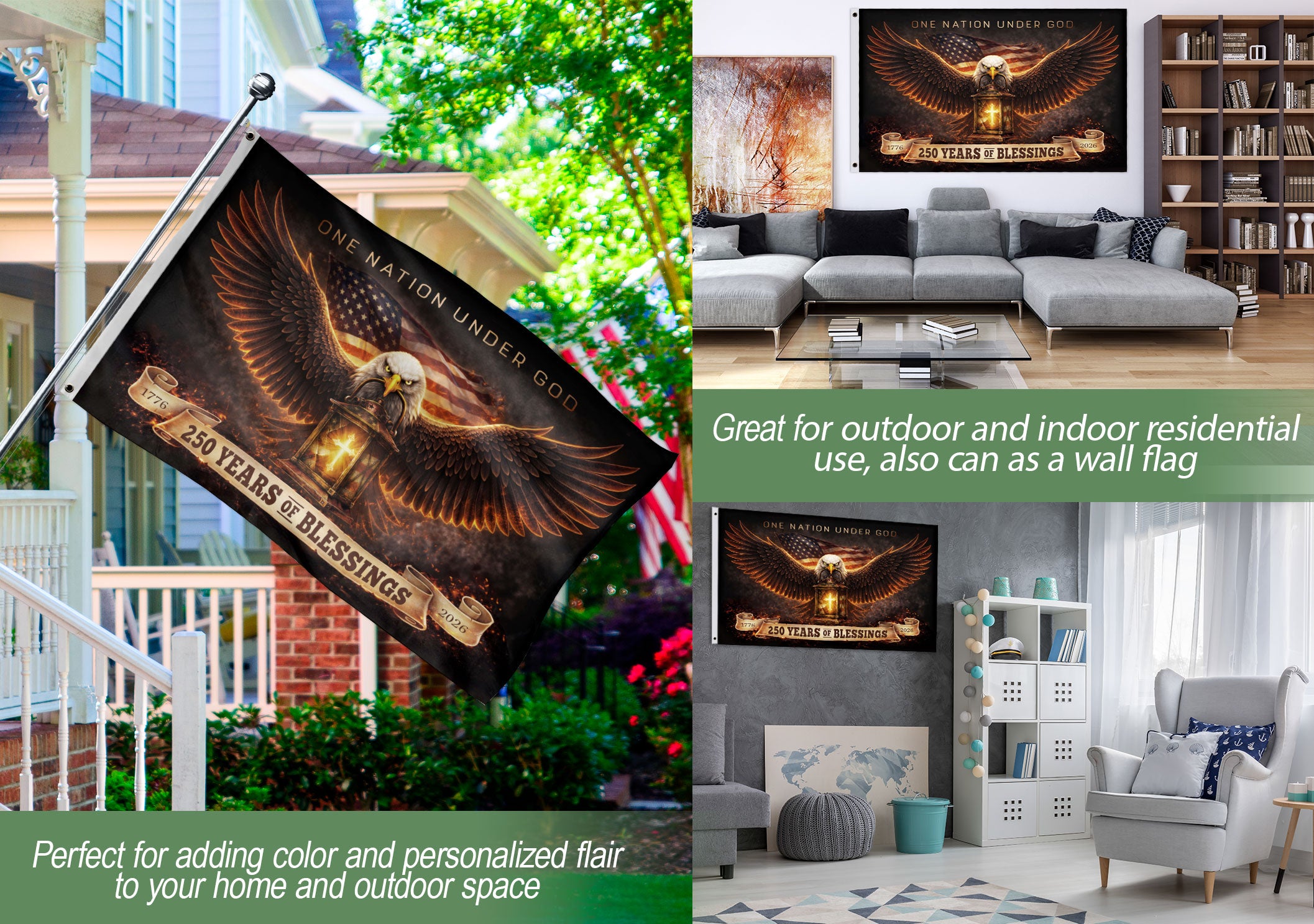 Celebrate America’s 250th anniversary from 1776 to 2026 with this striking Christian patriotic cross flag. The design prominently features a majestic eagle, the historic timeline 1776–2026, and the powerful inscription ‘One Nation Under God,’ symbolizing faith in Christ, freedom, and the enduring American heritage. Perfect for outdoor display in gardens, yards, porches, or during patriotic celebrations, this flag serves as a meaningful tribute to the nation’s Christian roots and values. Crafted for durability to withstand outdoor conditions, it adds a bold statement of patriotism and spirituality to any space.