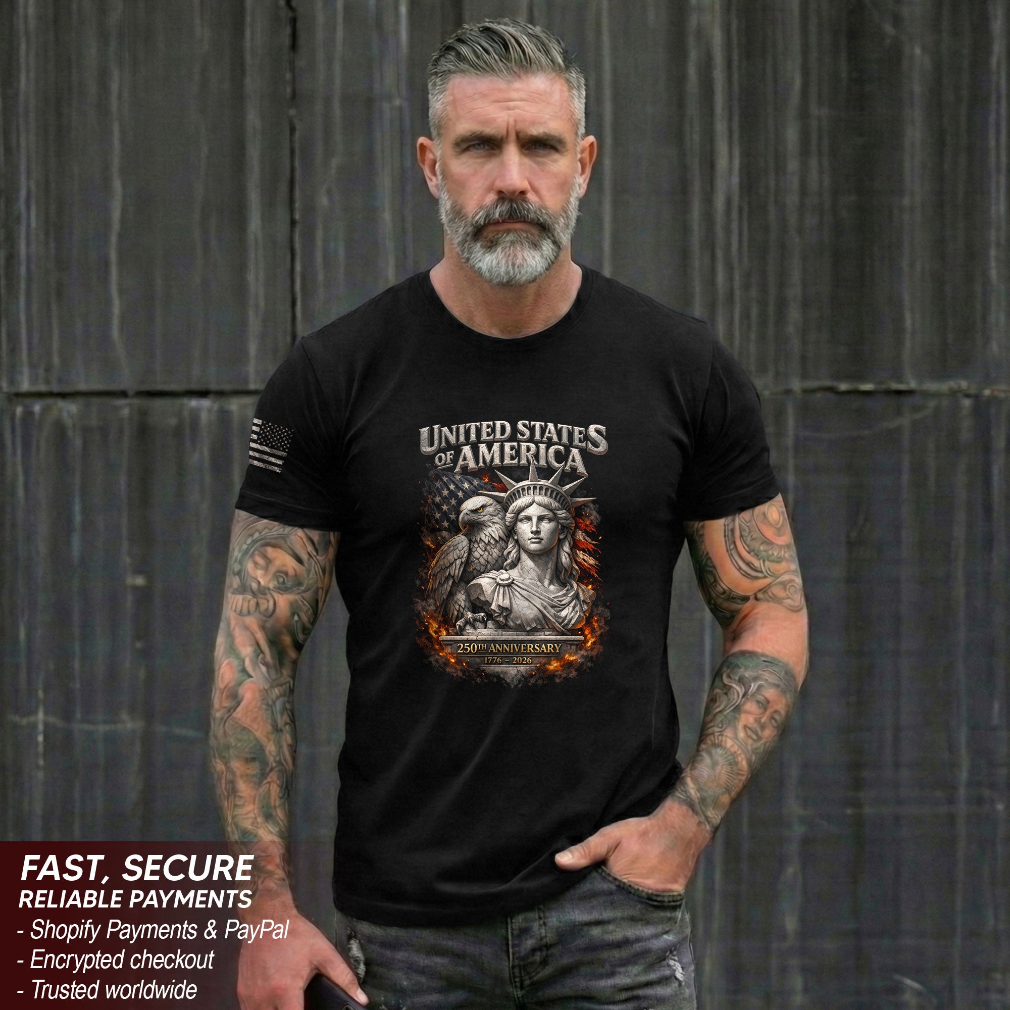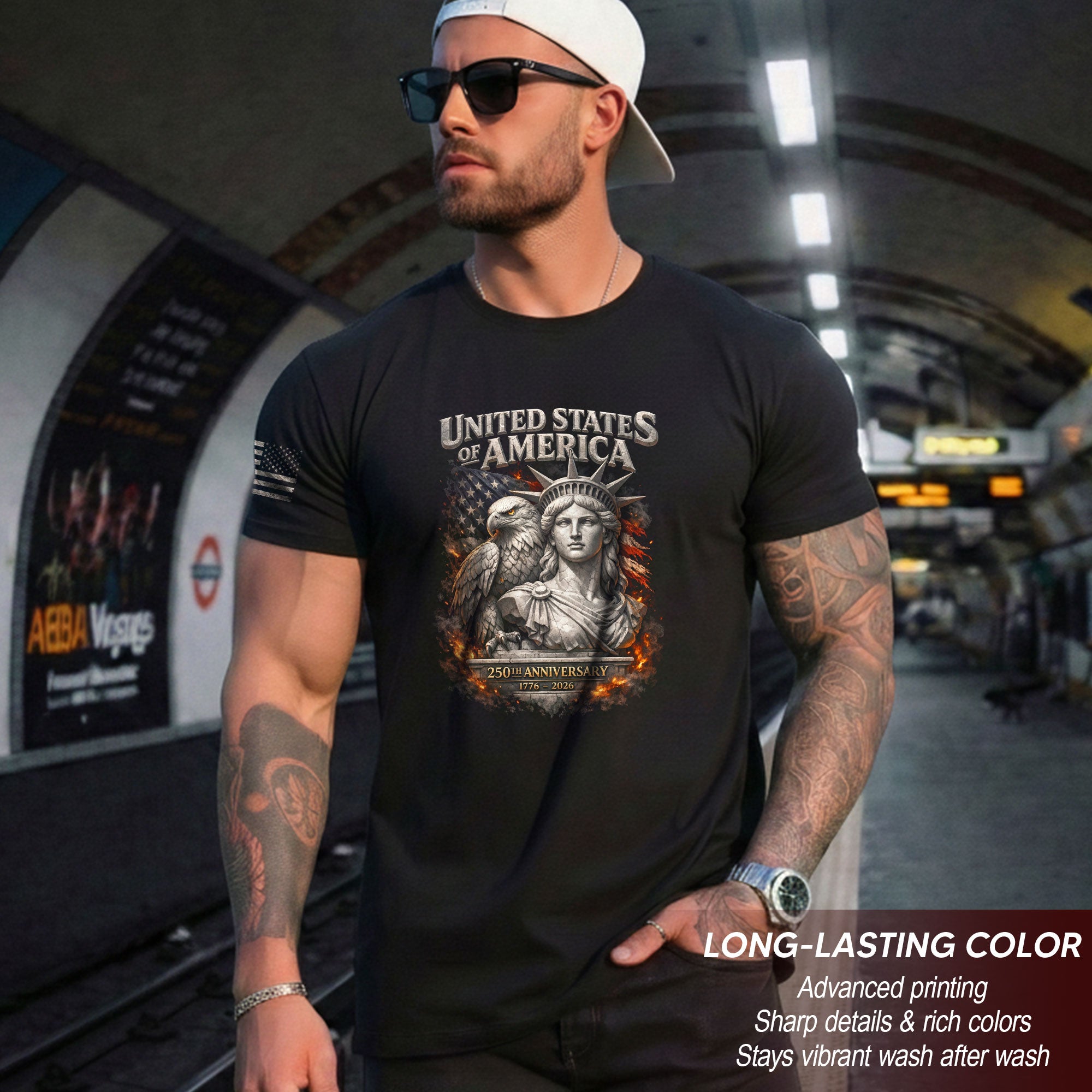 Celebrate the United States’ 250th anniversary with this patriotic T-shirt featuring an iconic eagle and Lady Liberty design. Spanning from 1776 to 2026, this tee commemorates 250 years of American resilience, hope, and national pride. Crafted for comfort and style, it’s perfect for history enthusiasts, patriots, and anyone honoring the nation’s enduring heritage. Wear it to parades, barbecues, Fourth of July events, or everyday to show your American spirit. Made from high-quality, soft cotton blend fabric that holds up wash after wash, ensuring long-lasting vibrancy of the bold graphic print. Available in multiple sizes for men, women, and unisex fit. A timeless piece that inspires future generations with symbols of strength and liberty side by side.