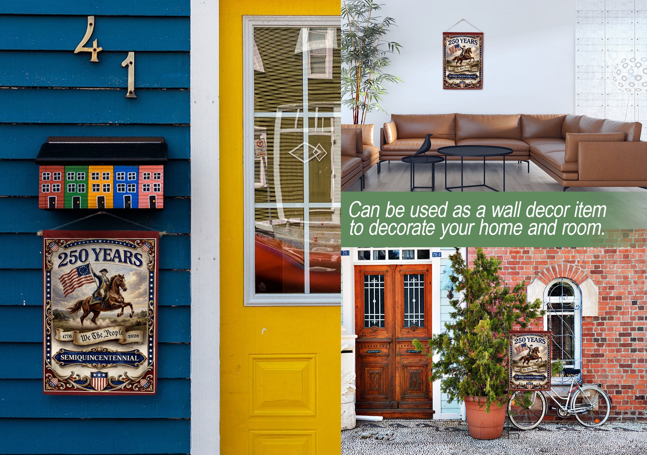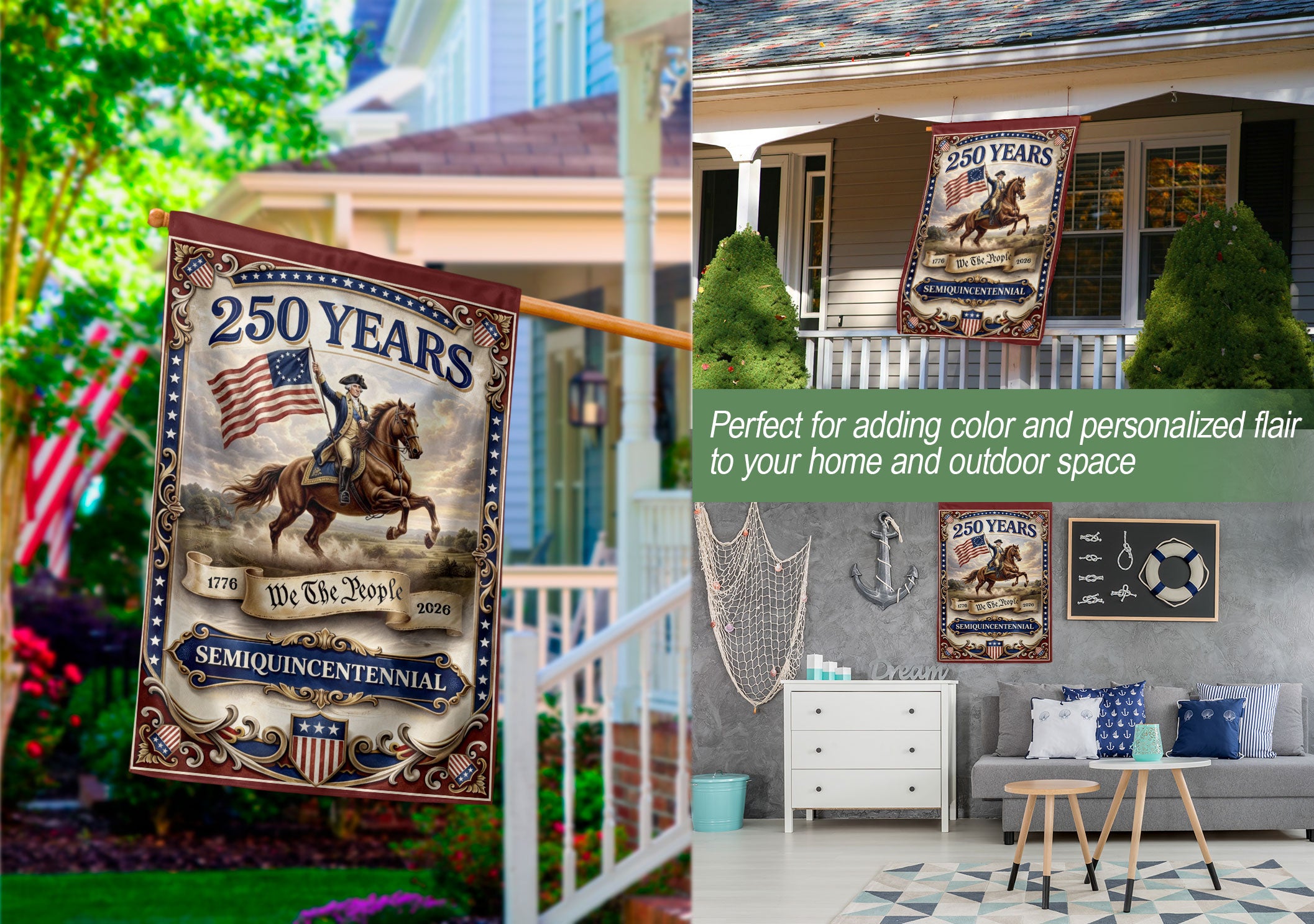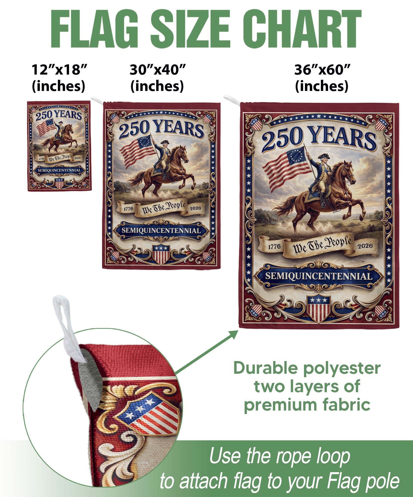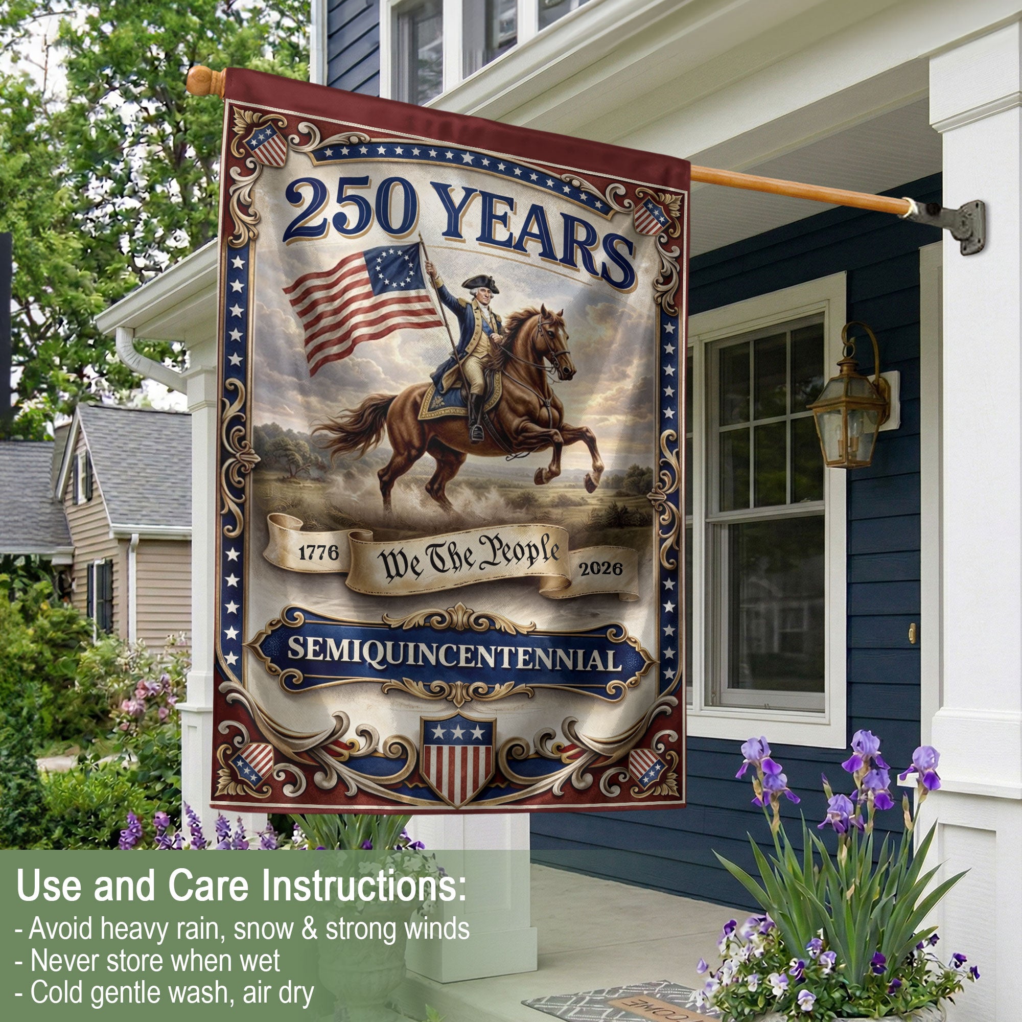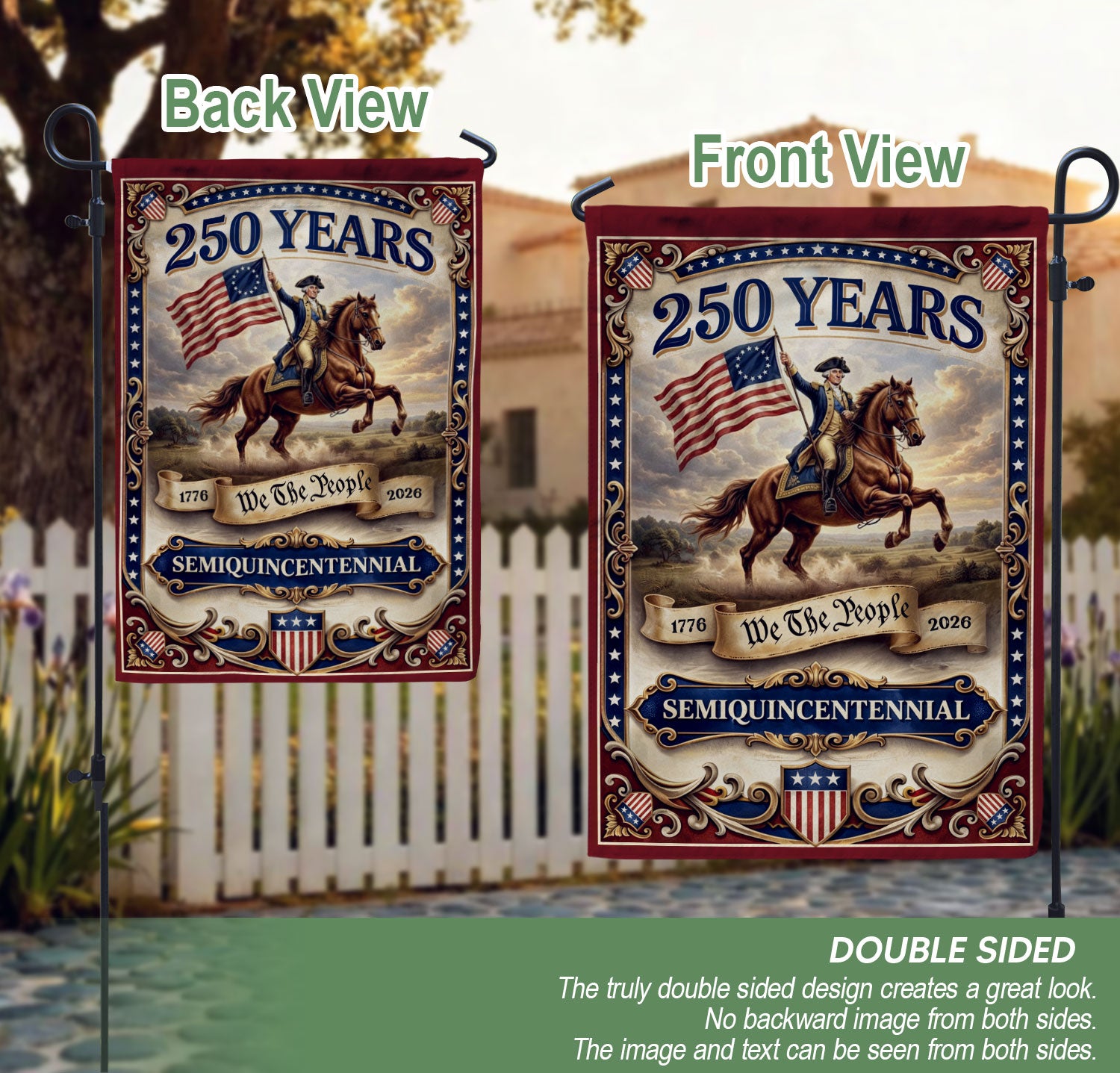 Celebrate America’s 250th anniversary with this premium double-sided house flag featuring George Washington and the iconic ‘We The People’ slogan from 1776 to 2026. Perfect for yard decor, garden flags, or patriotic displays, this flag honors the nation’s founding principles, constitutional values, liberty, and enduring patriotism. Crafted for durability with vibrant colors visible from both sides, it’s ideal for porches, mailboxes, patios, or outdoor events. Show your pride in U.S. history and the spirit of independence with this commemorative anniversary garden flag.
