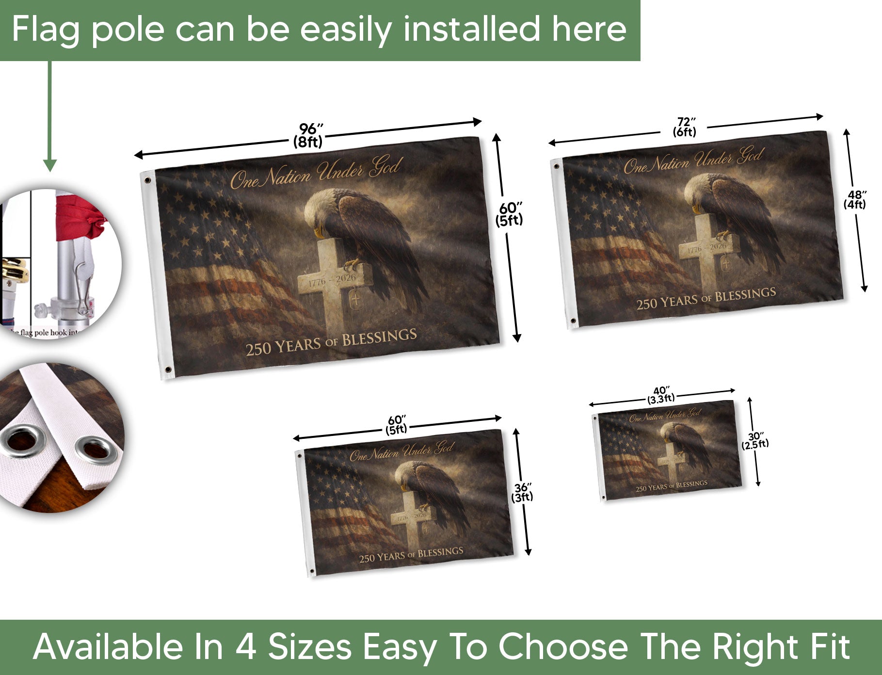 Celebrate America’s 250th anniversary from 1776 to 2026 with this striking double-sided flag. Featuring a bold bald eagle and cross design, it beautifully combines patriotic pride with Christian faith, symbolizing 250 years of blessings, courage, and freedom. Perfect for displaying at home, in your office, or during patriotic events like Independence Day celebrations. Crafted for durability, this high-quality flag is printed on both sides for visibility from any angle, ensuring your message of faith and liberty shines through. Ideal for veterans, history enthusiasts, church groups, and anyone honoring the nation’s heritage. Hang it proudly on a pole, porch, or wall to inspire patriotism and devotion.