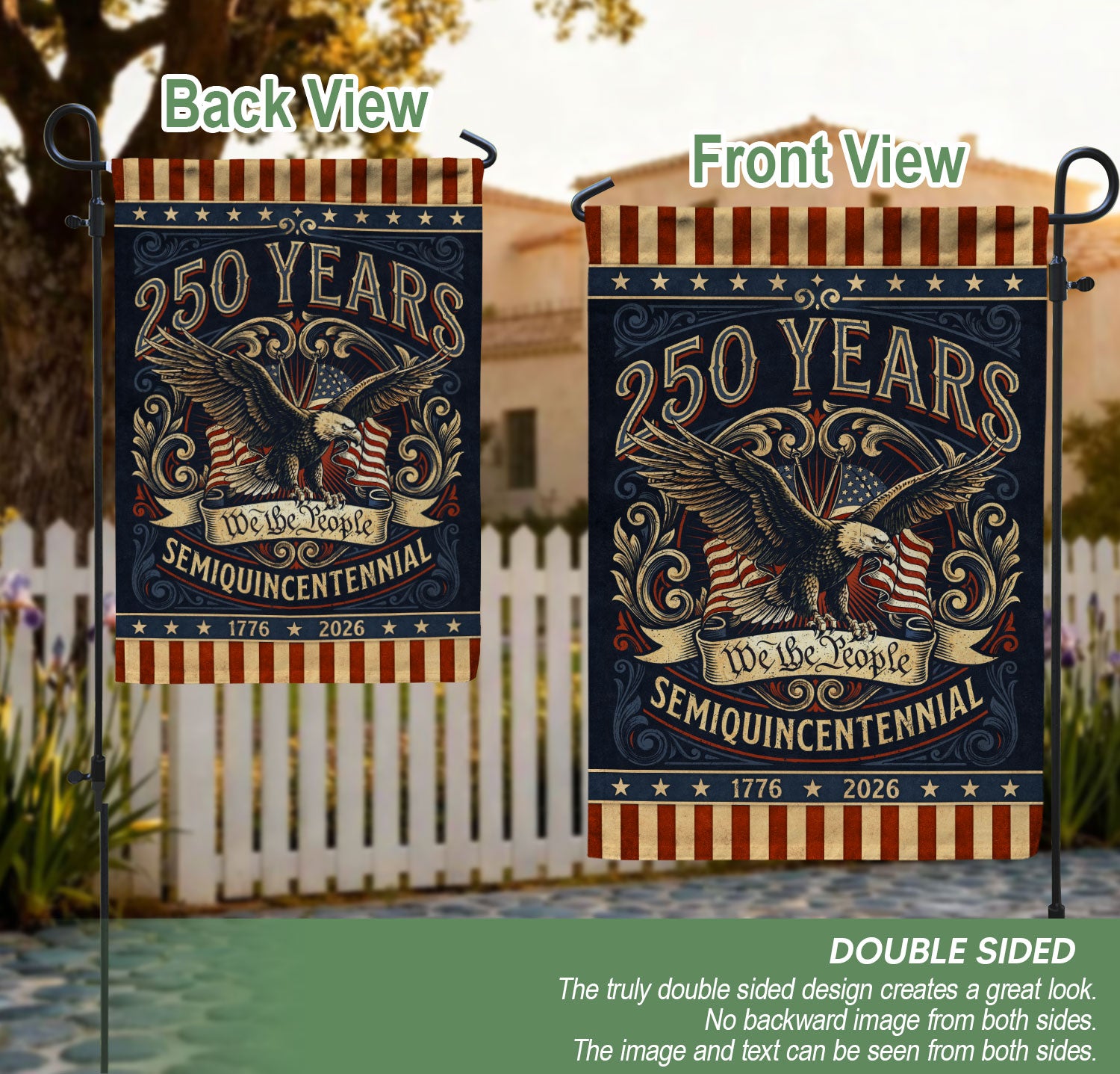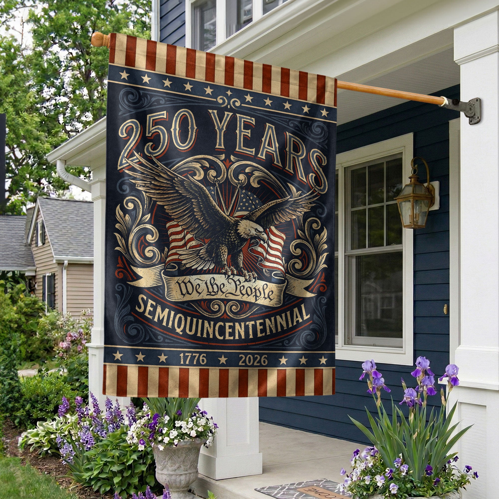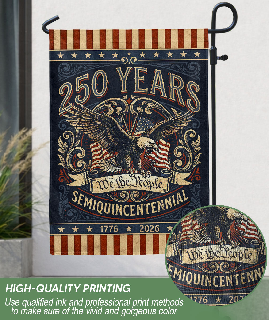 Celebrate America’s 250th anniversary from 1776 to 2026 with this retro house flag featuring the iconic ‘We The People’ text and a powerful bald eagle graphic. Double-sided printing ensures vibrant visibility from both sides, perfect for porches, patios, or gardens. Crafted with durable polyester fabric for weather resistance, this flag withstands wind, rain, and sun while maintaining its bold colors. The nostalgic design honors two and a half centuries of American strength and freedom. Easy to hang with reinforced grommets and sleeve. Ideal for patriots displaying national pride during Independence Day, Memorial Day, or year-round.