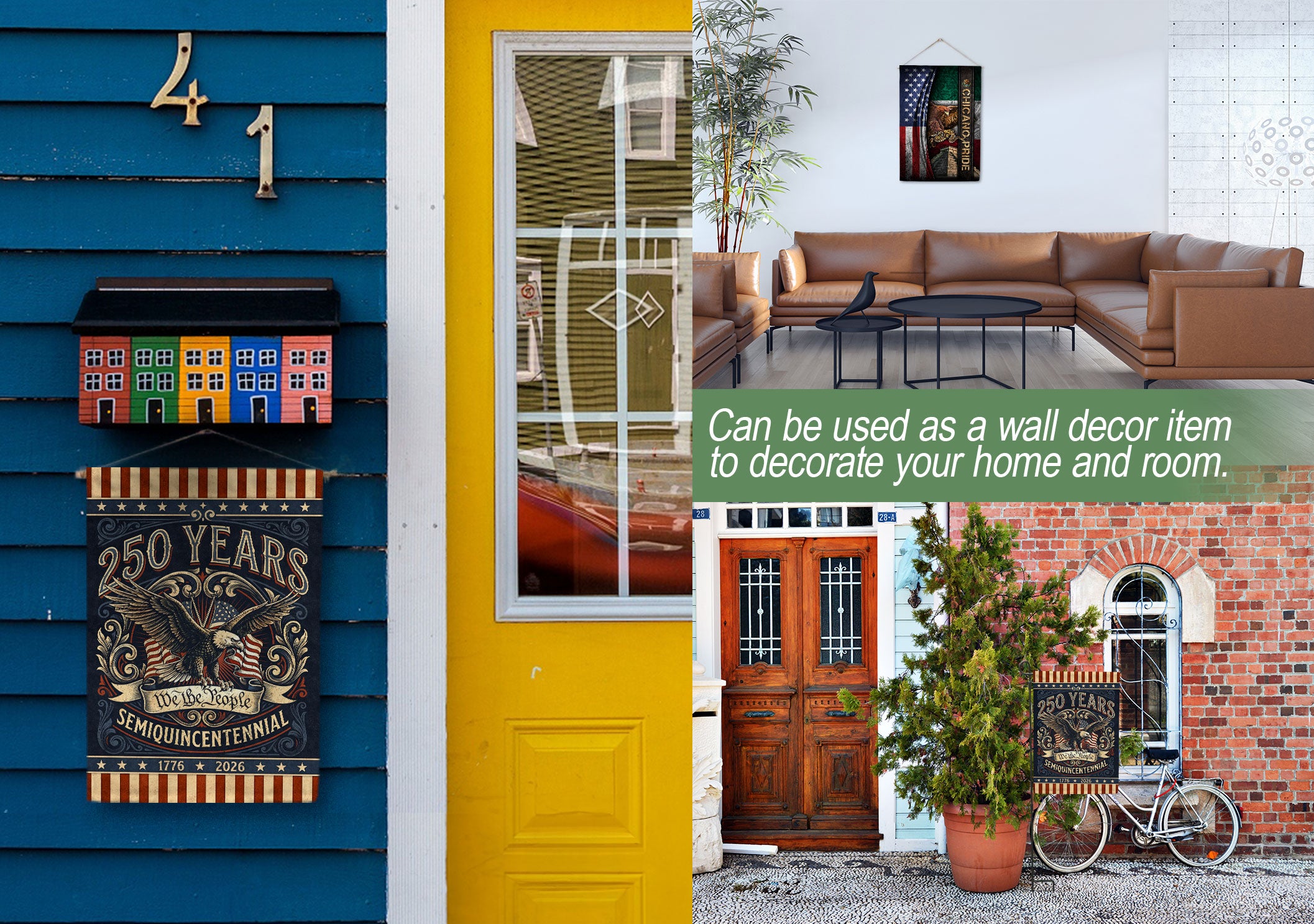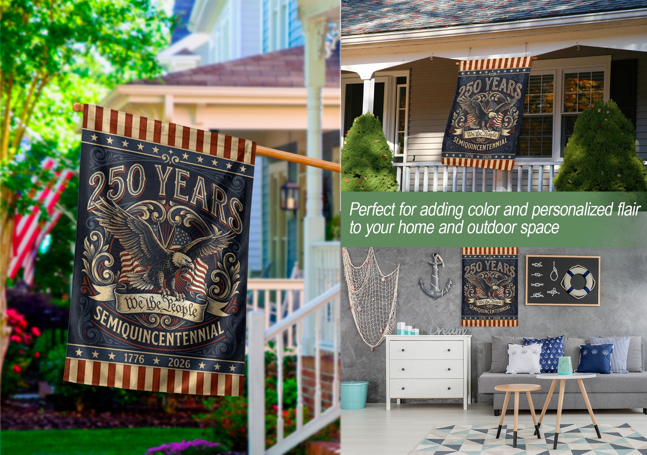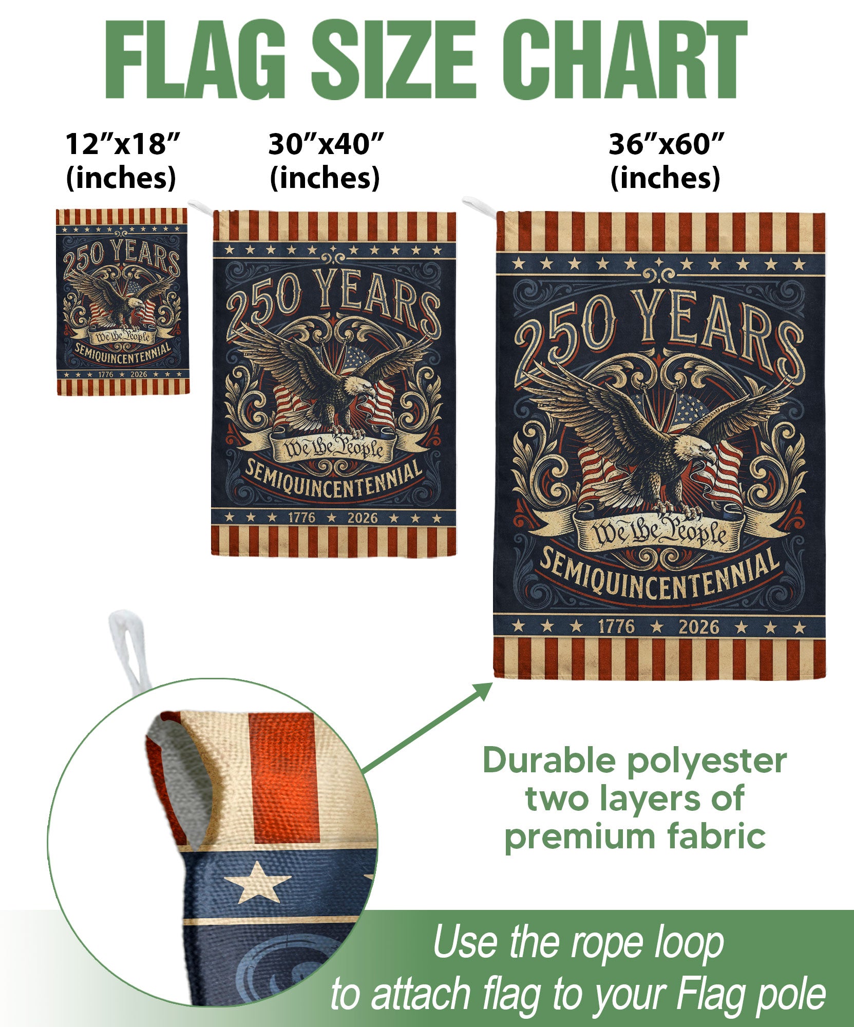 Celebrate America’s 250th anniversary from 1776 to 2026 with this retro house flag featuring the iconic ‘We The People’ text and a powerful bald eagle graphic. Double-sided printing ensures vibrant visibility from both sides, perfect for porches, patios, or gardens. Crafted with durable polyester fabric for weather resistance, this flag withstands wind, rain, and sun while maintaining its bold colors. The nostalgic design honors two and a half centuries of American strength and freedom. Easy to hang with reinforced grommets and sleeve. Ideal for patriots displaying national pride during Independence Day, Memorial Day, or year-round.