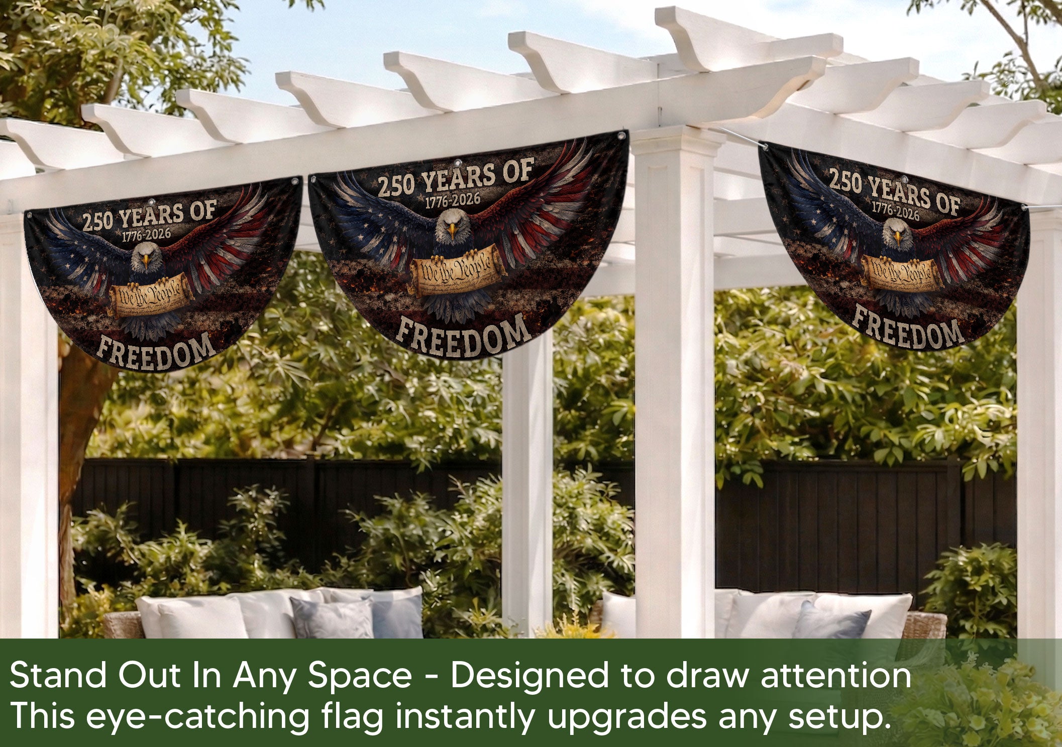 Celebrate America’s 250th anniversary with this vintage-style fence flag featuring a detailed American eagle graphic and vibrant patriotic colors. Spanning 1776-2026, this durable outdoor banner is designed for long-lasting display in gardens, patios, balconies, fences, or as holiday decorations. Crafted from weather-resistant polyester fabric with reinforced edges and a sturdy sleeve for easy attachment to flag poles or fences. Perfect for Independence Day, Memorial Day, Fourth of July, or everyday patriotic pride. Measures standard fence flag size for optimal visibility. Fade-resistant print ensures the bold red, white, and blue design stays sharp season after season. Easy to install and remove, making it ideal for seasonal events or permanent outdoor decor.