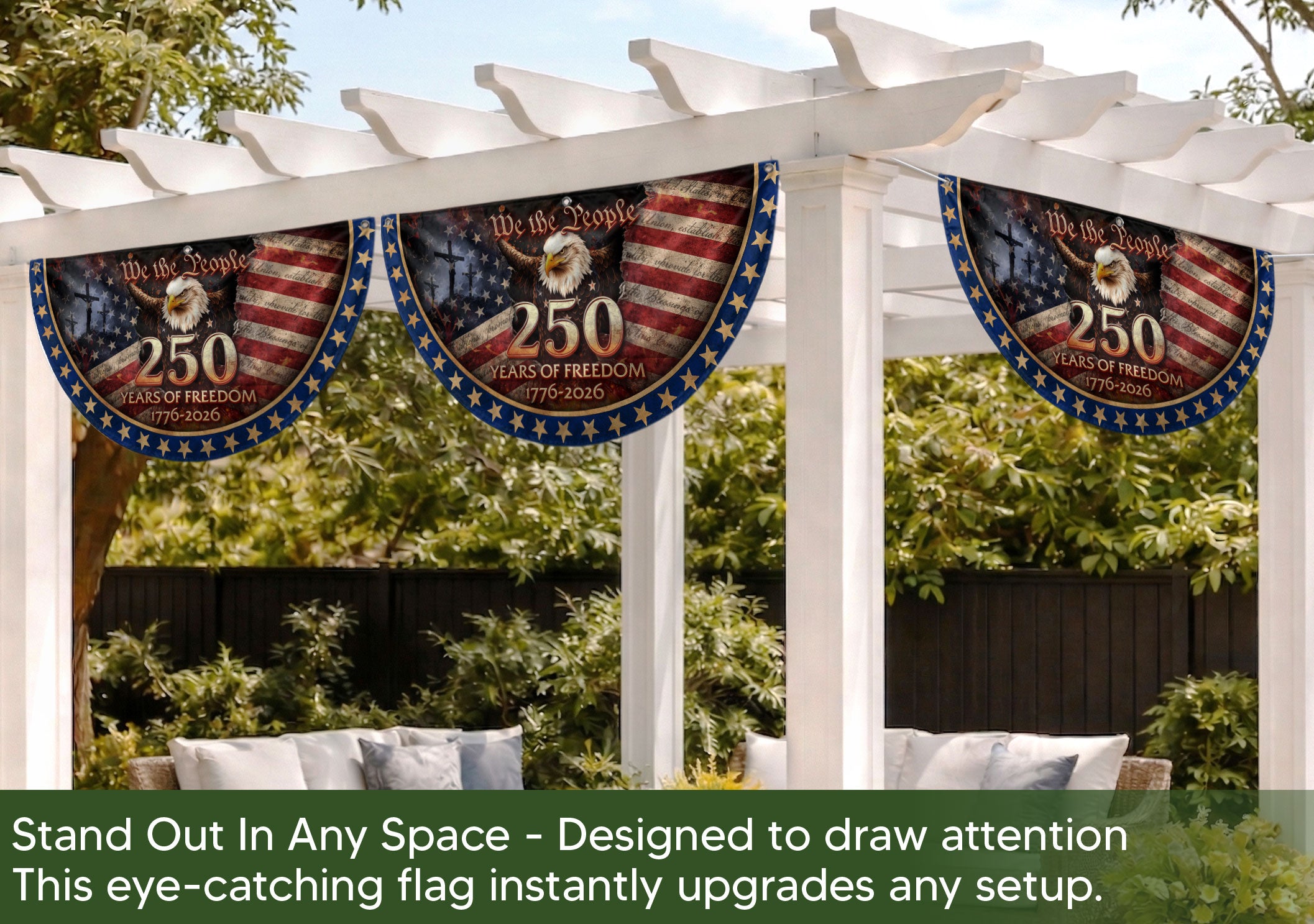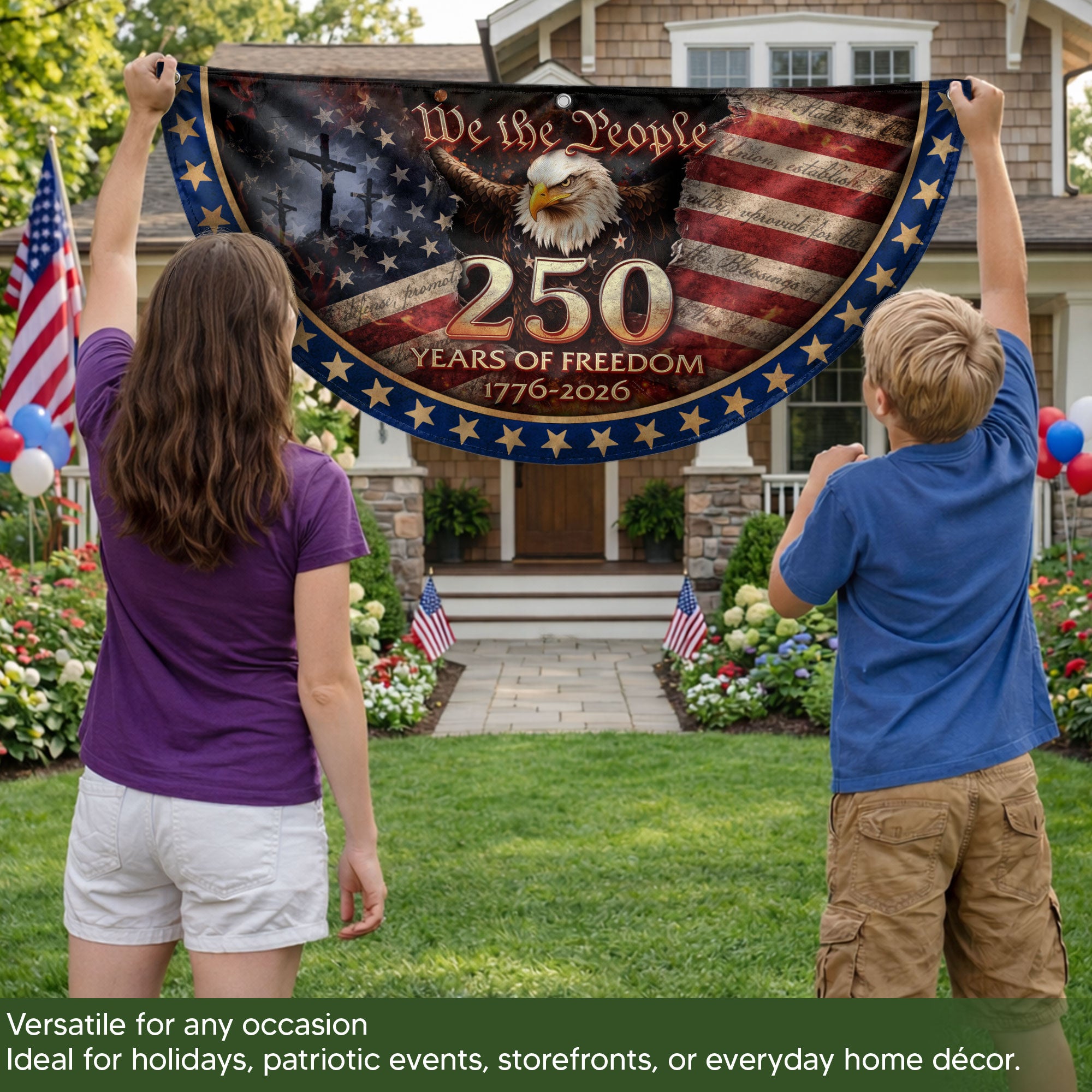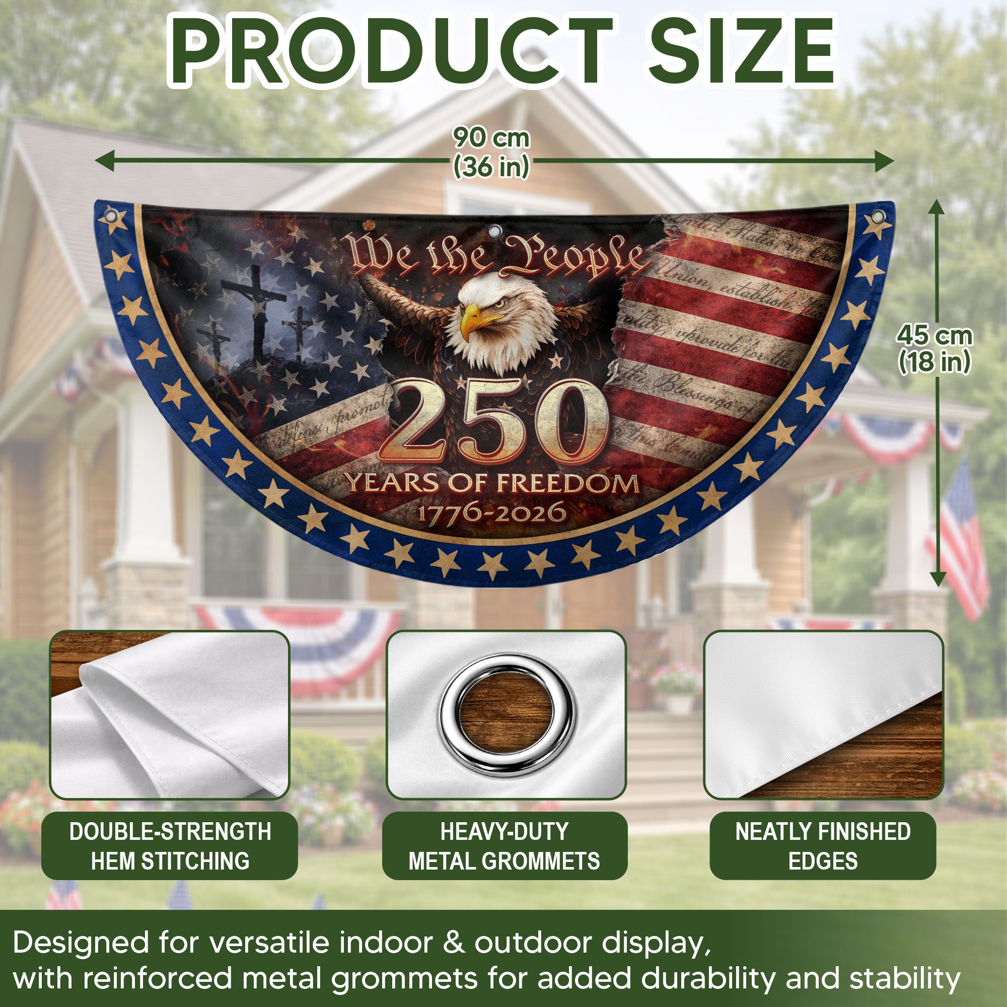 Celebrate the USA’s 250th anniversary from 1776 to 2026 with this patriotic fence flag banner. Featuring the iconic American flag design integrated with a prominent cross and the timeless ‘We The People’ inscription, this Christian patriotic banner symbolizes unity grounded in faith, freedom, and national pride. Perfect for displaying on fences, porches, or garden areas to honor America’s enduring spirit and shared beliefs. Crafted for outdoor durability, it withstands weather while proudly showcasing your patriotic values. Ideal for Independence Day, anniversaries, veterans’ events, or everyday display of American heritage.