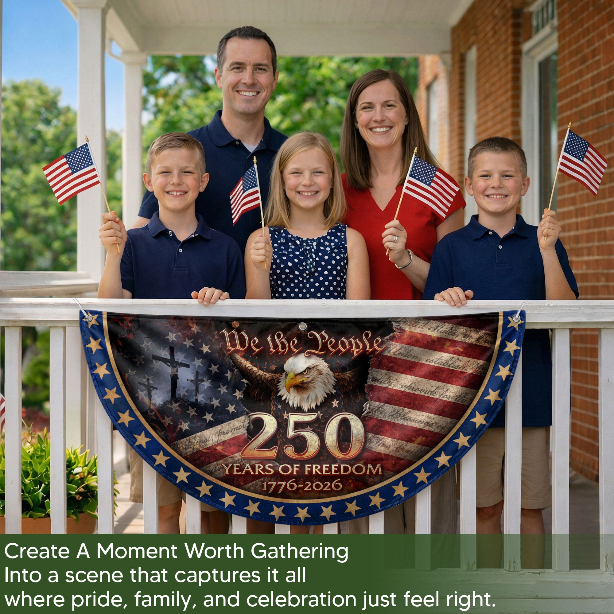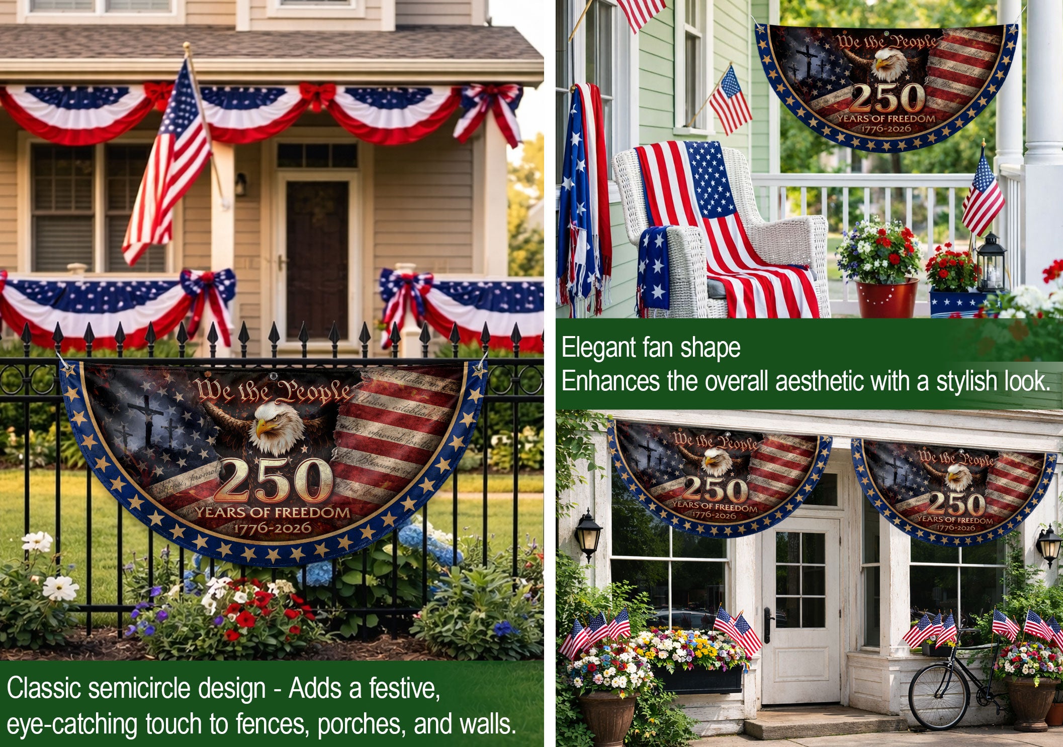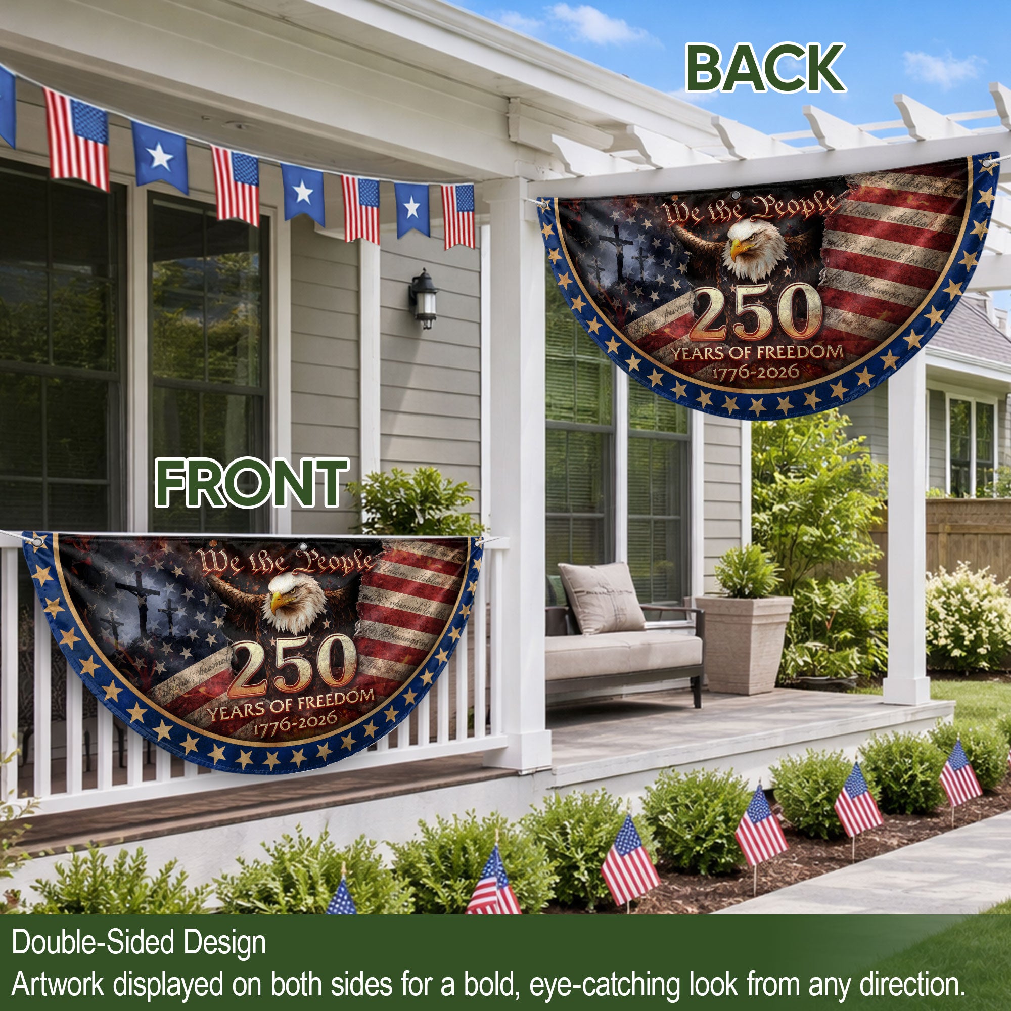 Celebrate the USA’s 250th anniversary from 1776 to 2026 with this patriotic fence flag banner. Featuring the iconic American flag design integrated with a prominent cross and the timeless ‘We The People’ inscription, this Christian patriotic banner symbolizes unity grounded in faith, freedom, and national pride. Perfect for displaying on fences, porches, or garden areas to honor America’s enduring spirit and shared beliefs. Crafted for outdoor durability, it withstands weather while proudly showcasing your patriotic values. Ideal for Independence Day, anniversaries, veterans’ events, or everyday display of American heritage.