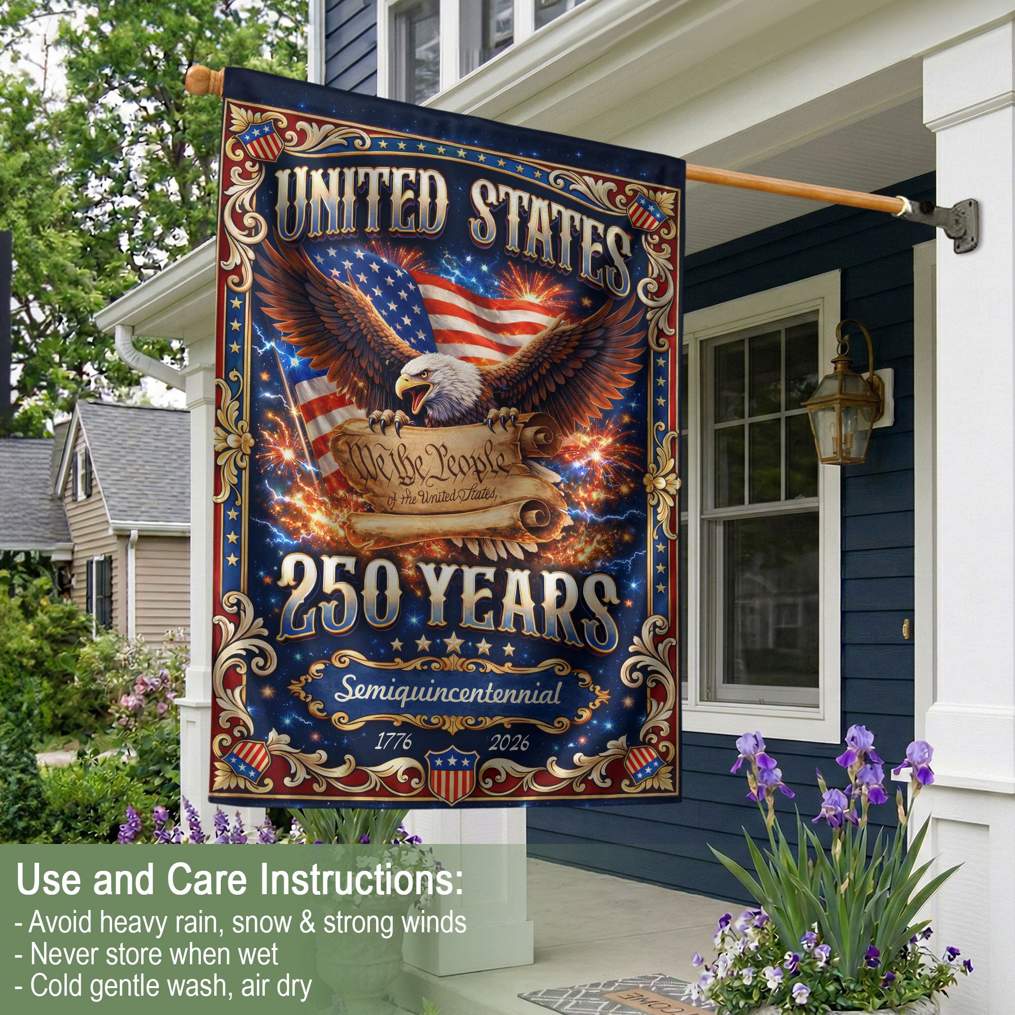 Celebrate America’s 250th anniversary from 1776 to 2026 with this double-sided garden flag featuring ‘We The People’ and Constitution-inspired imagery. Crafted for durability, this patriotic yard flag honors the principles that built the nation, symbolizing enduring liberty and freedom. Perfect for gardens, porches, or yards to display national pride. The high-quality, weather-resistant design ensures vibrant colors on both sides, making it ideal for holidays, Independence Day, or everyday patriotic displays.