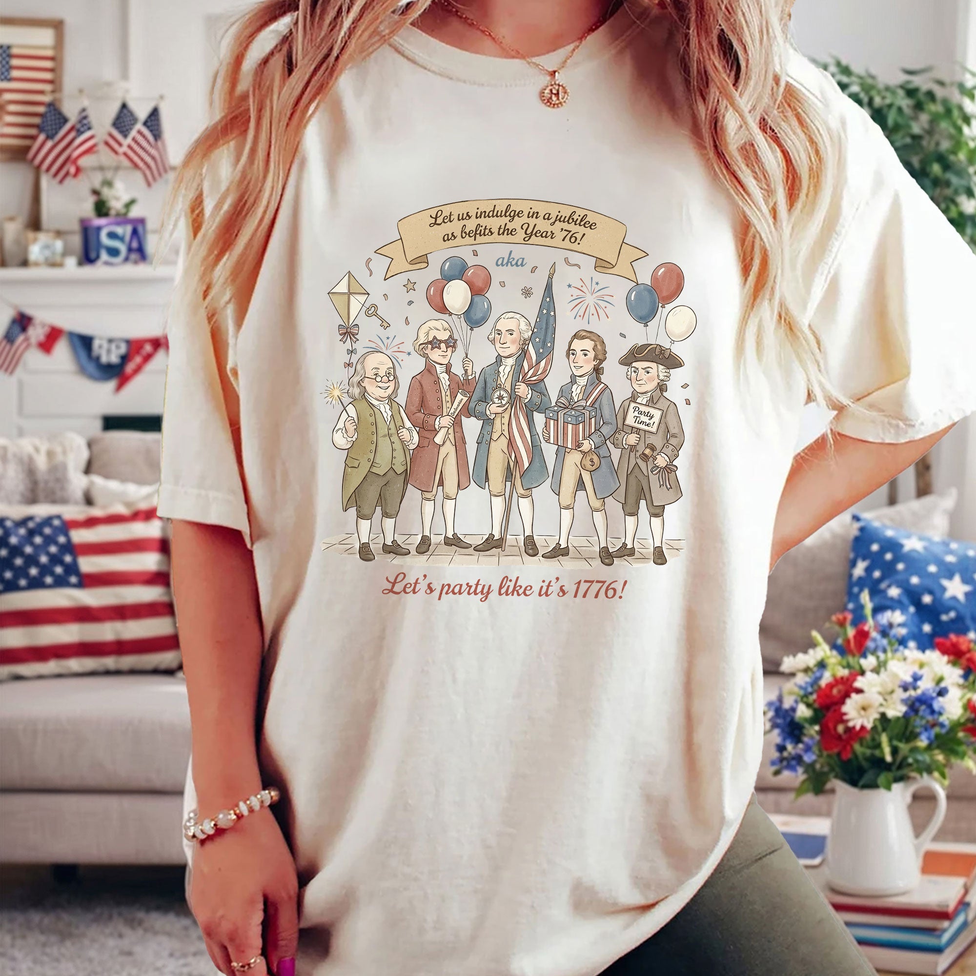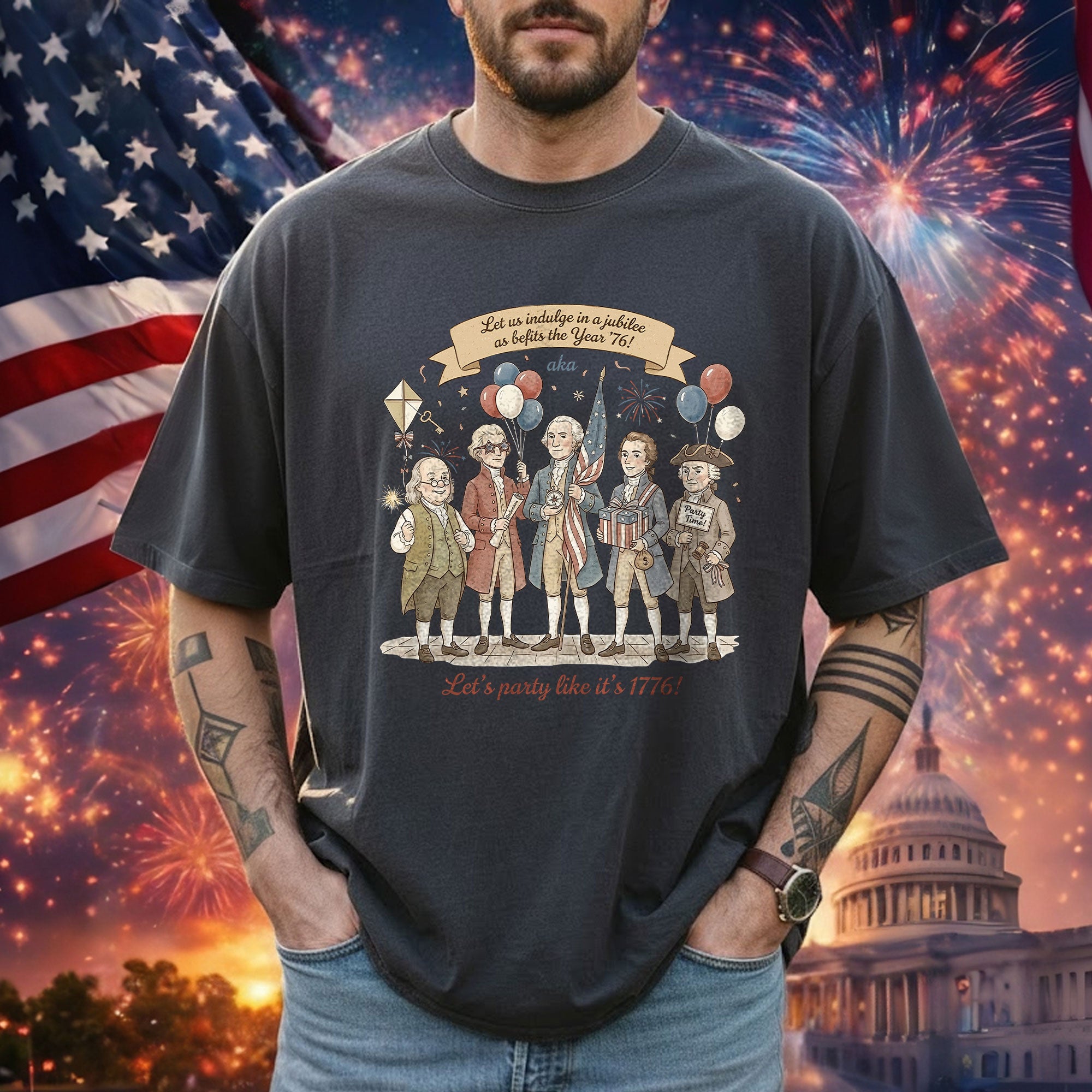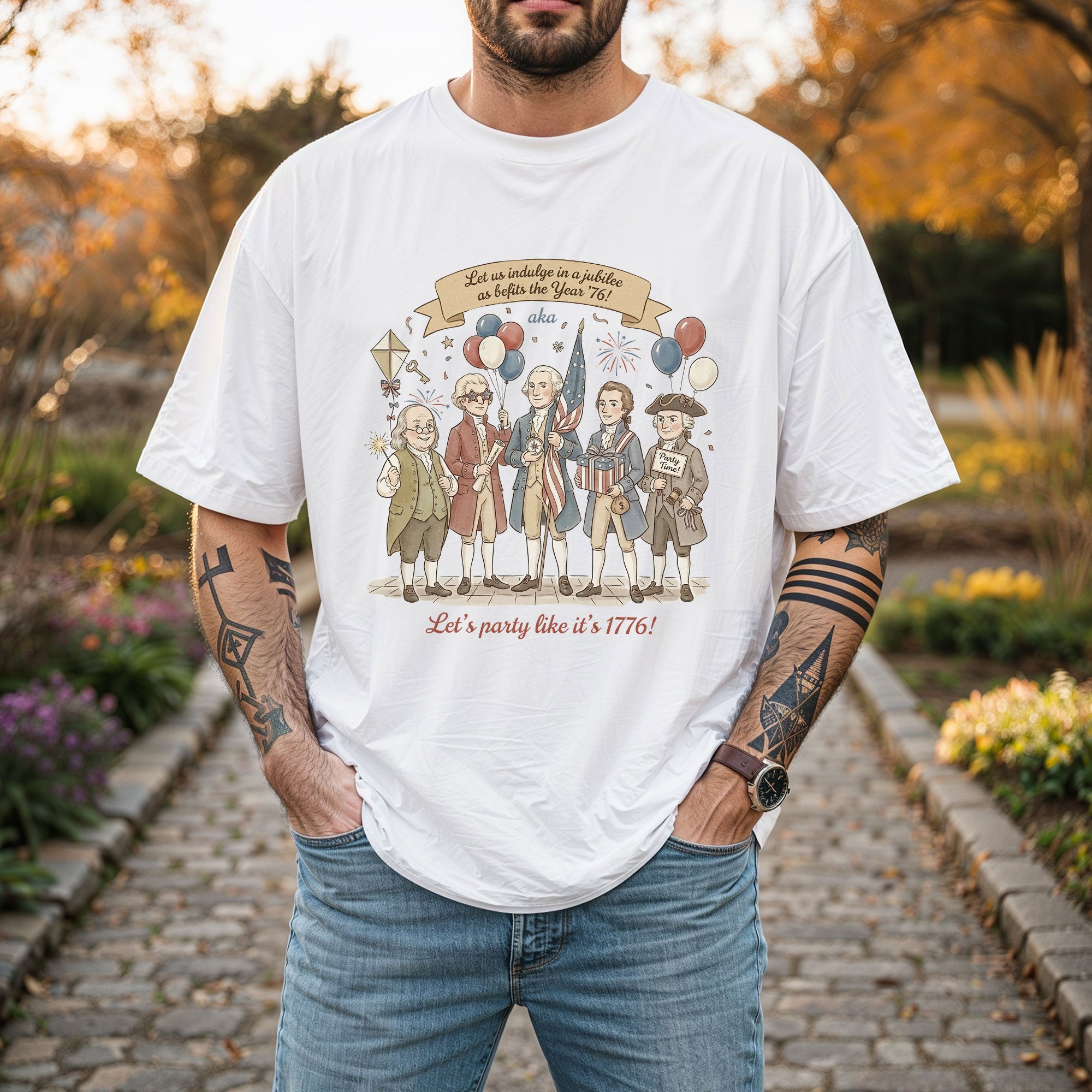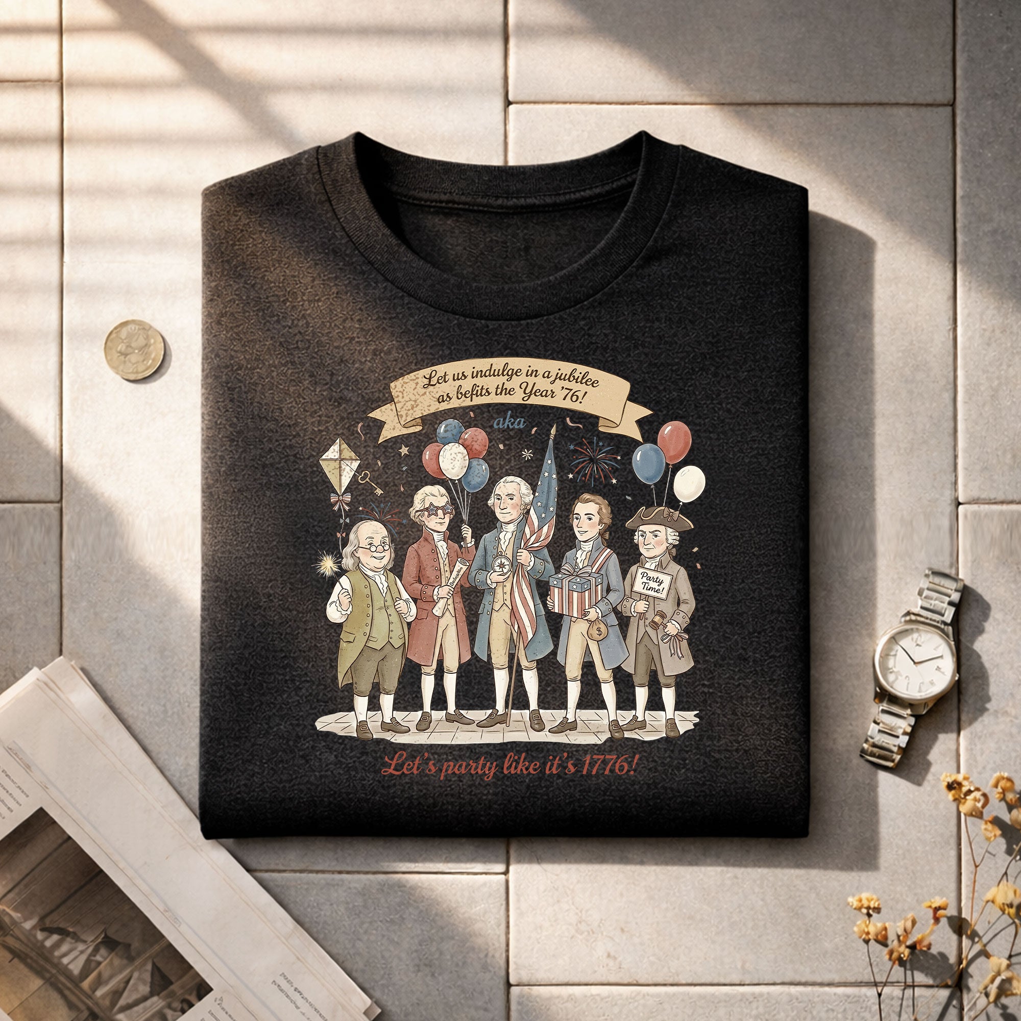 Celebrate American history and patriotism with this vintage-style funny Founding Fathers T-shirt featuring the iconic phrase “Let’s Party Like It’s 1776.” Crafted for comfort and durability, this retro tee showcases a distressed graphic print that captures the revolutionary spirit of 1776. Perfect for Independence Day celebrations, Fourth of July barbecues, historical reenactments, or casual everyday wear to show your USA pride. Ideal gift for history buffs, Constitution enthusiasts, and anyone who loves humorous patriotic apparel. Made from soft, breathable cotton blend fabric for all-day comfort. Available in multiple sizes for men, women, and unisex fit. Embrace the fun side of American independence with this unique graphic tee.