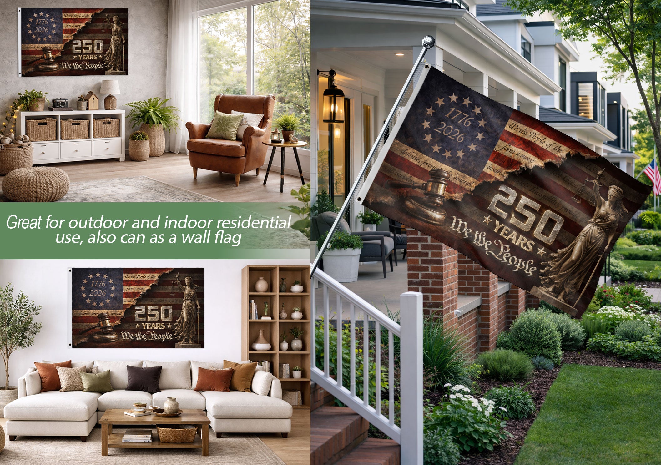 Celebrate 250 years of American liberty with the We The People Patriotic Lady Justice House Flag, commemorating the journey from 1776 to 2026. This striking outdoor decor flag features a powerful design honoring the nation’s foundations of freedom and justice. Crafted for durability, it withstands outdoor elements while proudly displaying patriotic symbolism including the iconic Lady Justice and We The People motto. Perfect for homes, porches, or gardens to showcase national pride during the 250th anniversary. Easy to hang with standard house flag poles, this flag serves as a timeless tribute to American history and values.