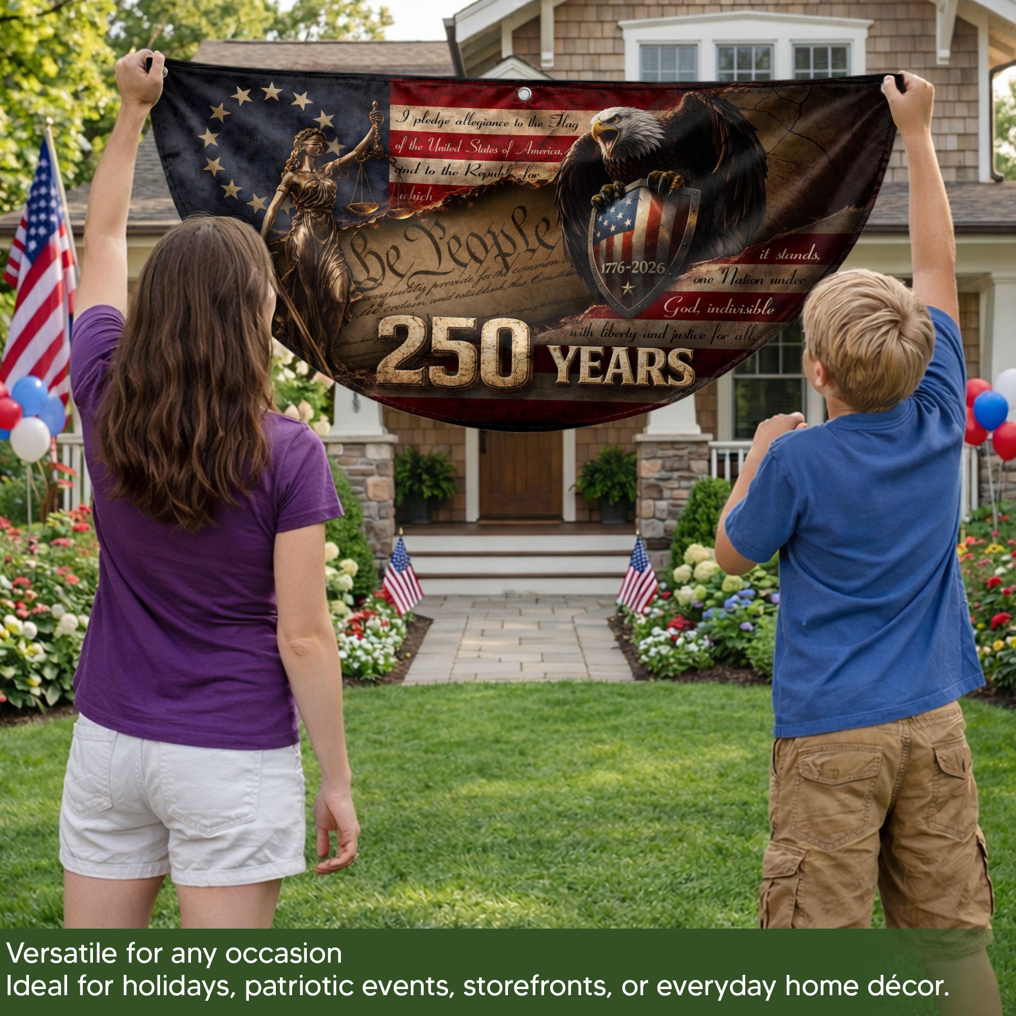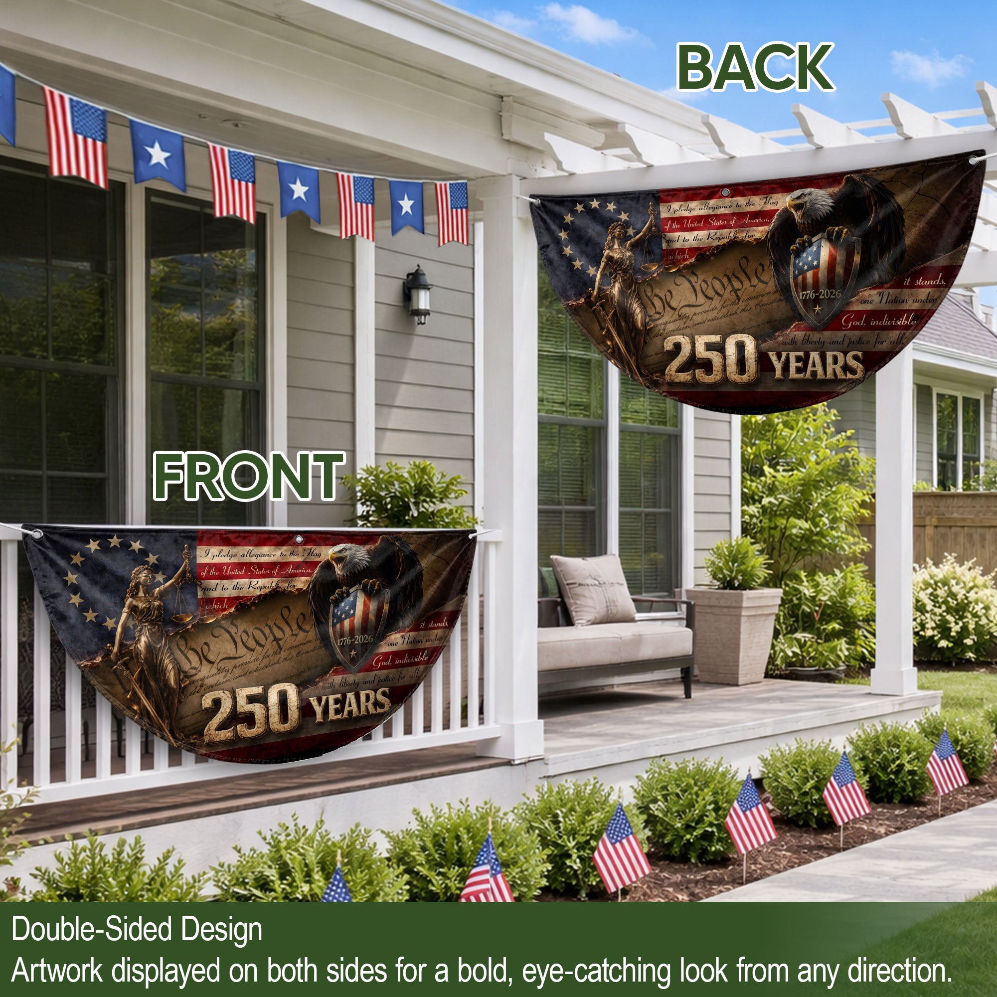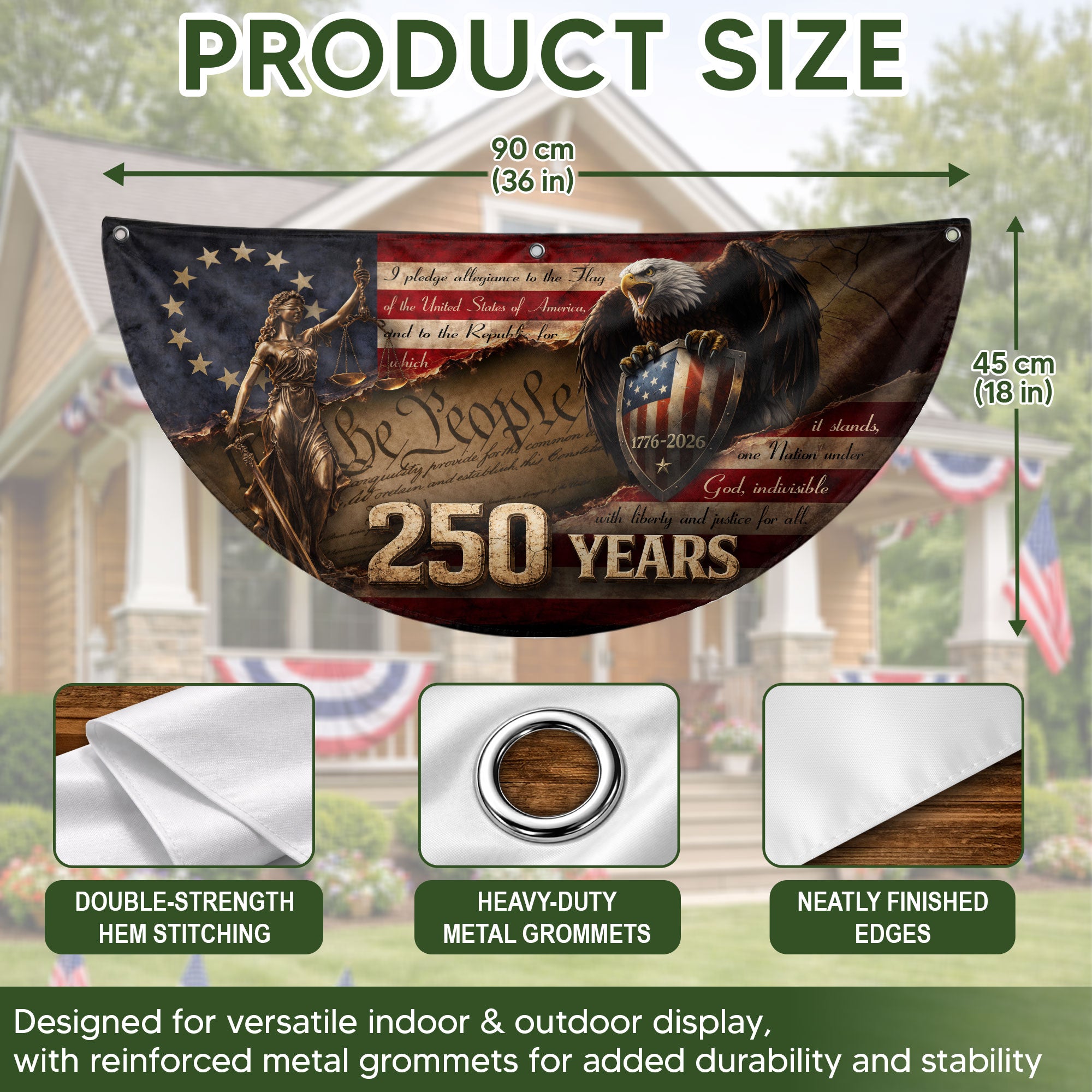 Celebrate America’s 250th anniversary with this premium fence flag featuring Lady Justice and a majestic bald eagle guarding a patriotic shield spanning 1776-2026. The design incorporates the full Pledge of Allegiance and the iconic ‘We The People’ preamble, boldly marked with ‘250 YEARS’. Perfect for fences, porches, or gardens to display American heritage and pride. Durable construction ensures vibrant colors and weather resistance for long-lasting outdoor display. Ideal for patriots honoring the nation’s historic milestone.