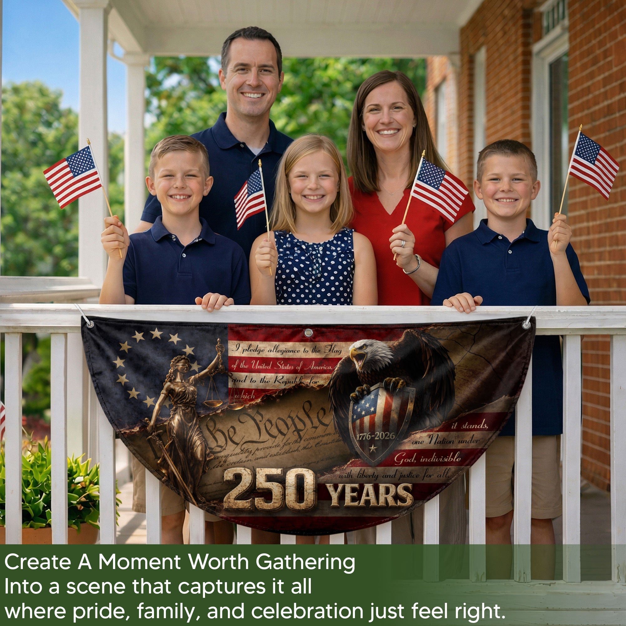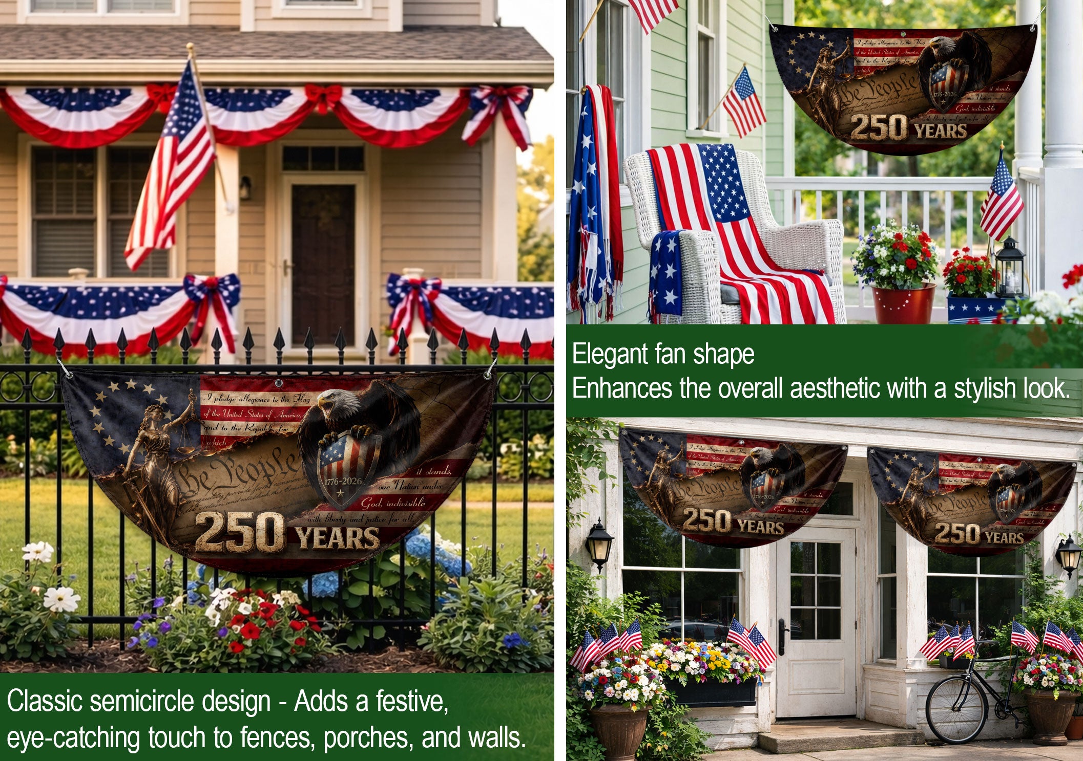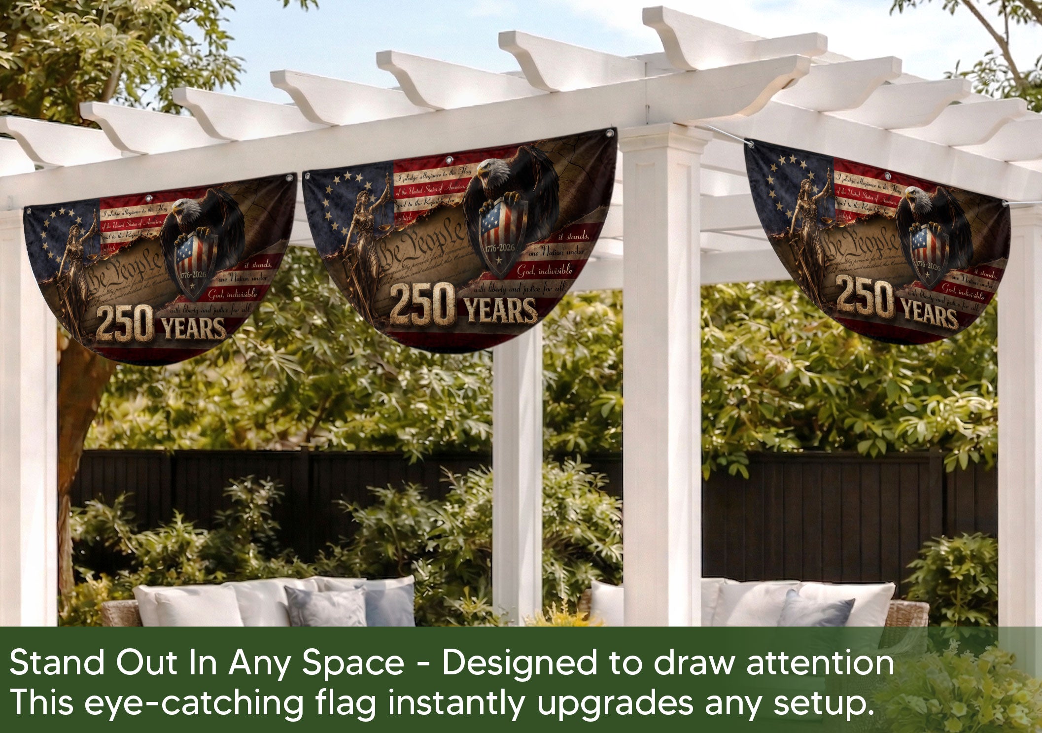 Celebrate America’s 250th anniversary with this premium fence flag featuring Lady Justice and a majestic bald eagle guarding a patriotic shield spanning 1776-2026. The design incorporates the full Pledge of Allegiance and the iconic ‘We The People’ preamble, boldly marked with ‘250 YEARS’. Perfect for fences, porches, or gardens to display American heritage and pride. Durable construction ensures vibrant colors and weather resistance for long-lasting outdoor display. Ideal for patriots honoring the nation’s historic milestone.